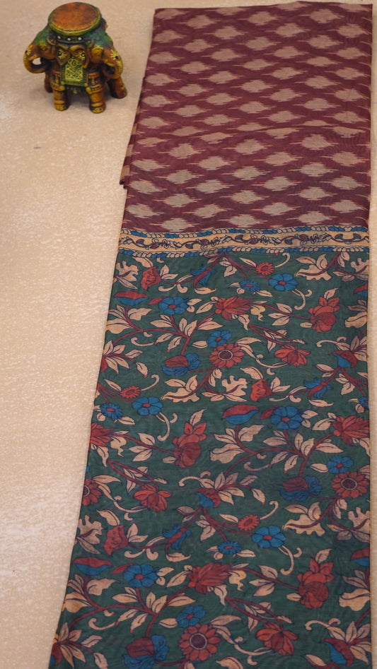 Chanderi Saree Ikkatkari Print - Green & Maroon