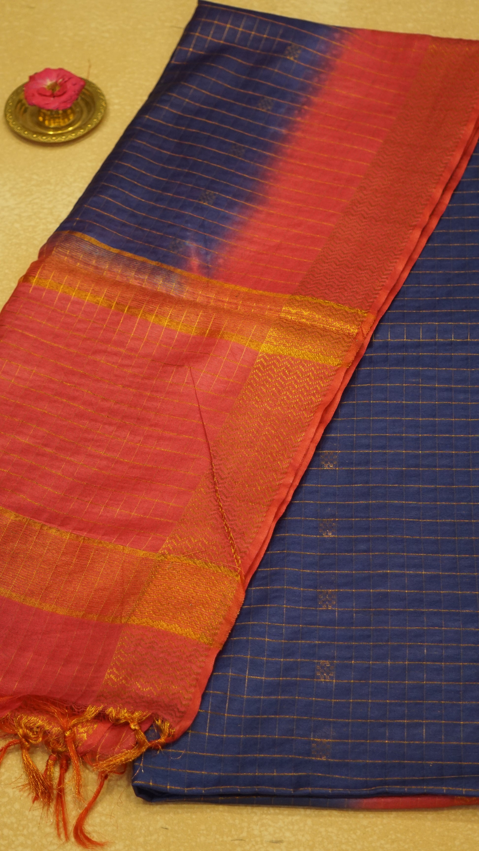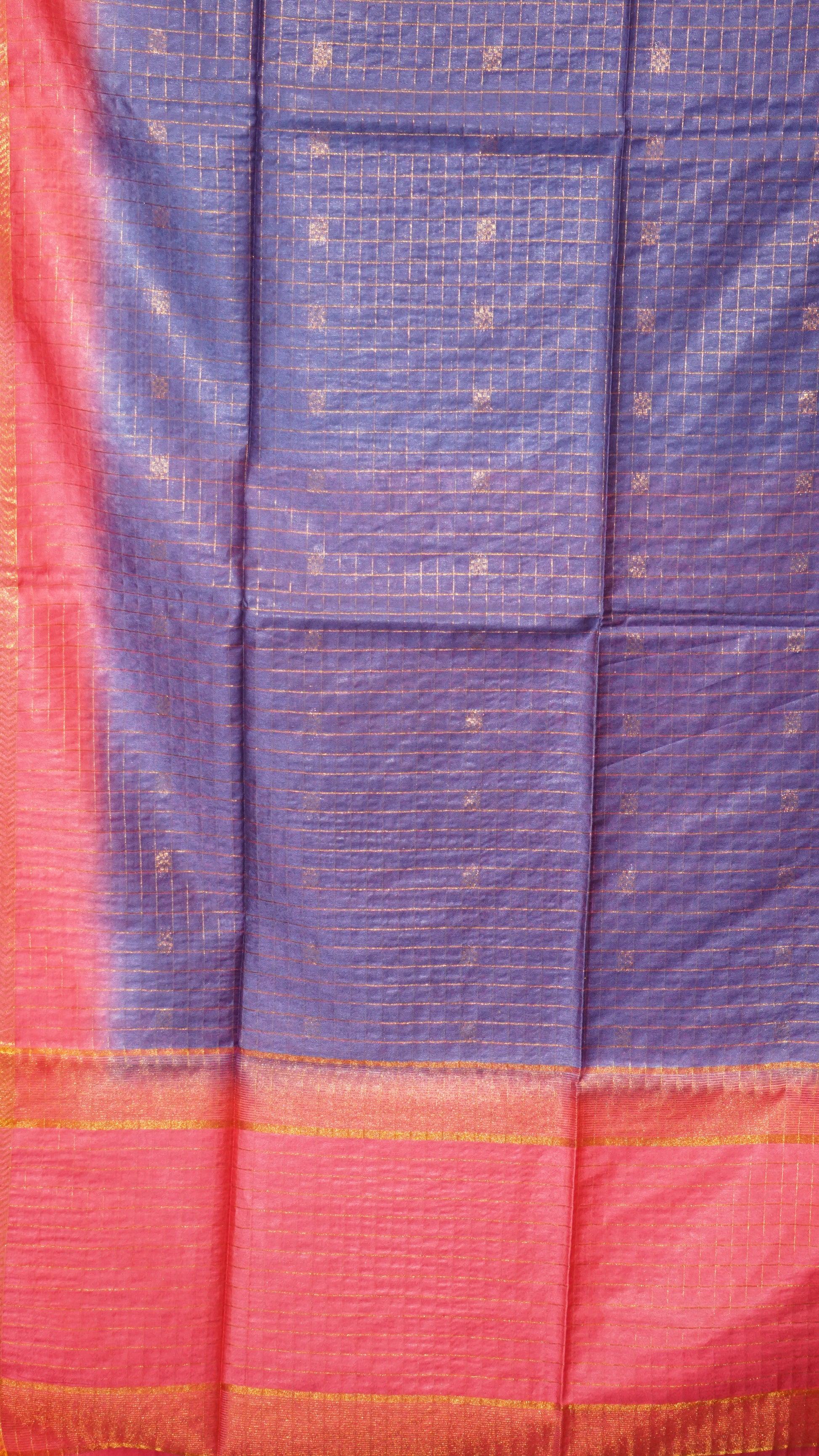 Bhagalpur Tussar Saree Checks - Blue & Pink