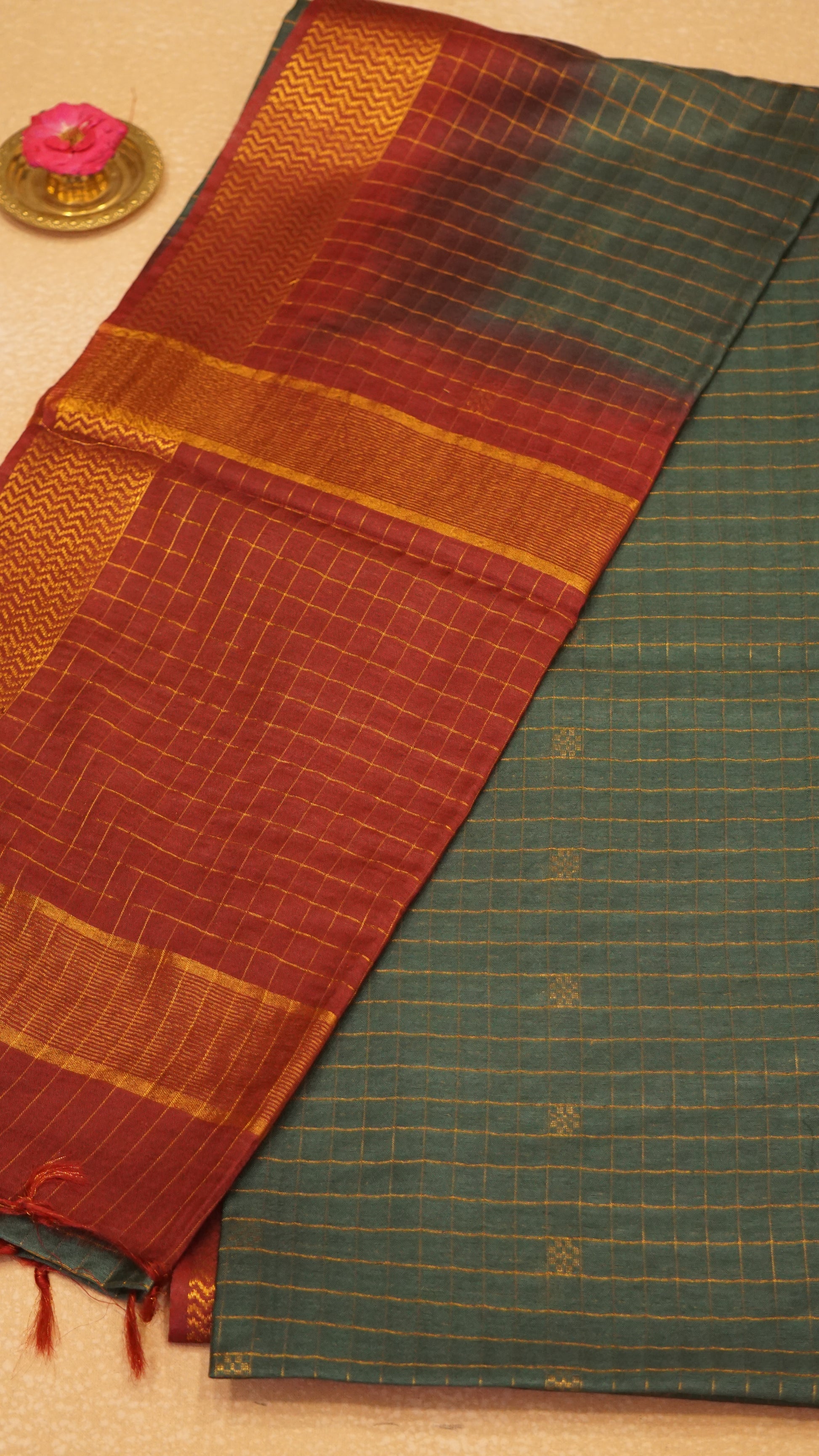 Bhagalpur Tussar Saree Checks - Bottle Green & Maroon