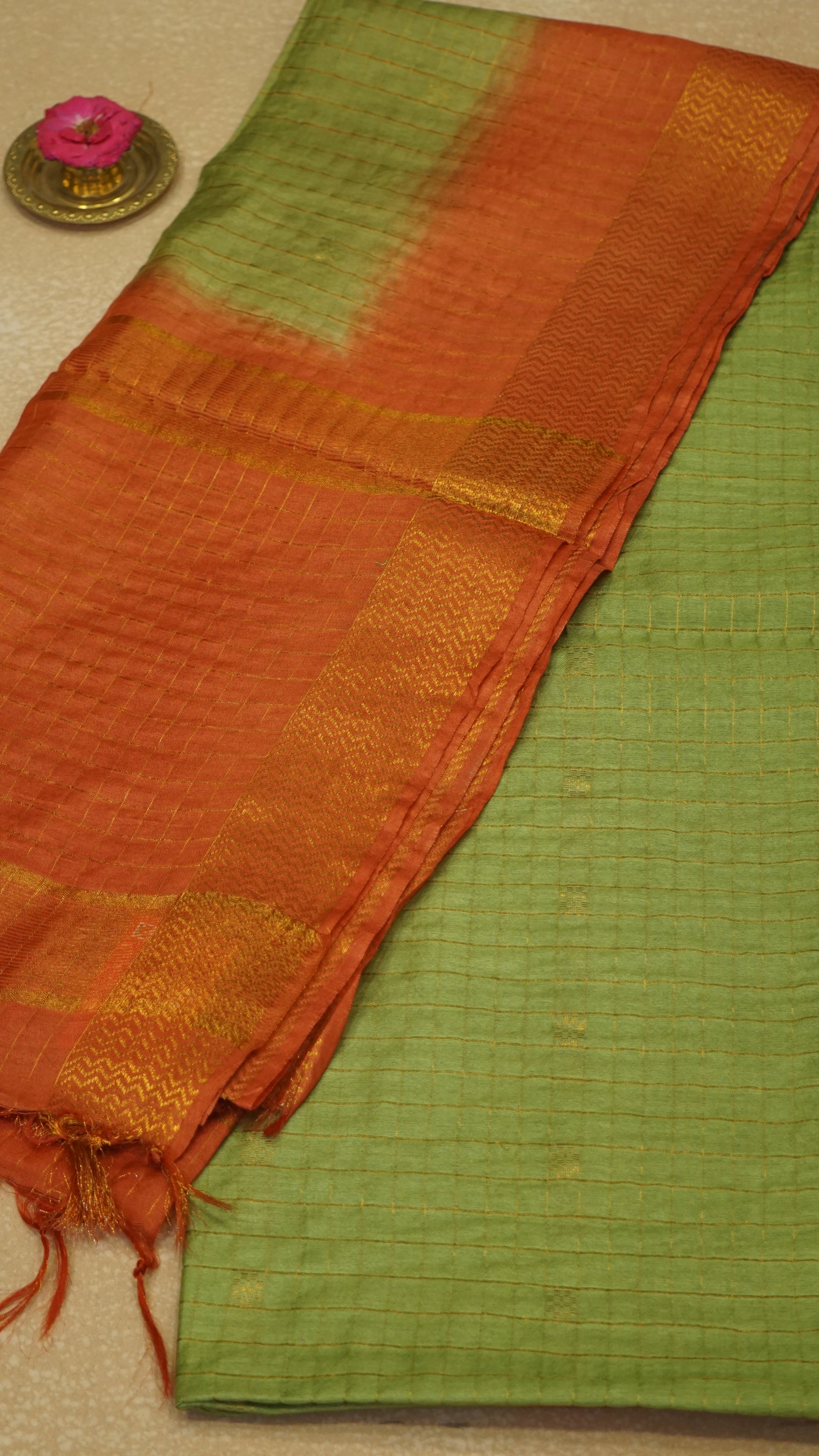 Bhagalpur Tussar Saree Checks - Light Green & Orange