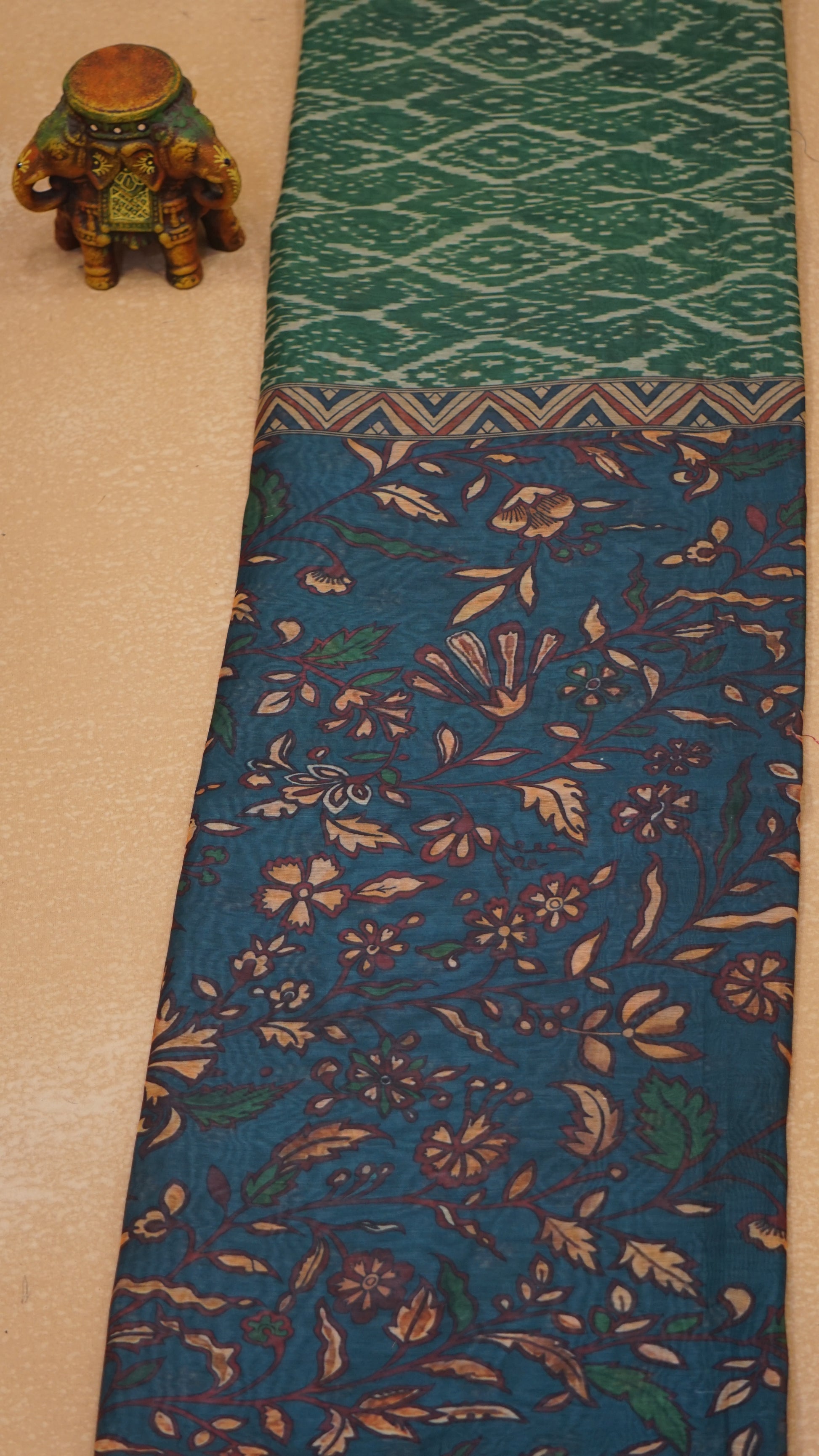 Chanderi Saree Ikkatkari Print - Teal Blue & Green