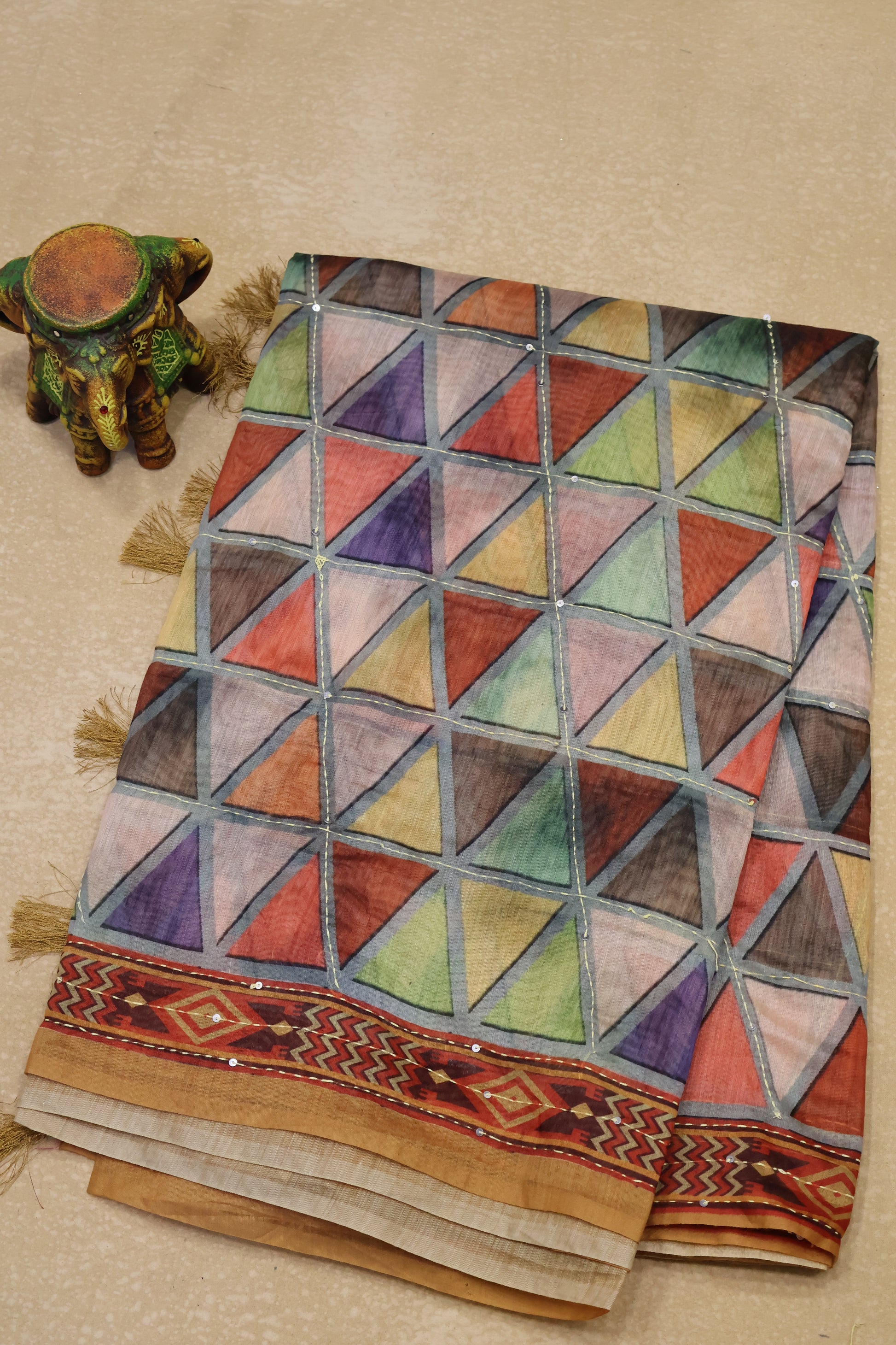 Chanderi Saree Kantha Work -Mustard Colorful Triangle