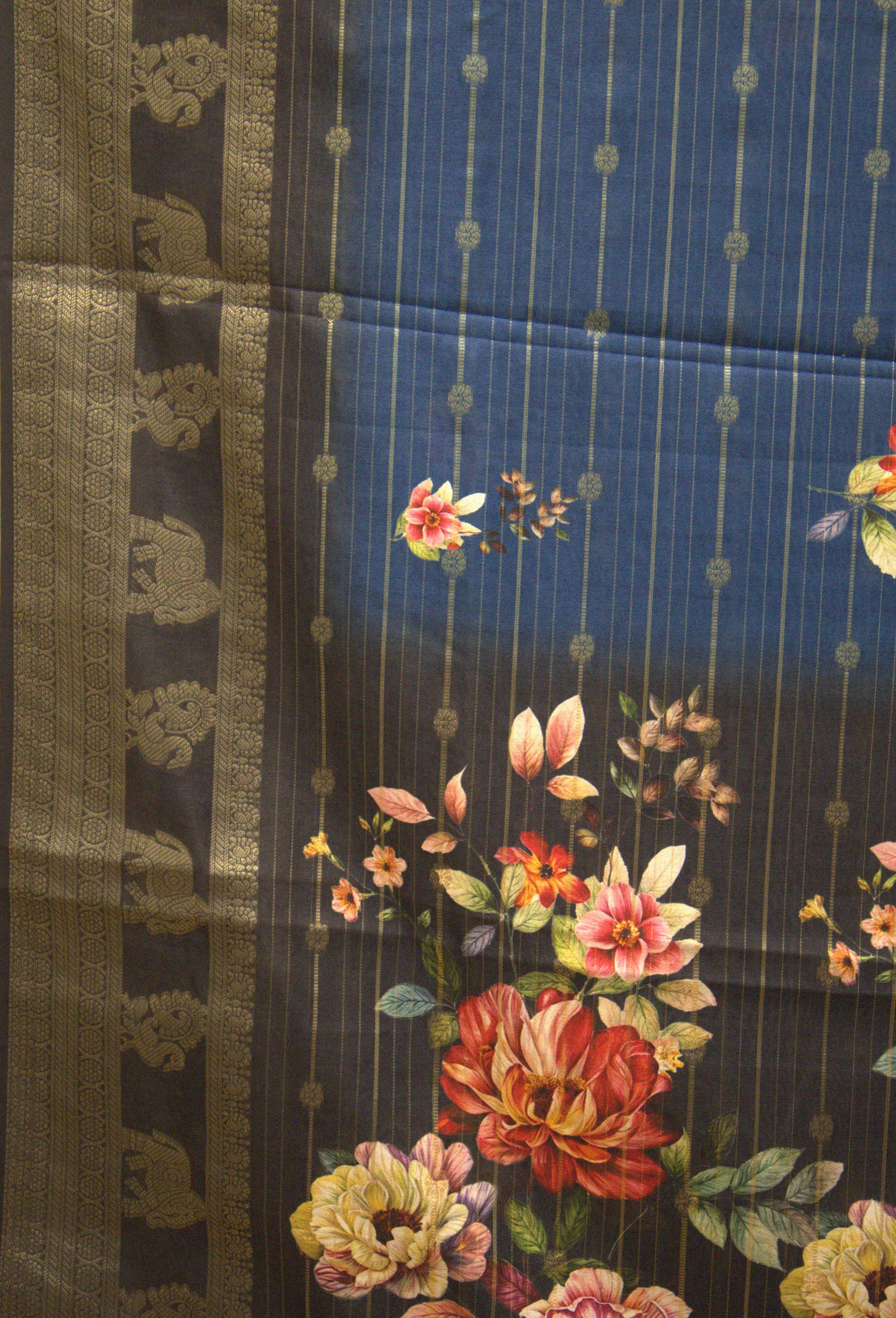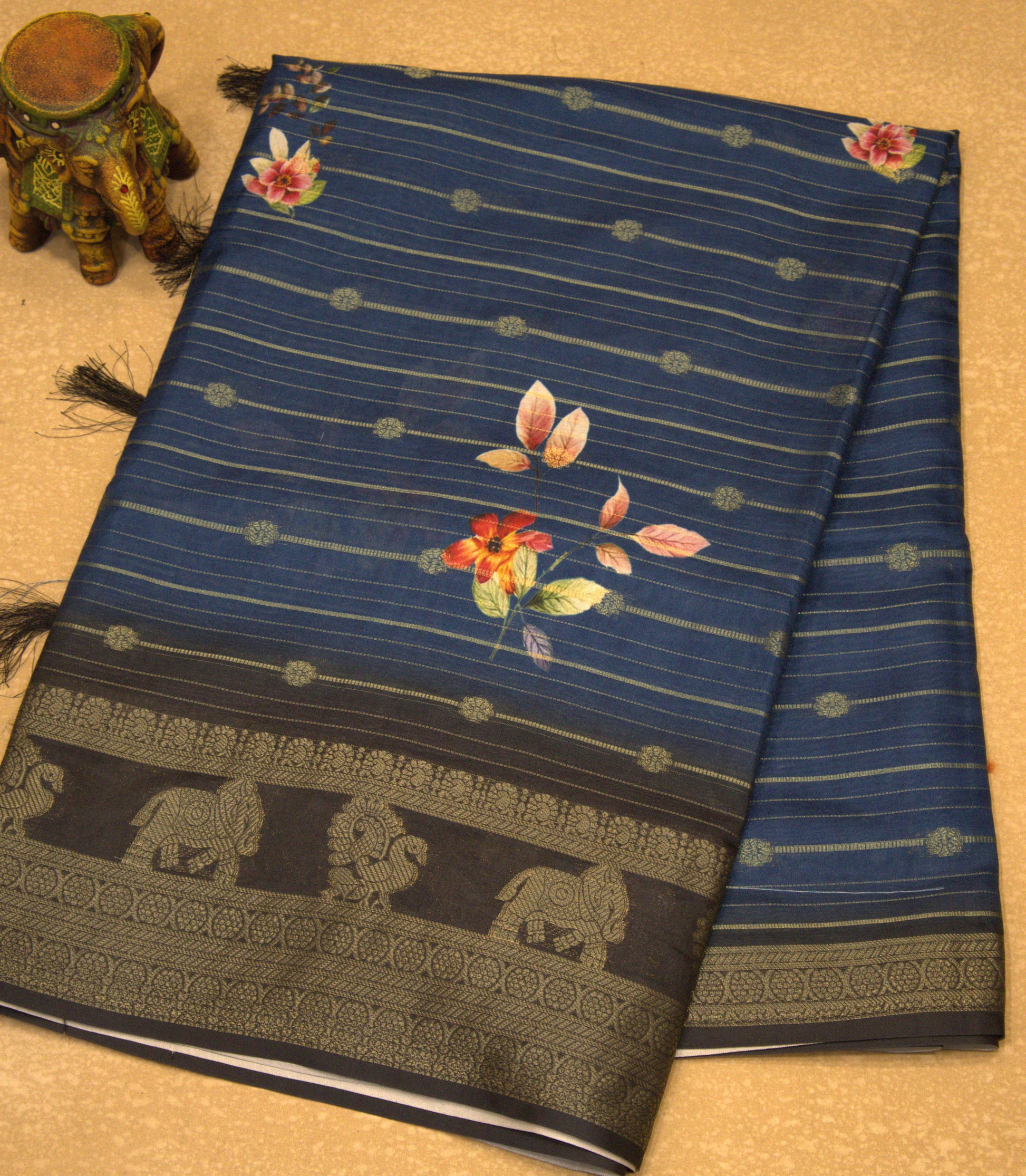 Dola Silk Saree - Pecok Blue Floral Flower Line