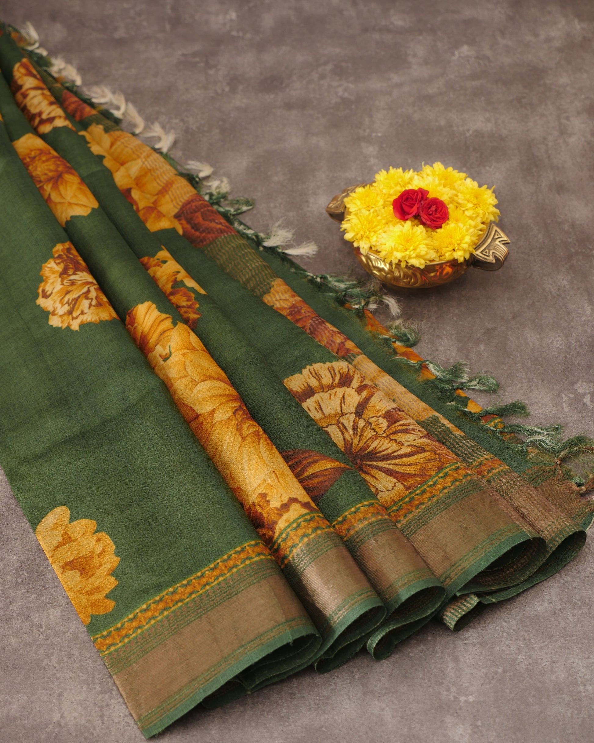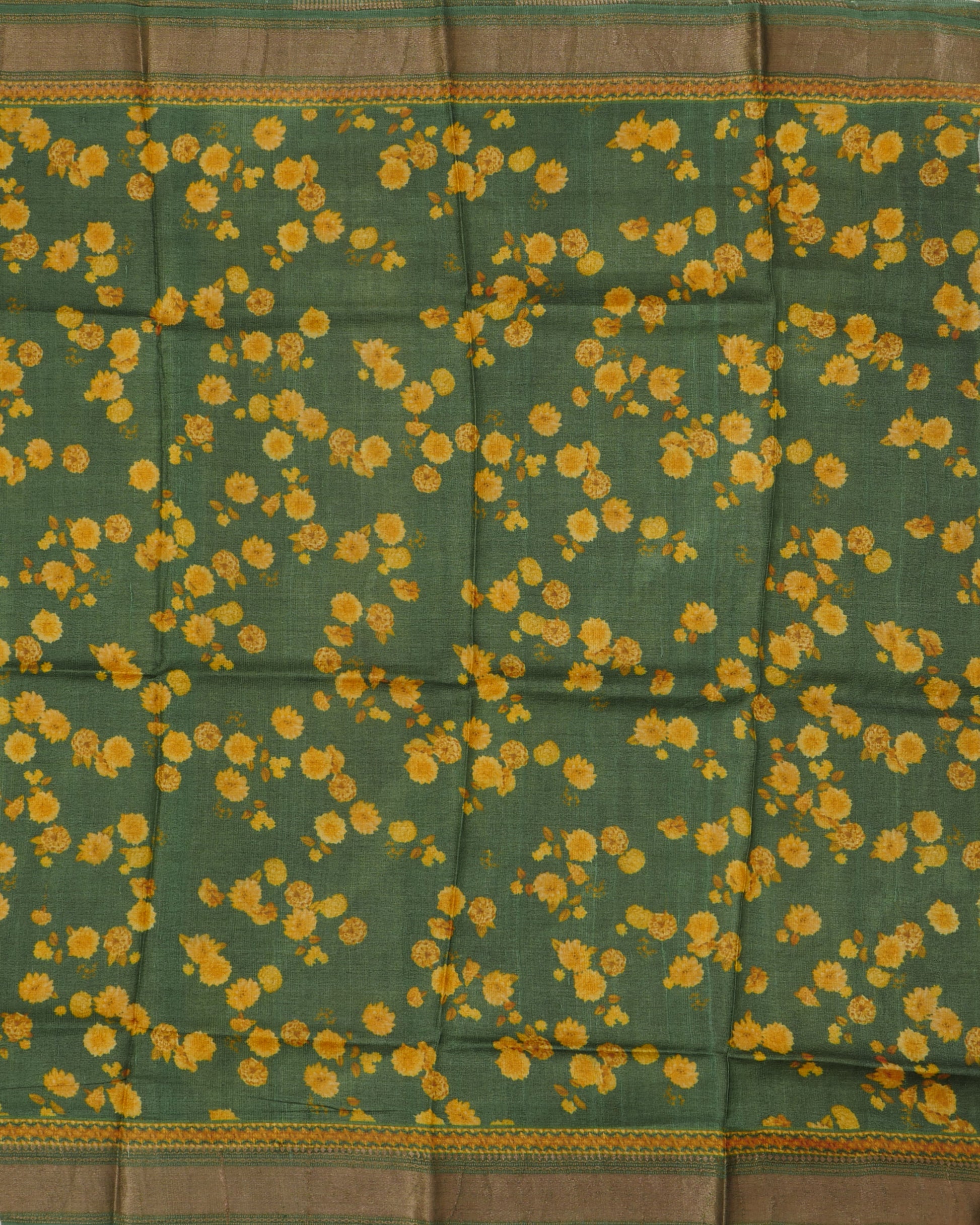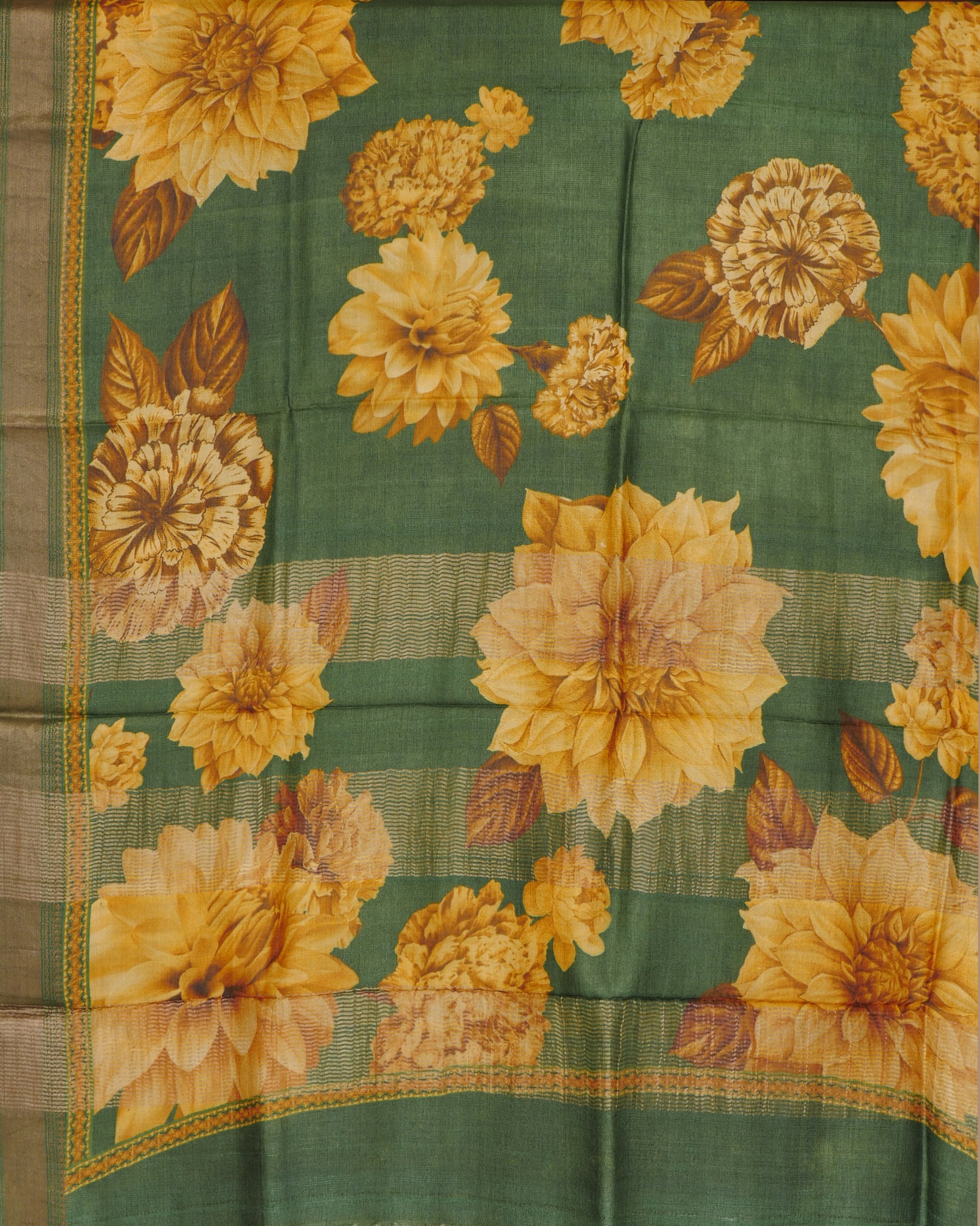 Pure Tussar Green Floral Print and Self Pallu with Zari Woven Border