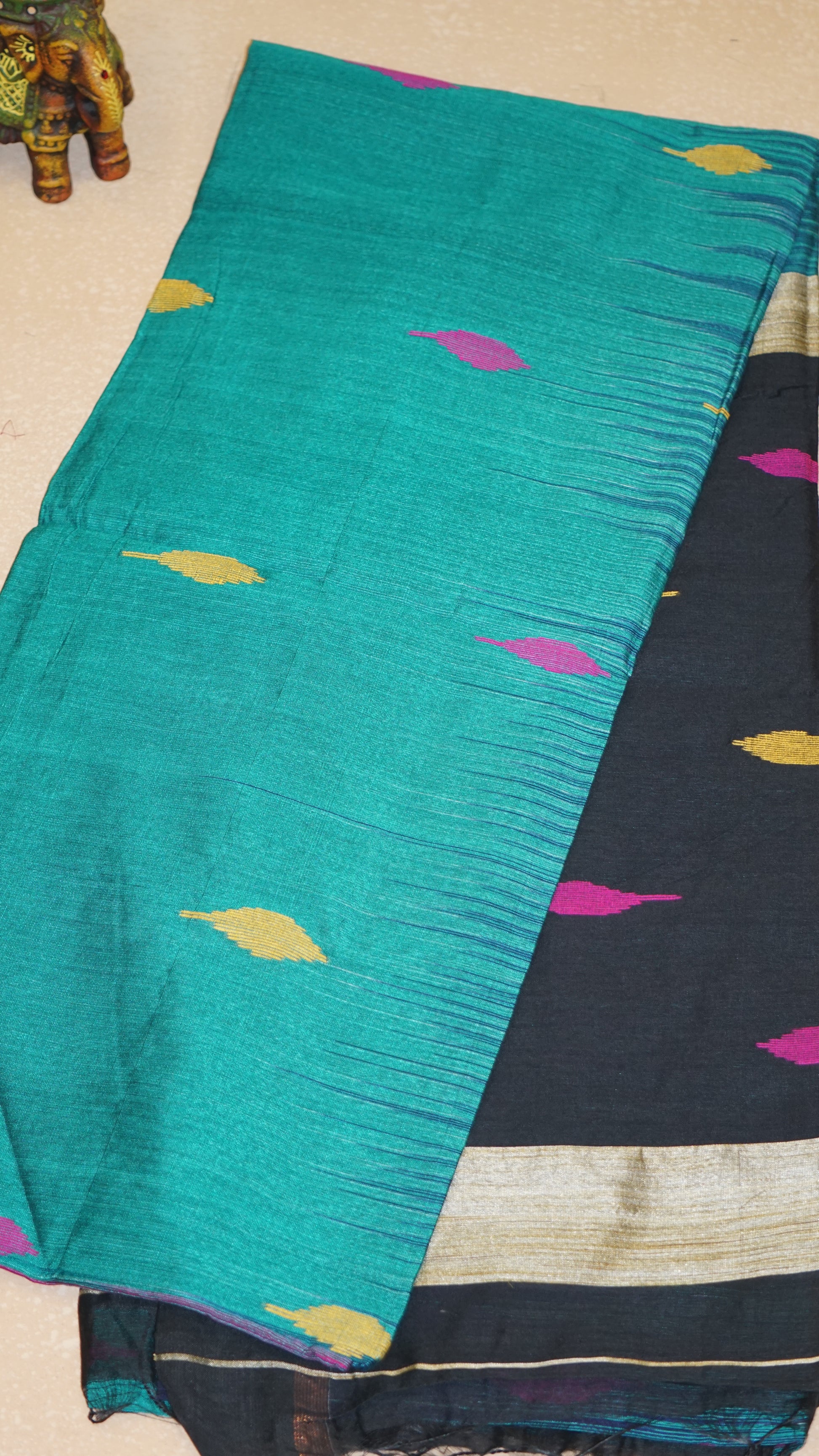 Handloom Cotton Saree - Green and Blue Blend & Black