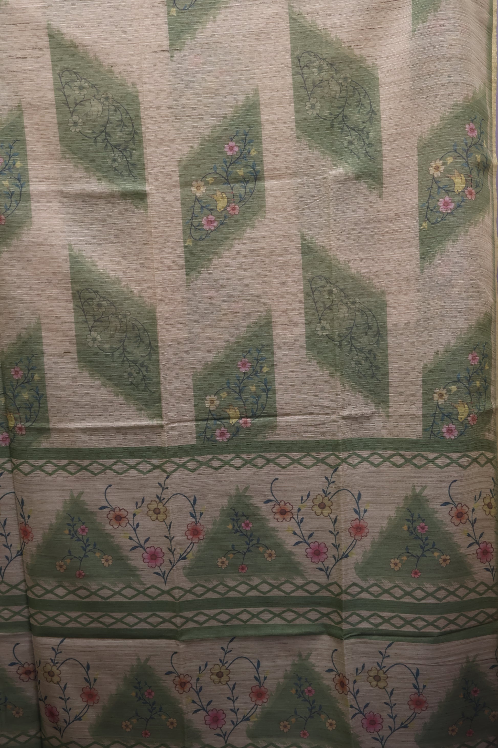 Jute Tussar Saree-Green Sparrow Floral Pattern
