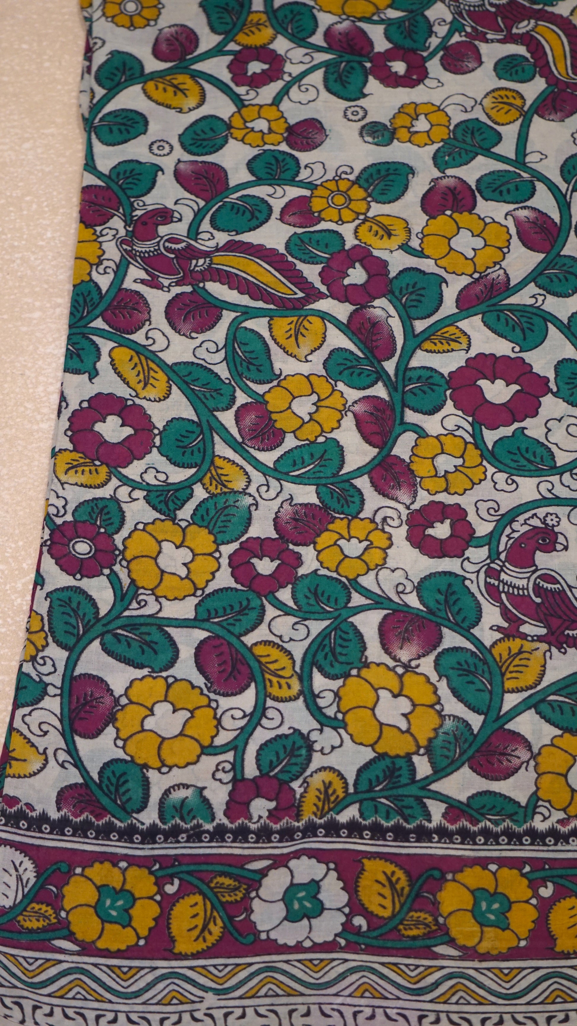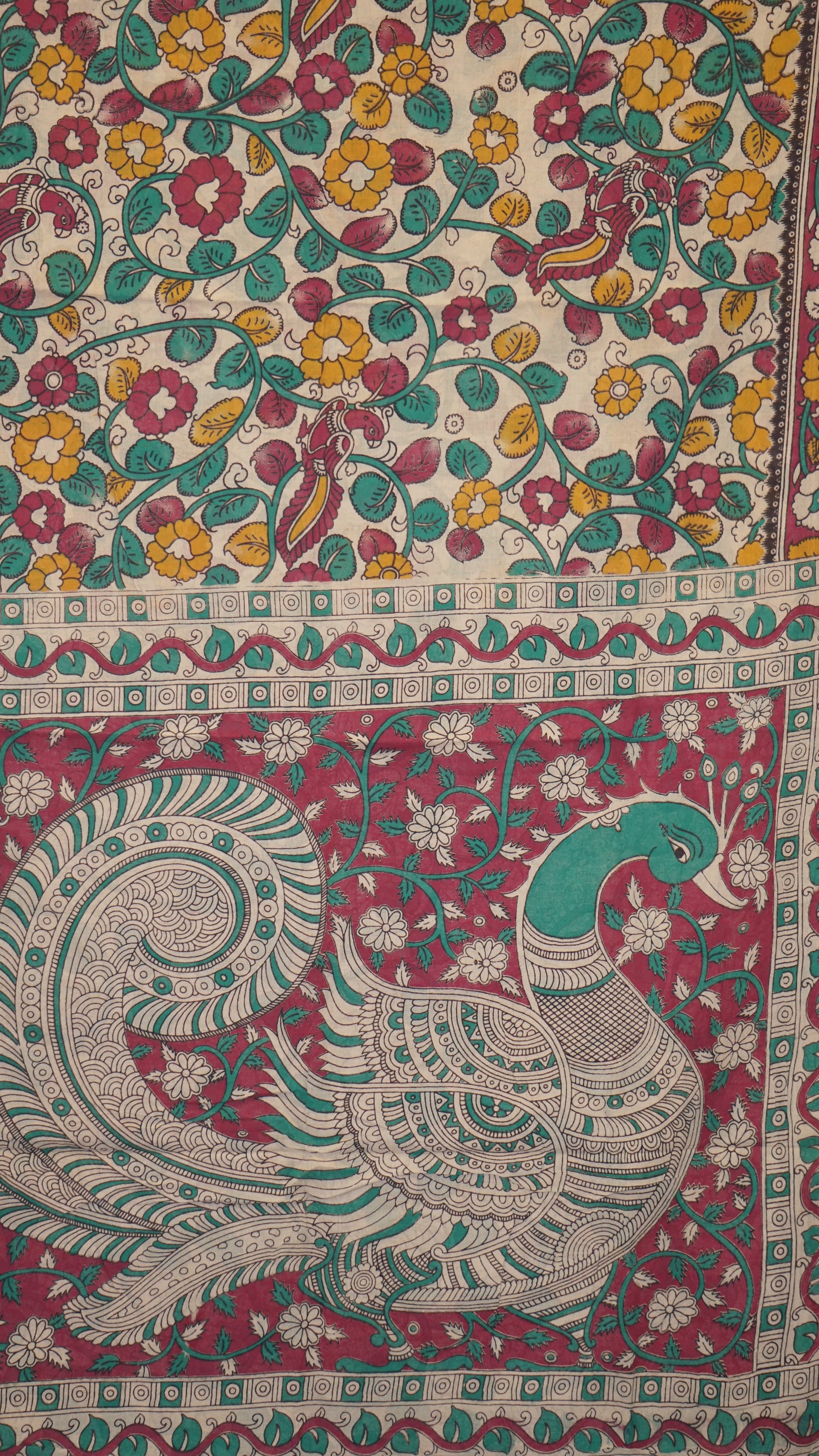Kalamkari Saree Cotton - Beige With Magenta Border