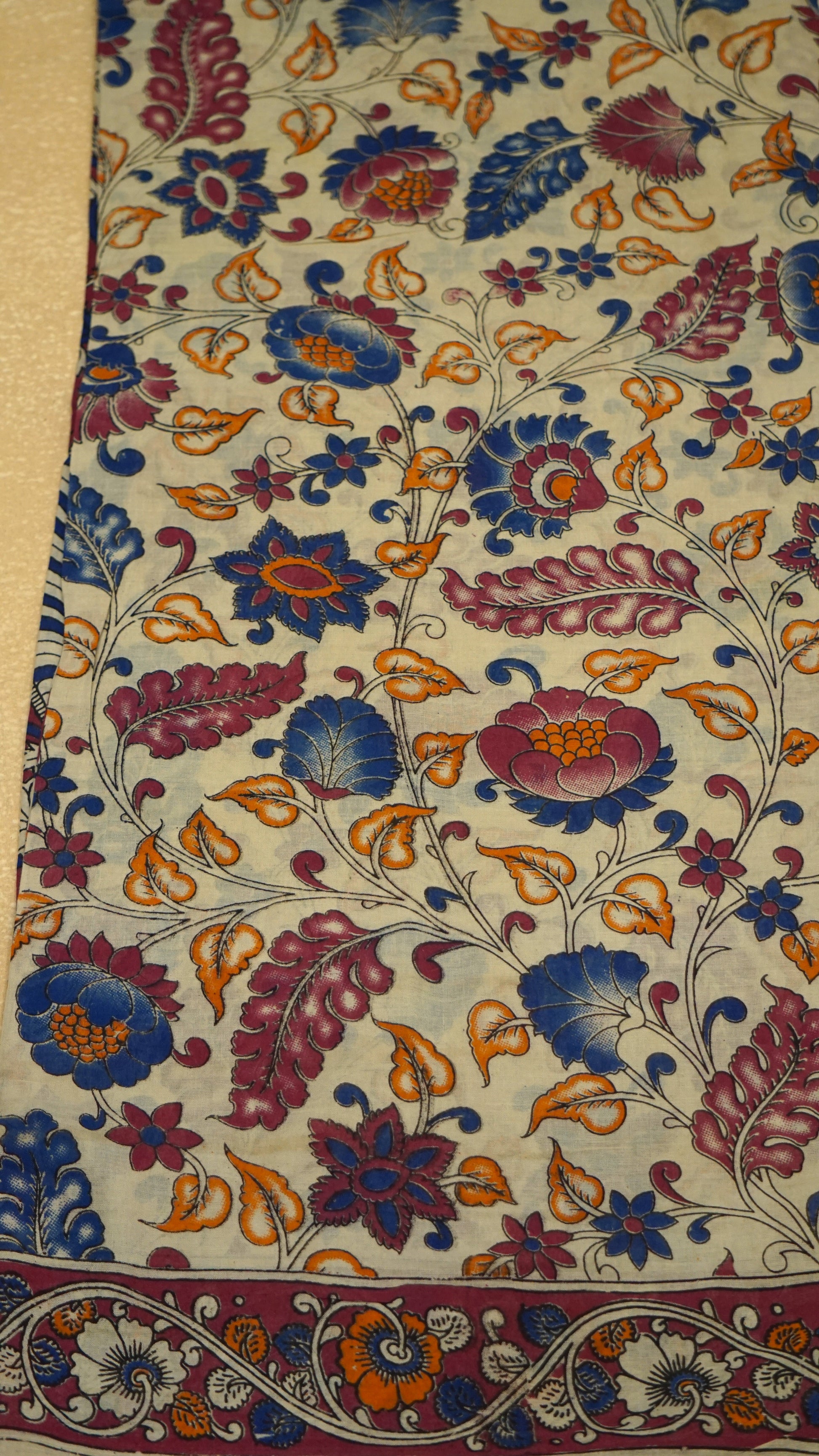 Kalamkari Saree Cotton - Beige With Magenta Border