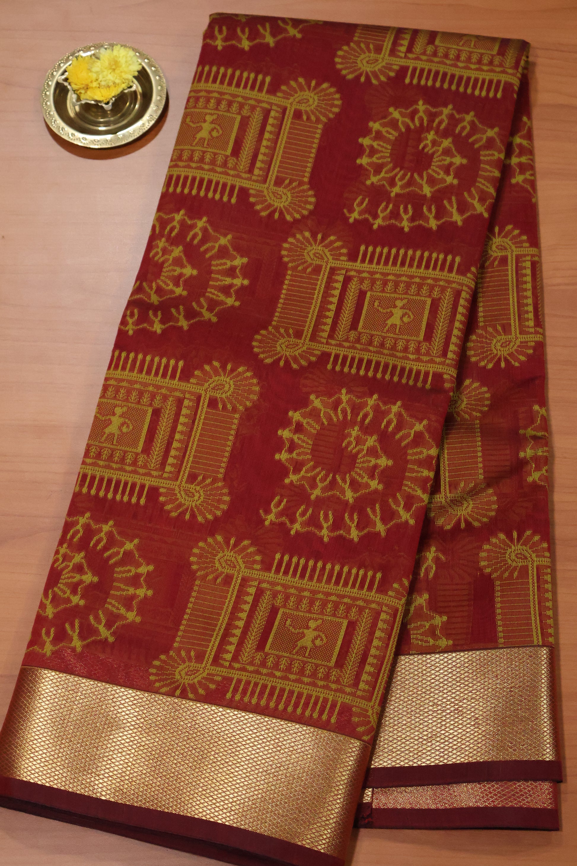 Kora Silk Cotton Saree - Maroon Frame Warli