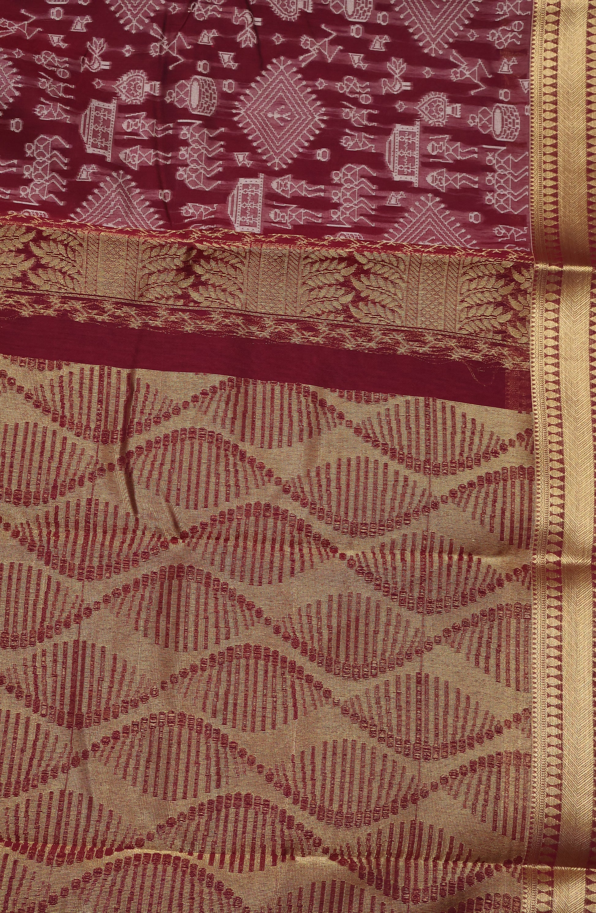 Kora Silk Cotton Saree - Warli Pattern-Maroon