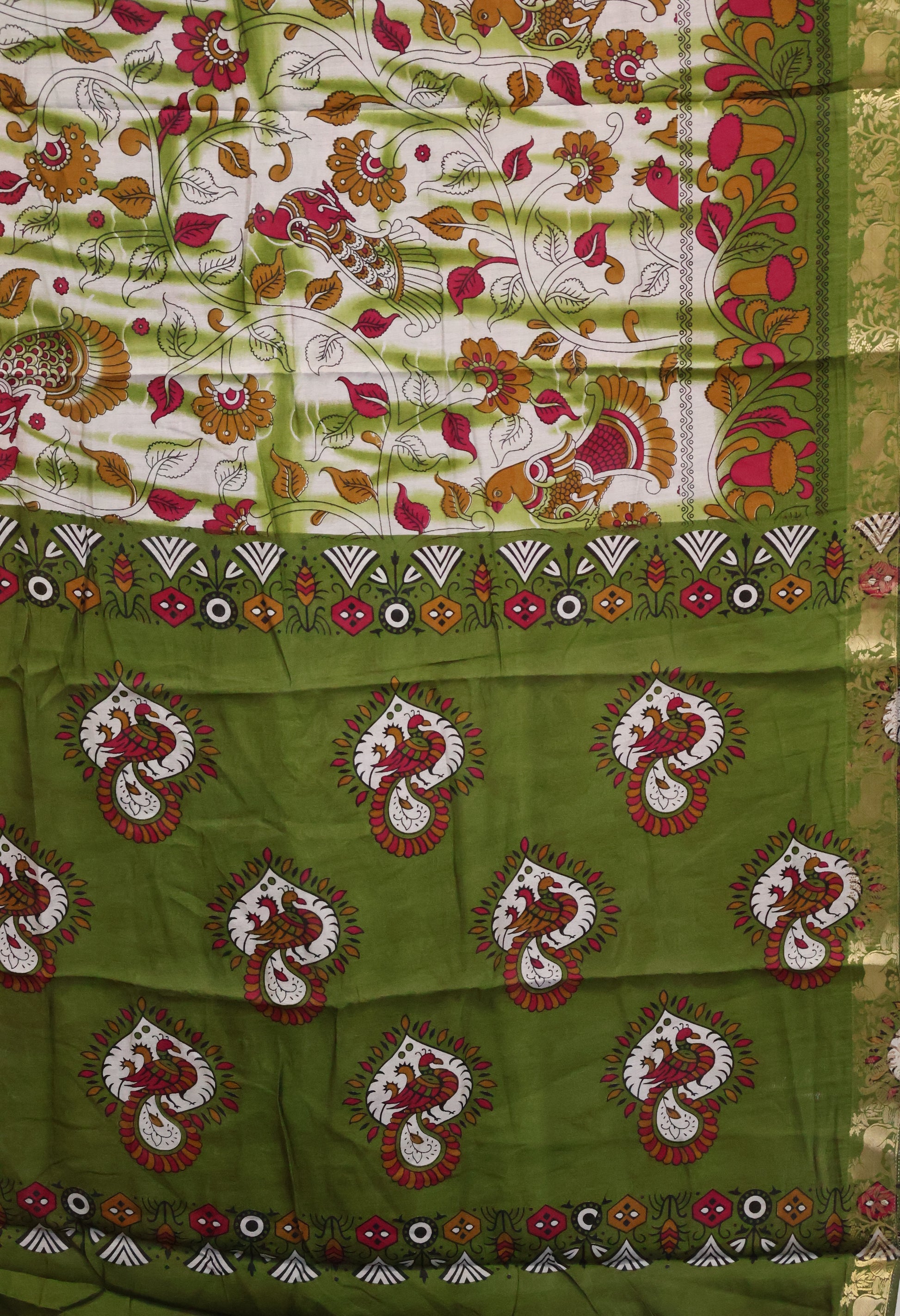 Malai Cotton Saree Kalamkari Print -Olive Green