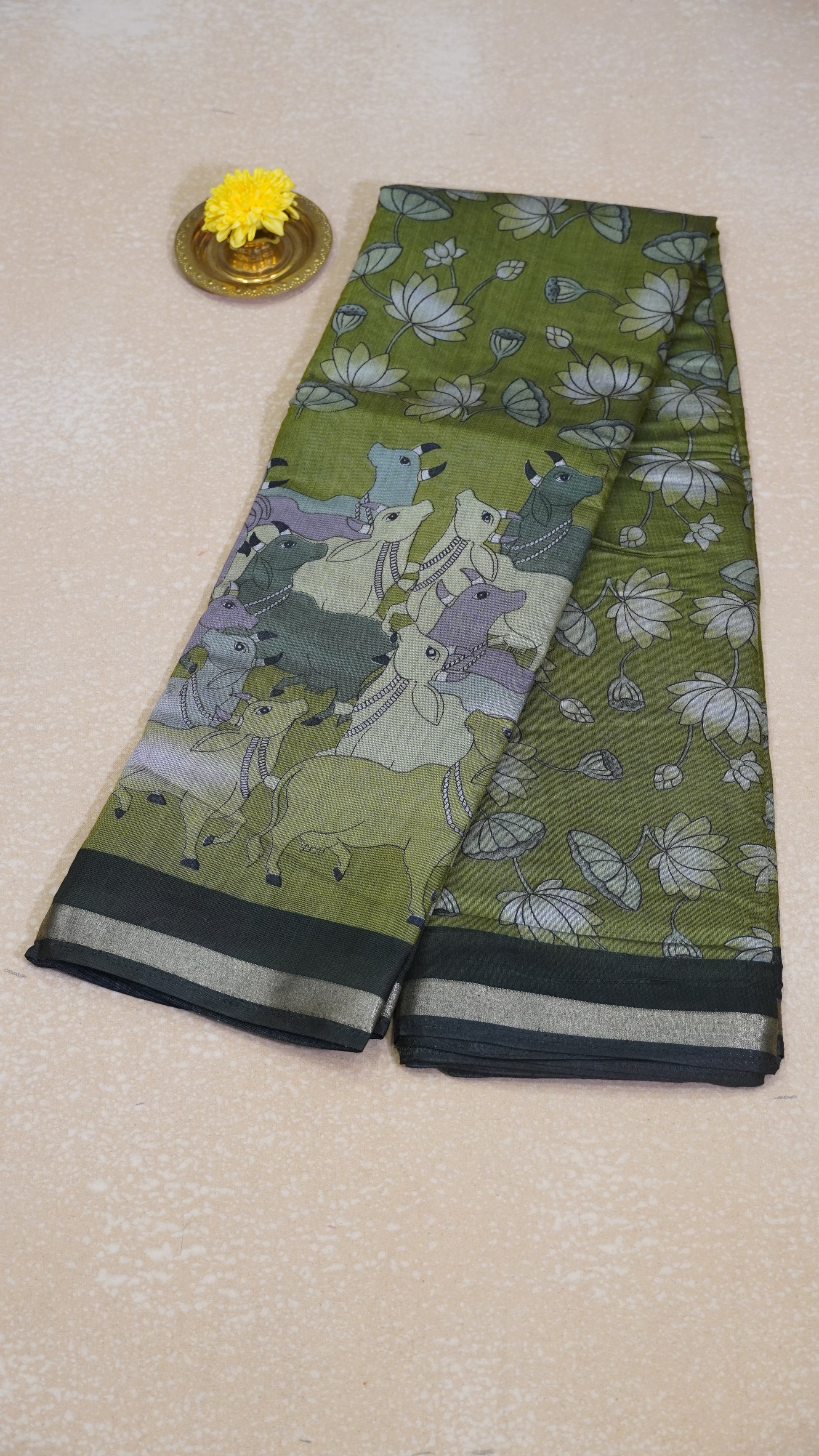 Malai Cotton Saree Pichwai & Floral Print - Green