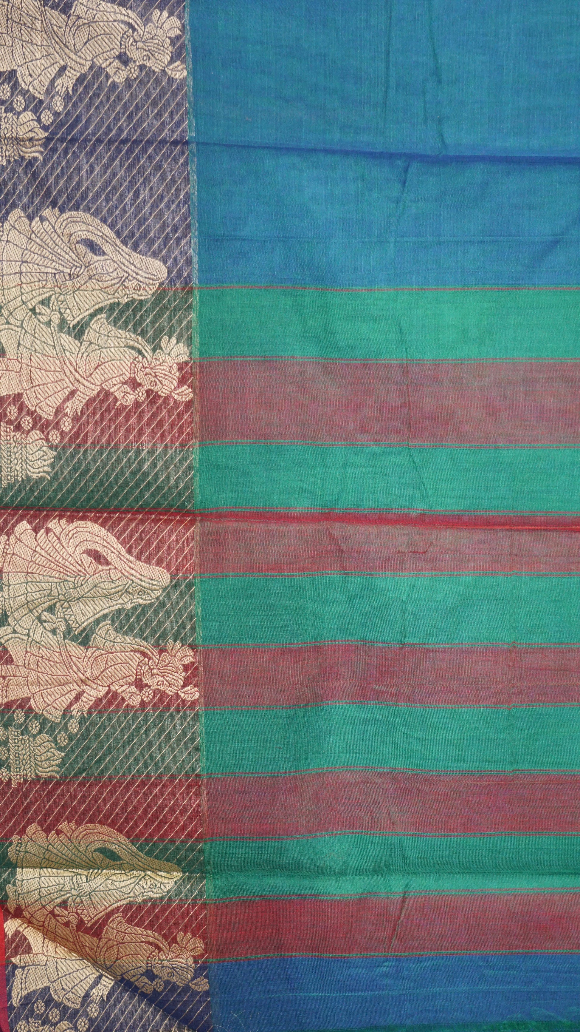 Narayanapet Cotton Saree Radha Print Peacock Blue - Maroon Border