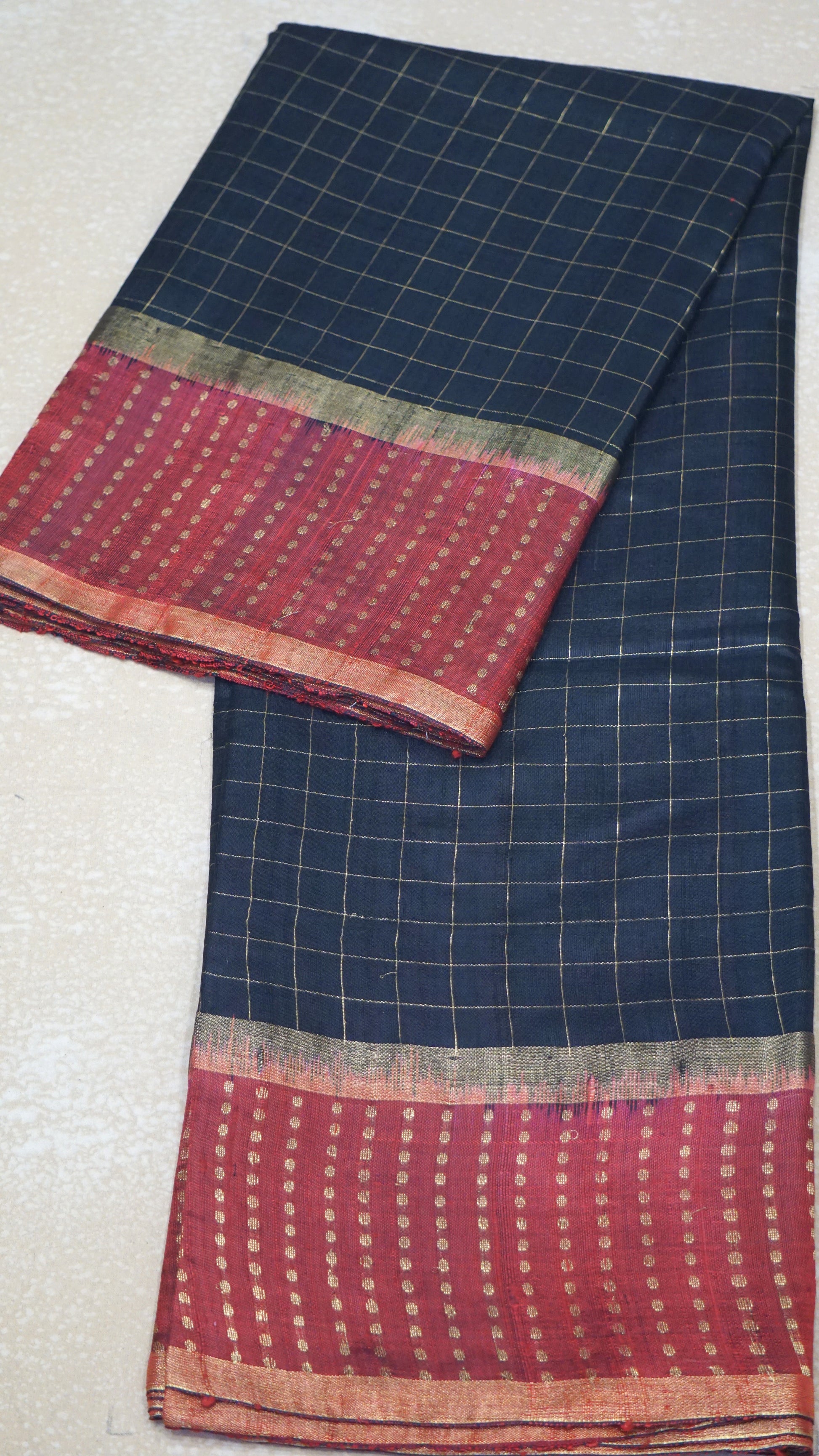 Pure Dupion Silk Saree Checks - Black With Maroon Border