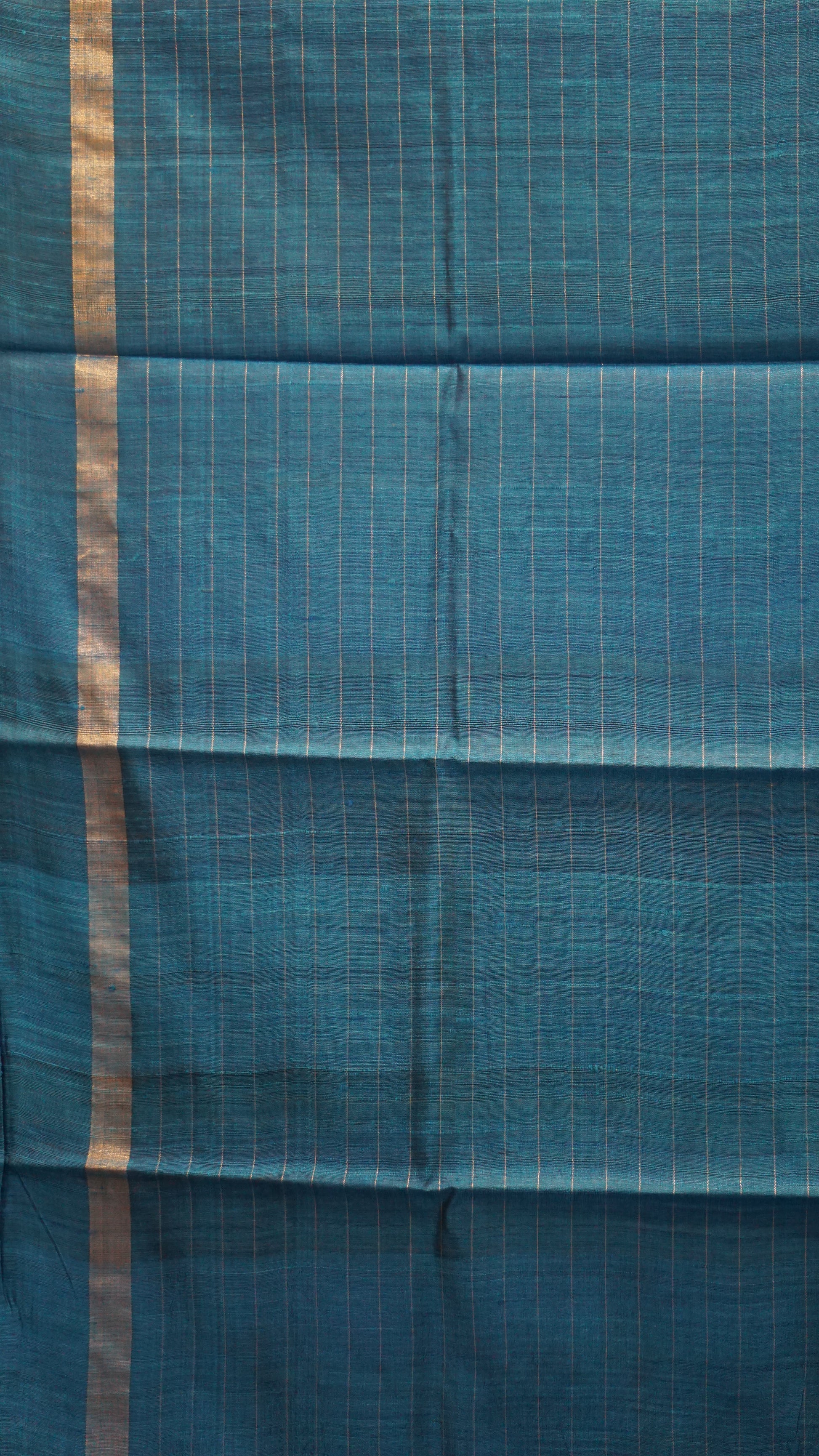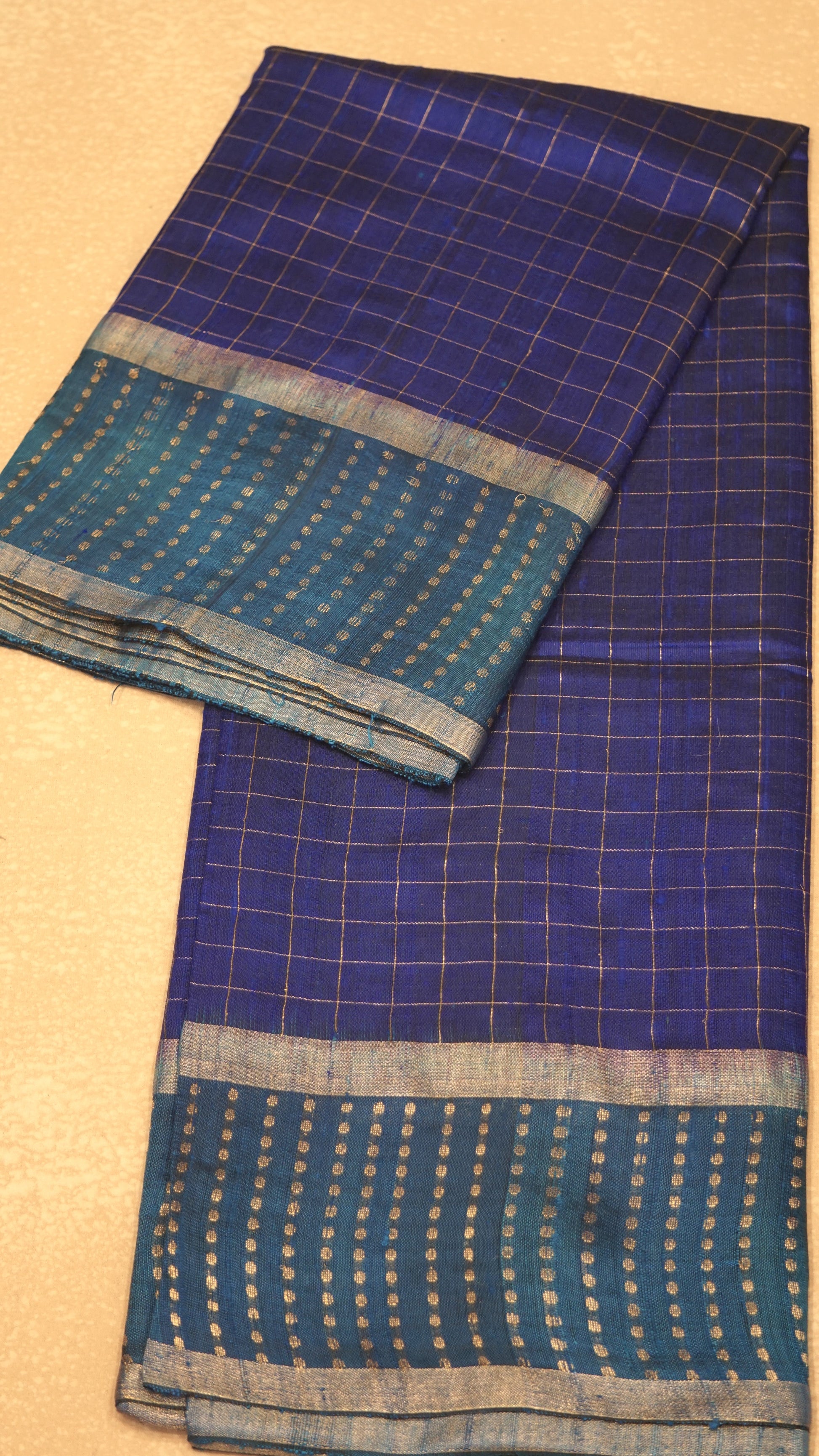 Pure Dupion Silk Saree Checks - Navy Blue with Peacock Blue Border