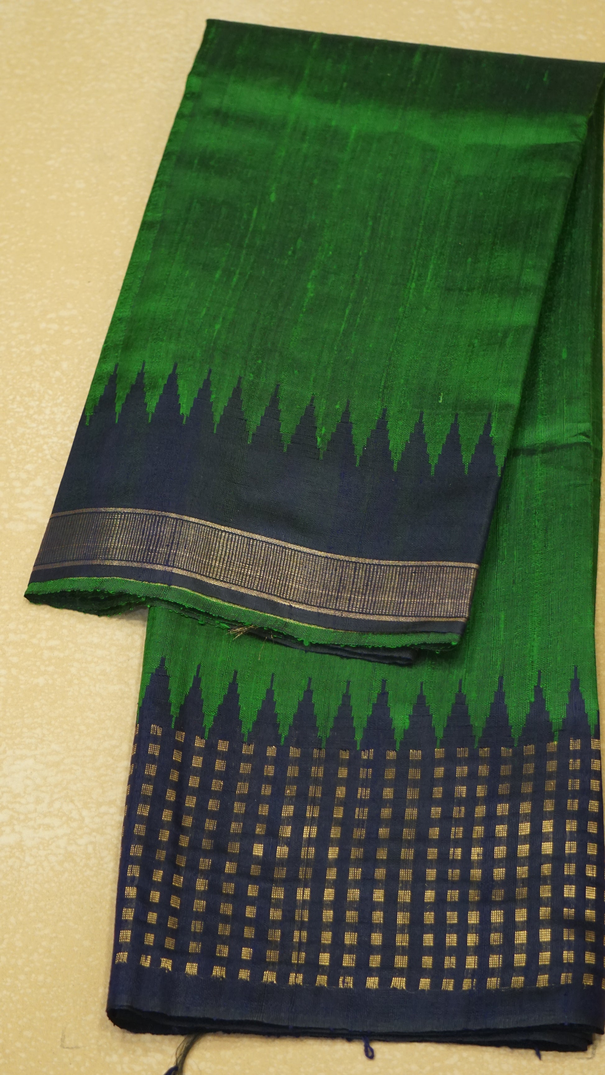 Pure Dupion Silk Saree - Green with Navy Blue Border