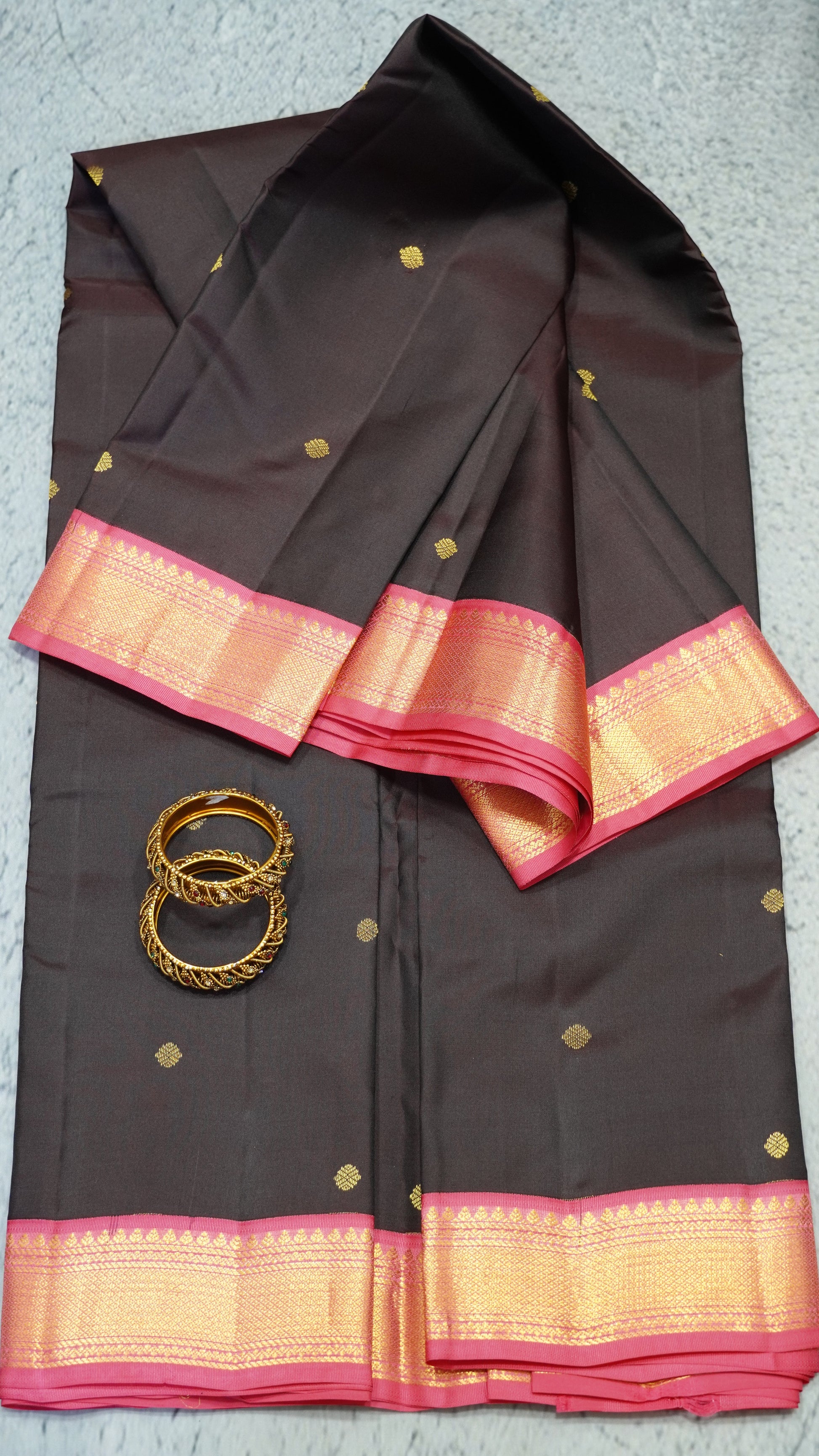 Pure Kanjivaram Silk Saree -Chocolate Brown-Pink