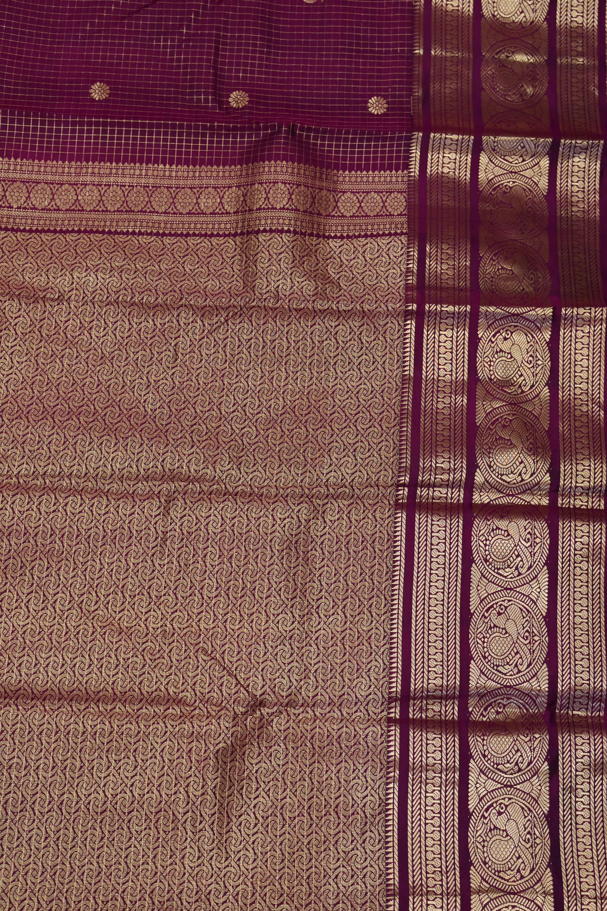 Pure Kanjivaram Silk Saree-Magenta Square Checks Mayil Border