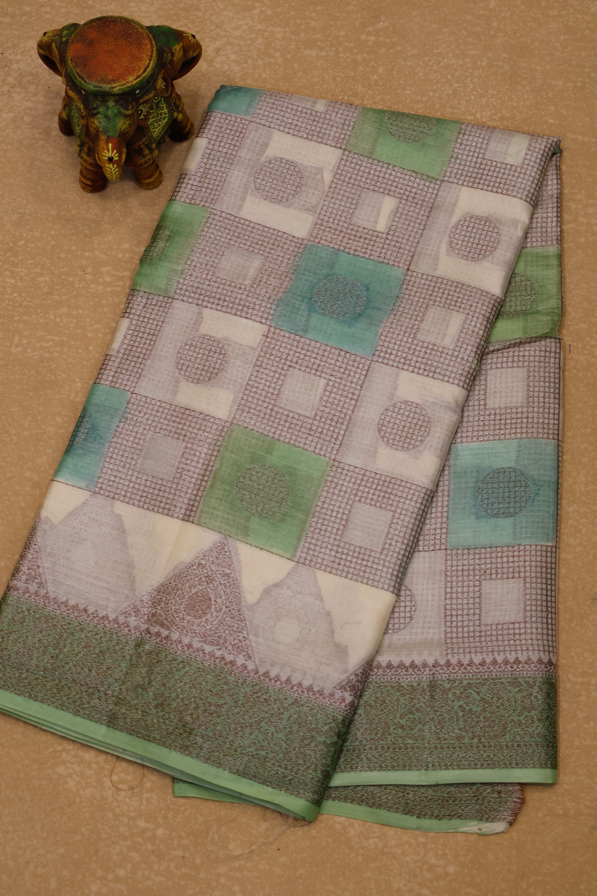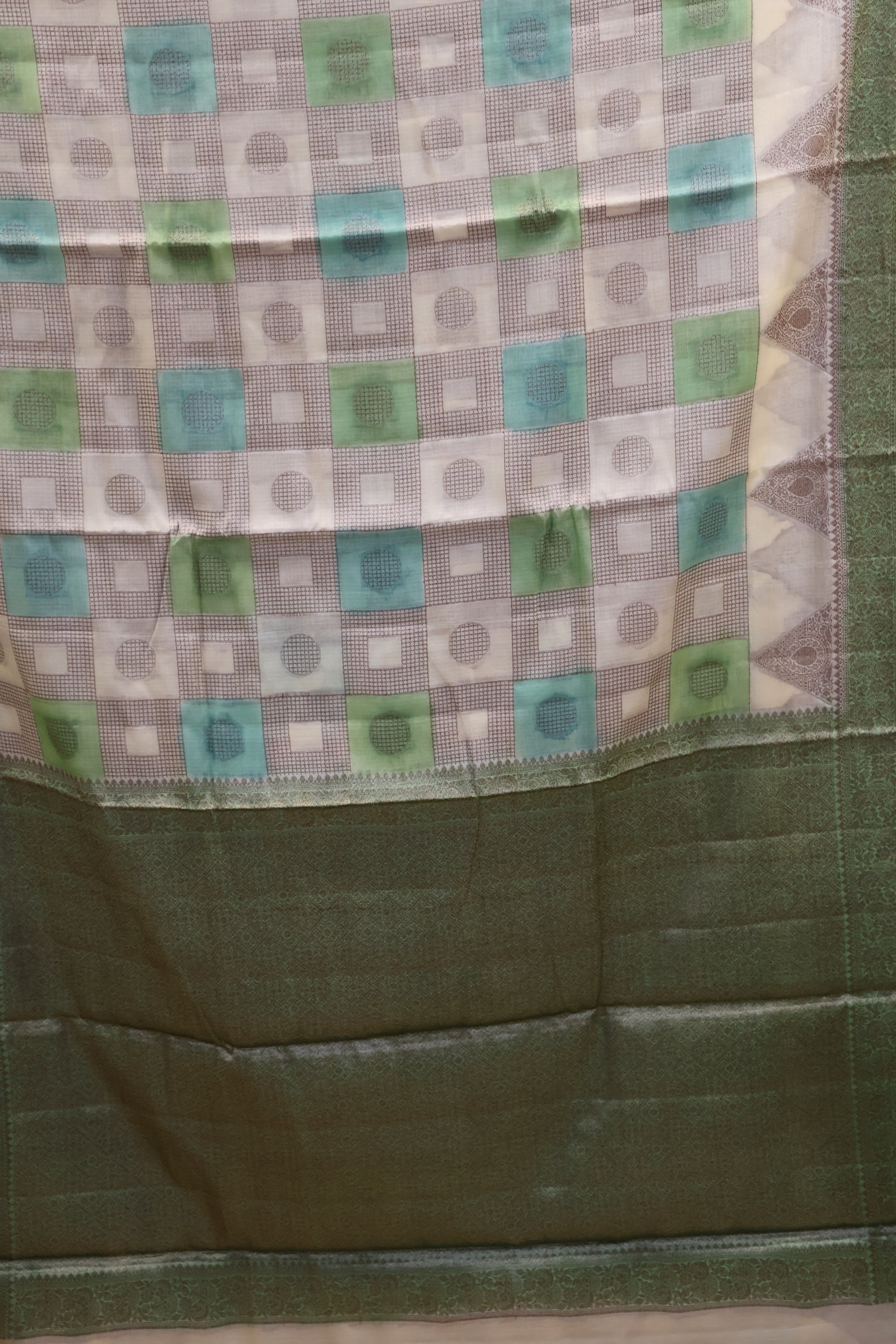Pure Tussar Saree - Green Triangle With Checked Pattern