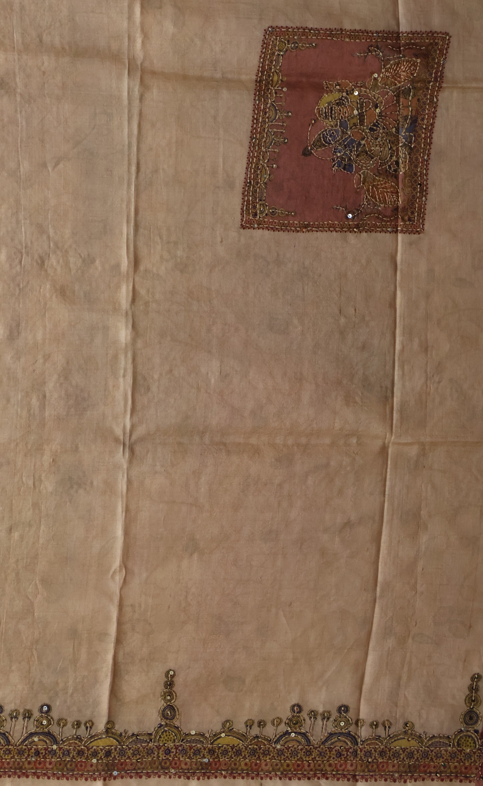 Pure Tussar Saree-Rose Chakram Mirror With Kantha Work
