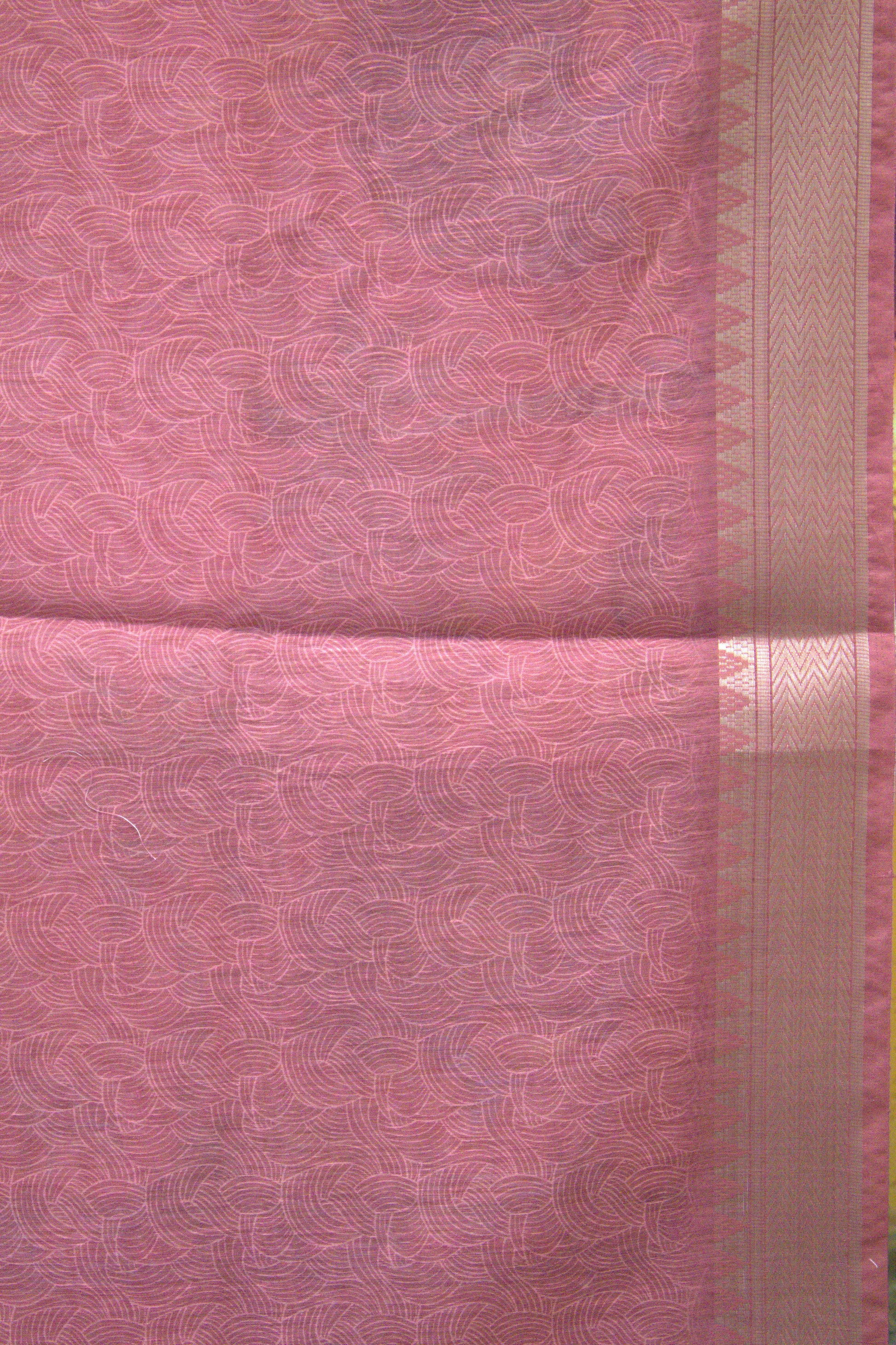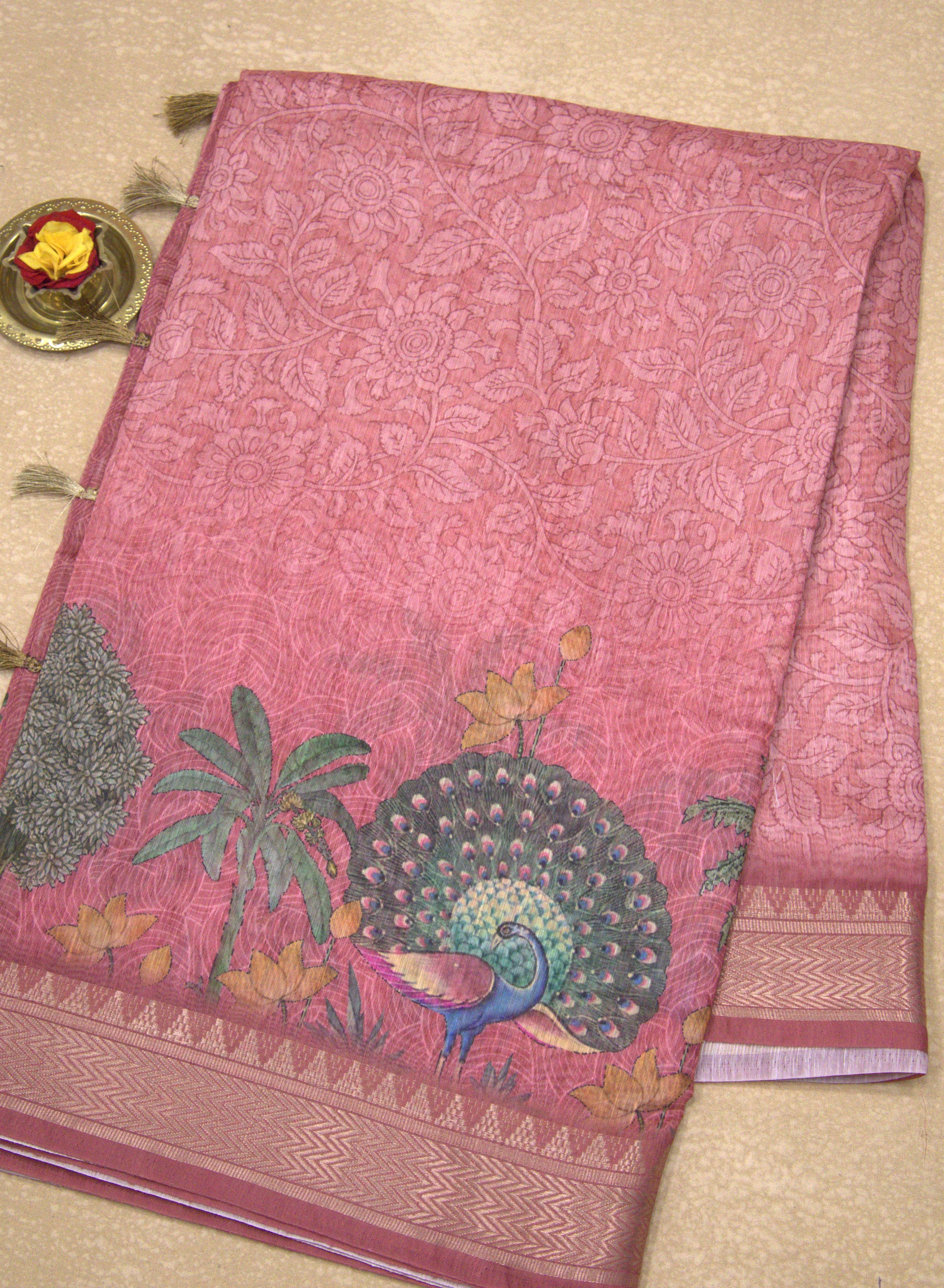 Semi Chanderi Saree Peacock Print-Peachish Pink