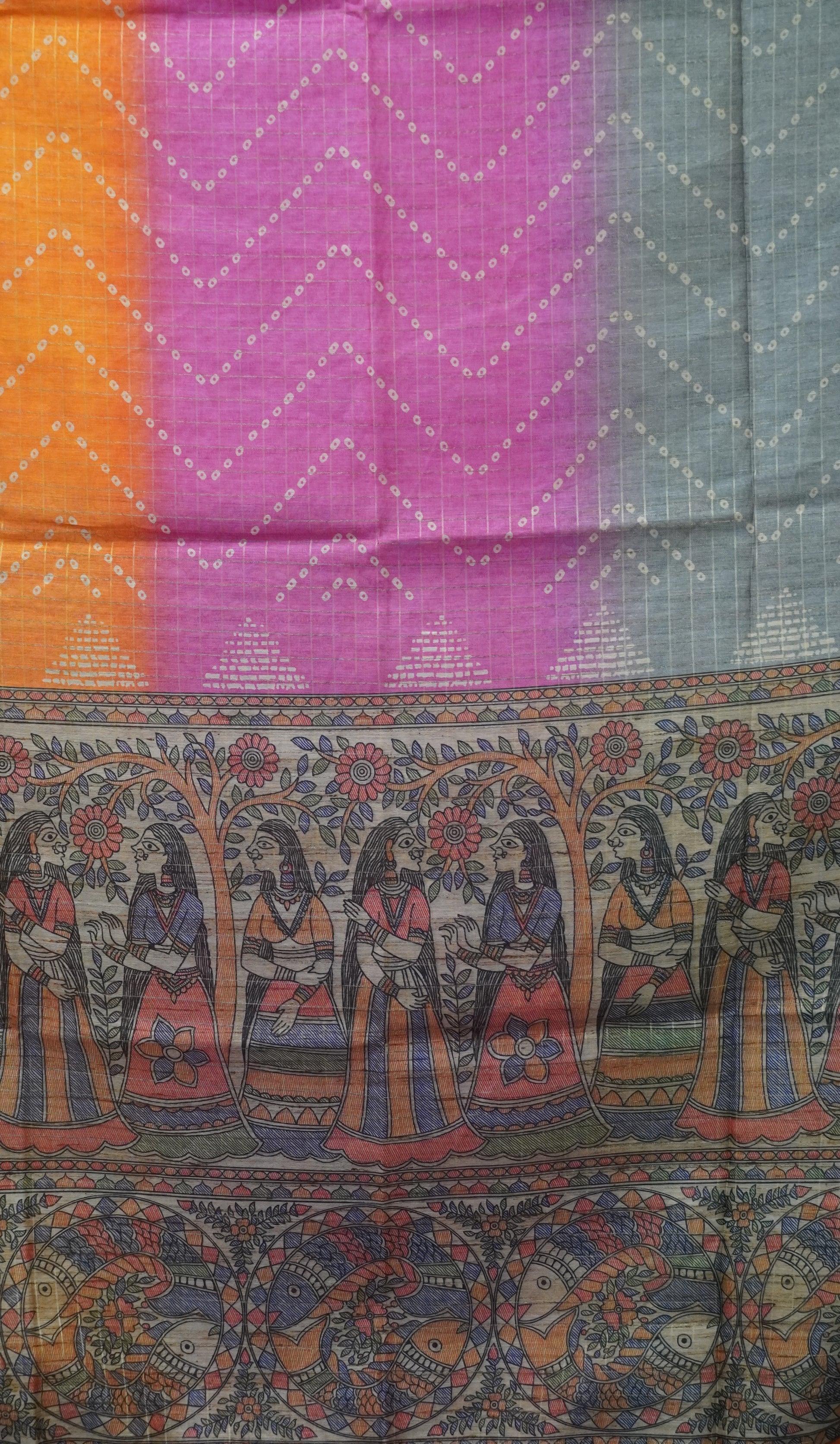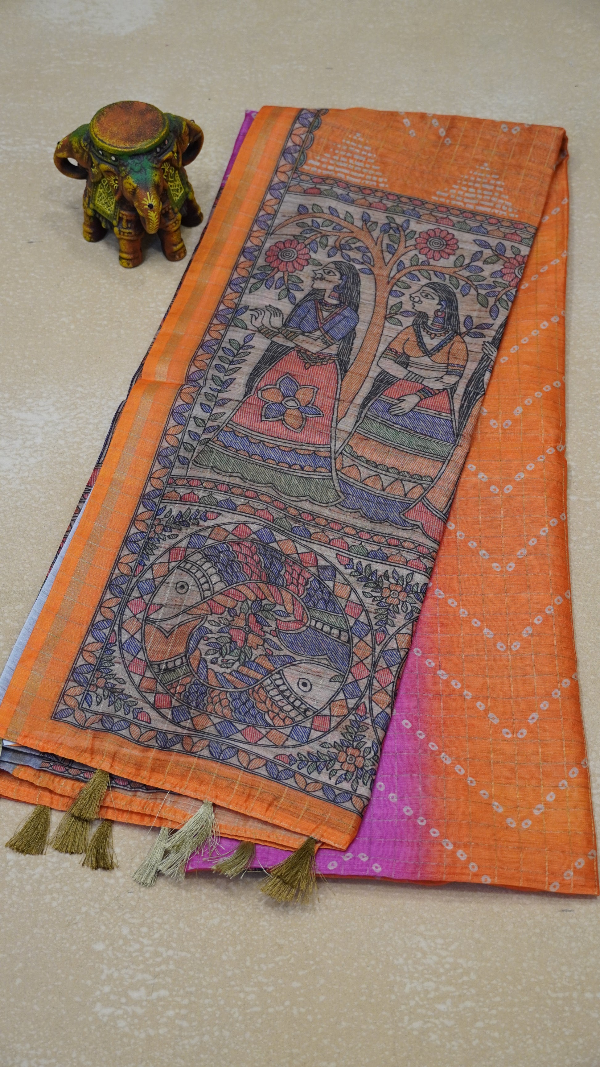 Semi Chanderi Saree Zig Zag Bandhini Print - Orange