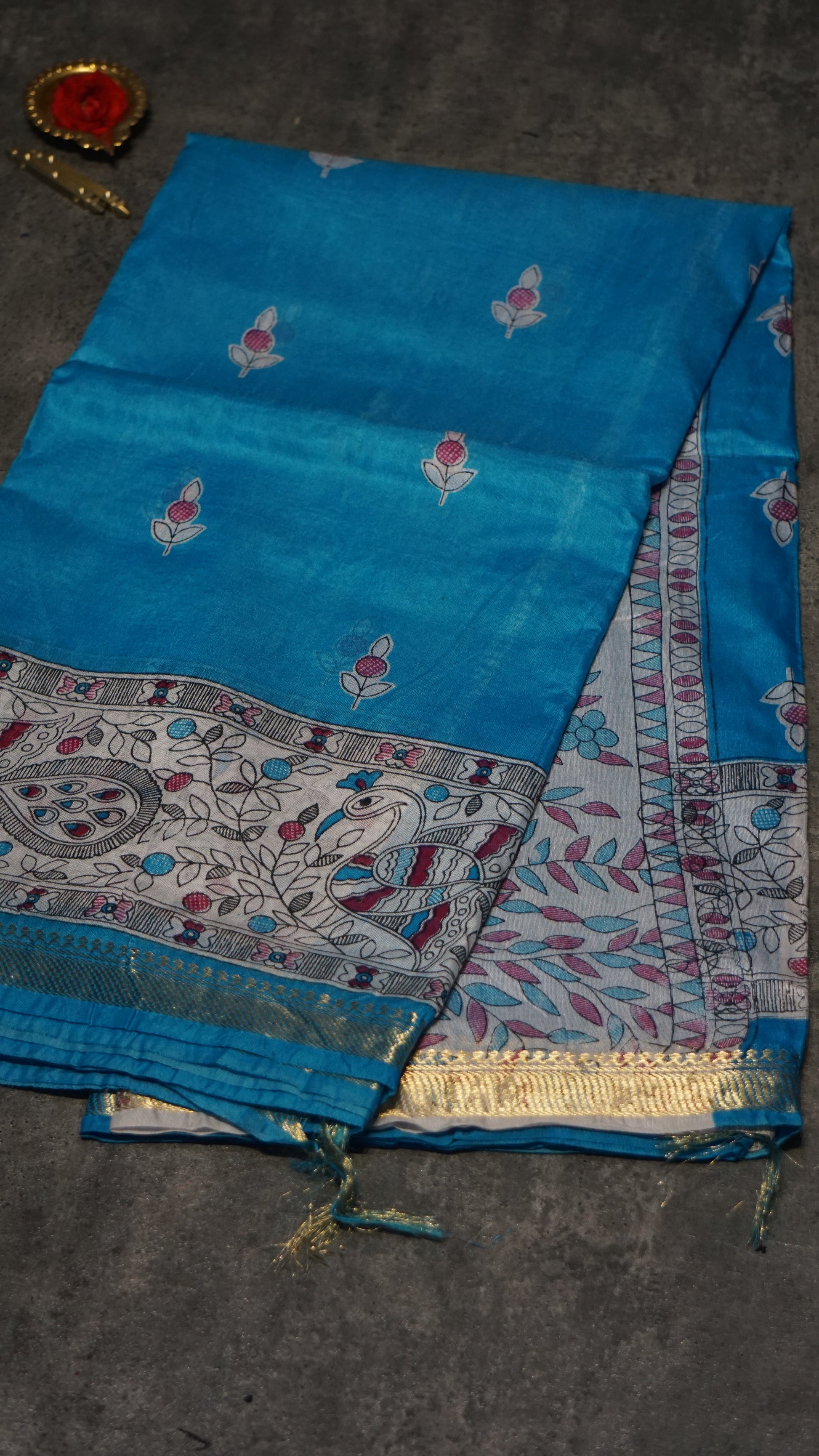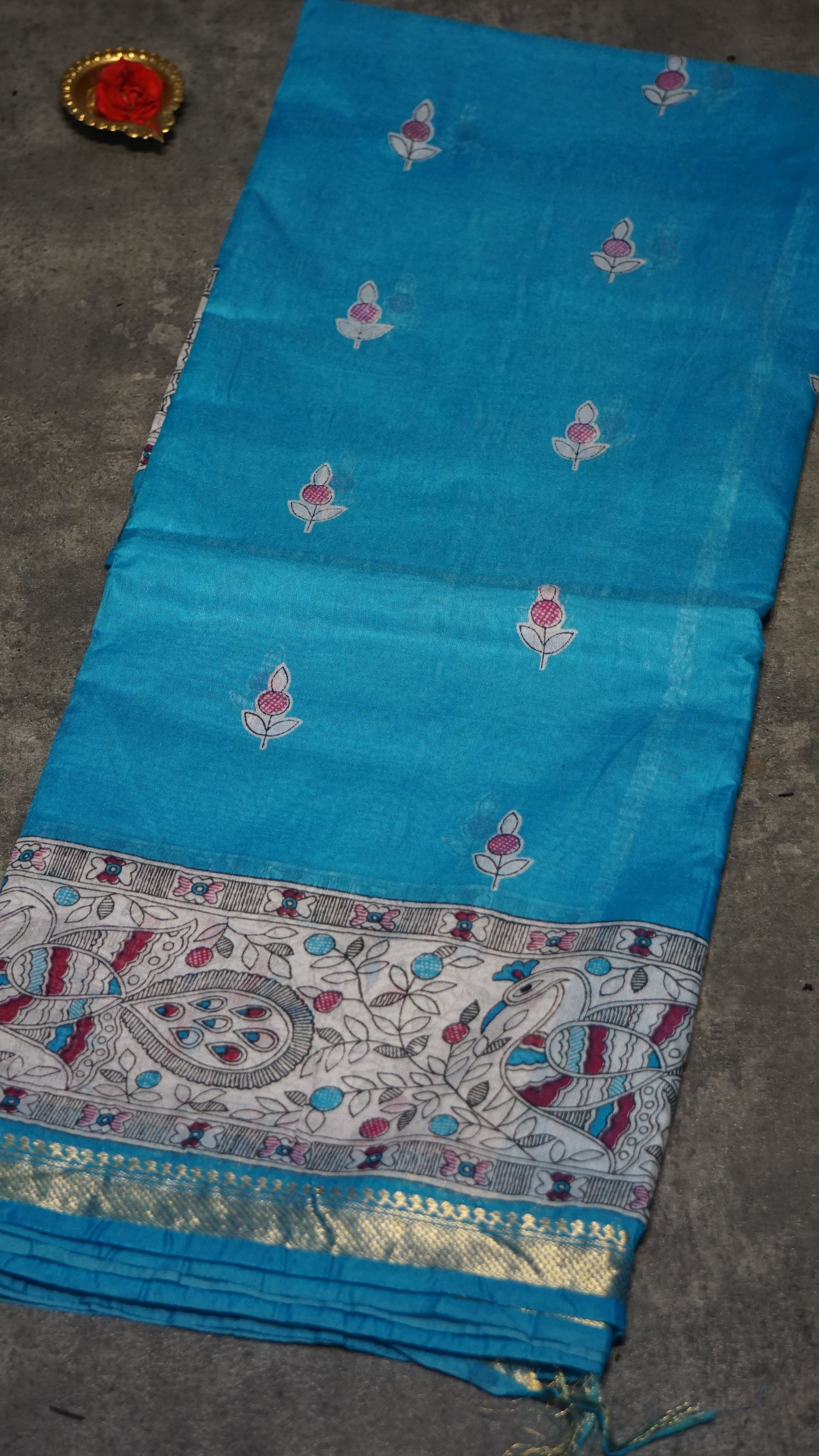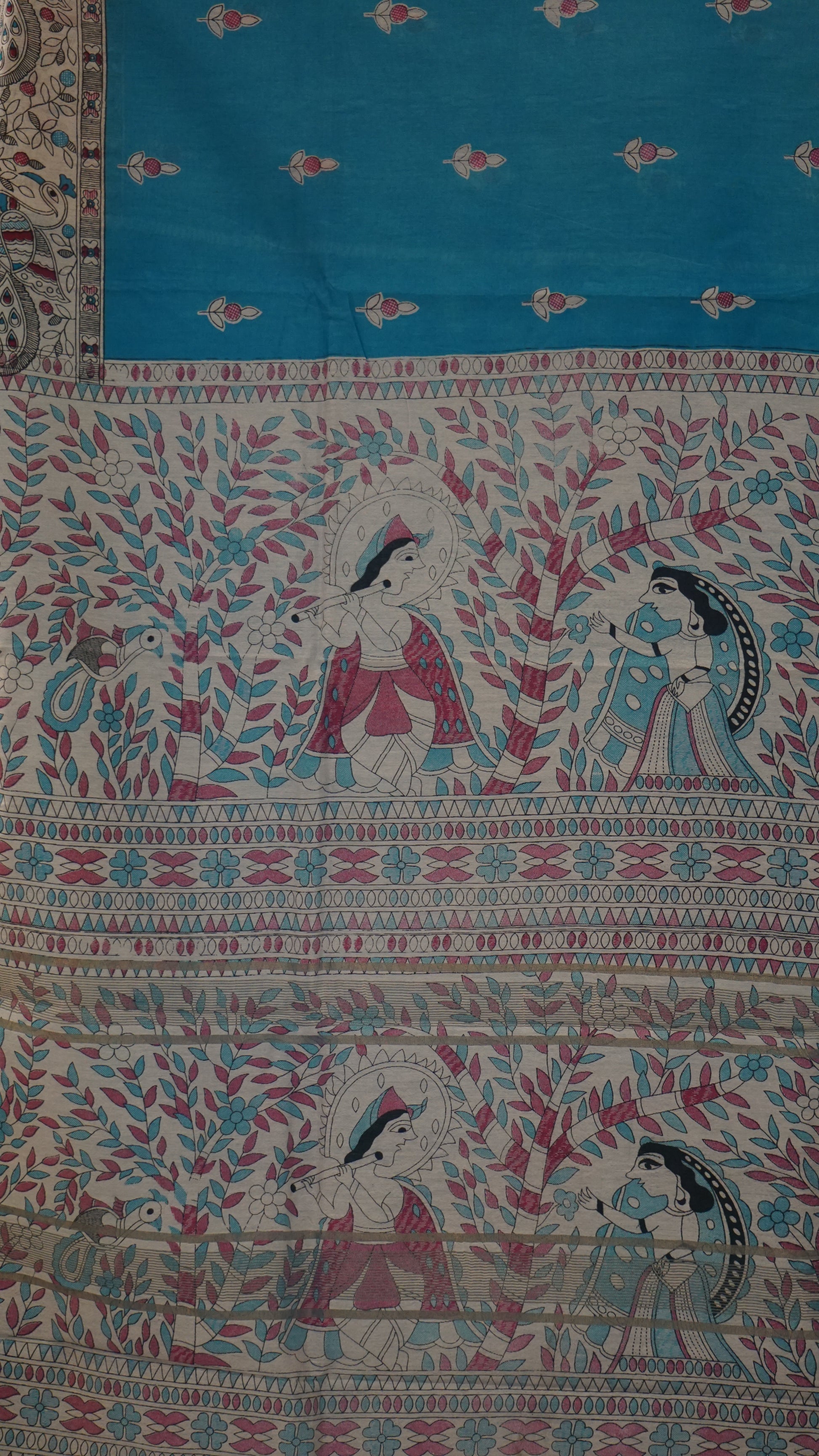 Semi Linen Blue Saree With Madhubani Print
