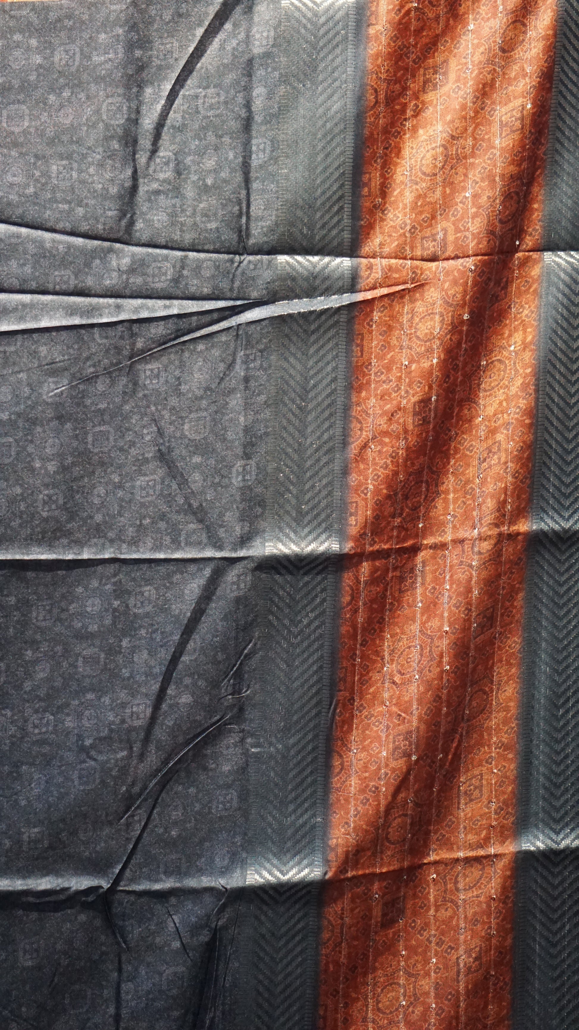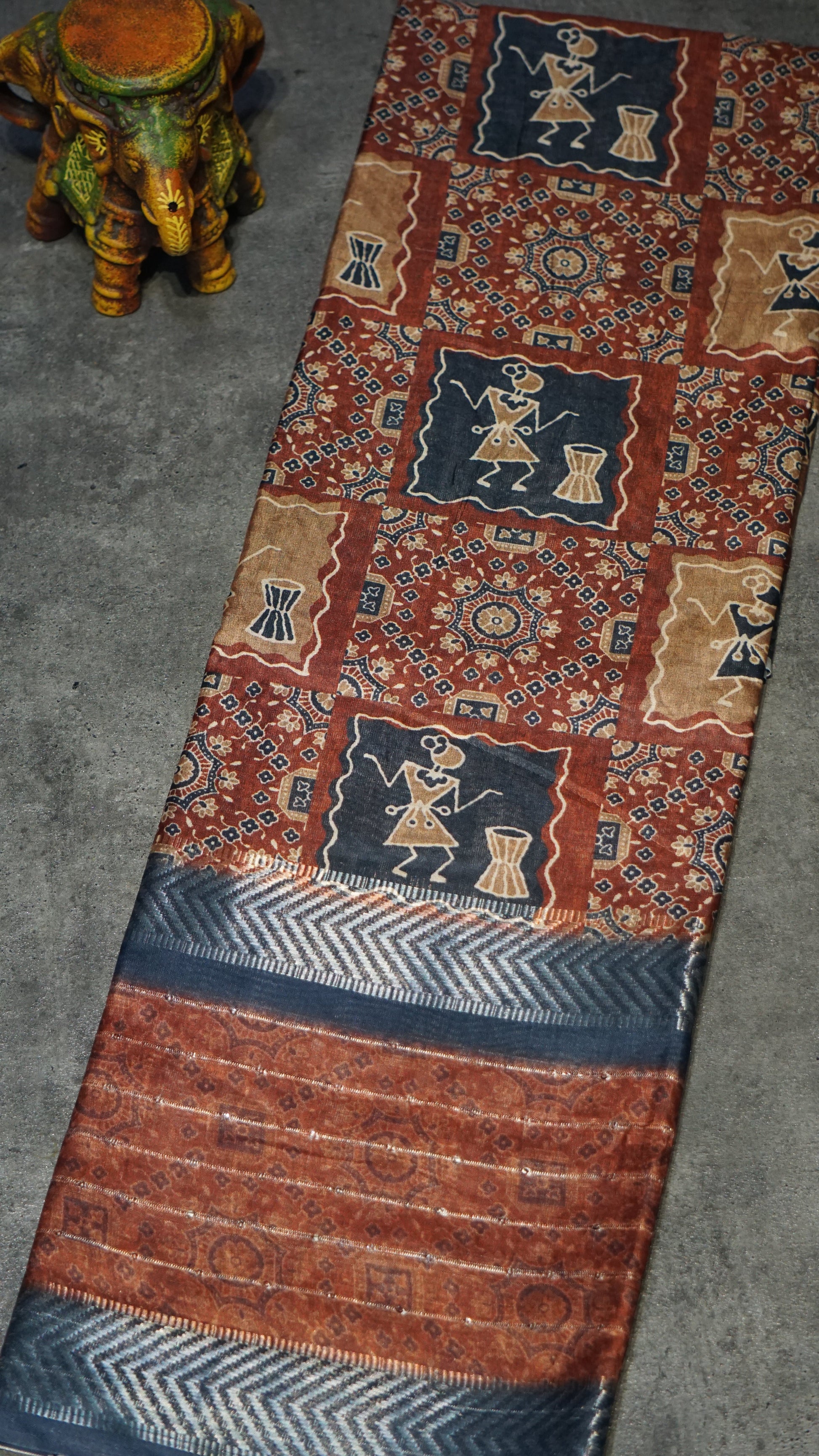 Semi Printed Silk Ajrak Print Brick Red - Navy Blue
