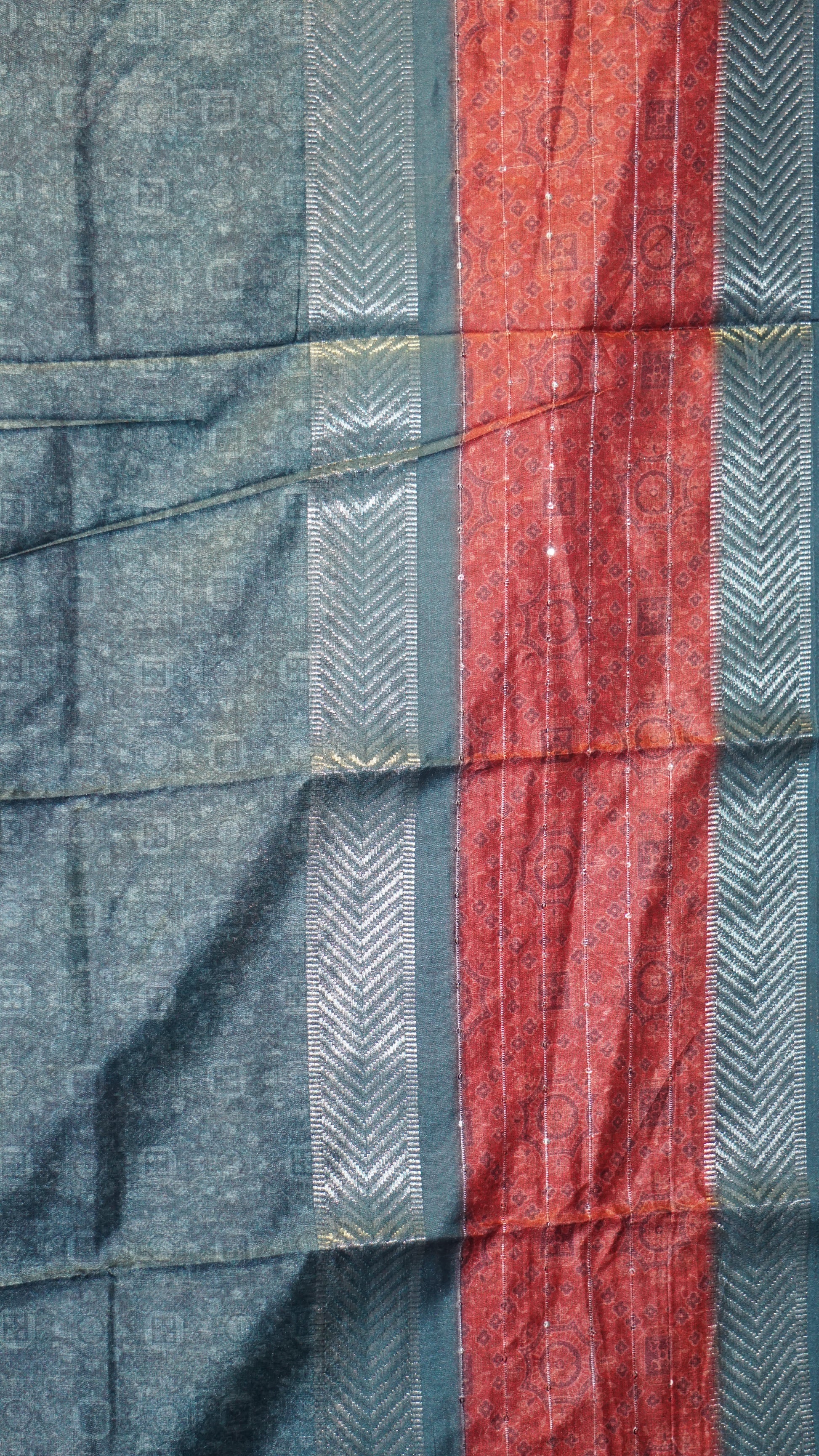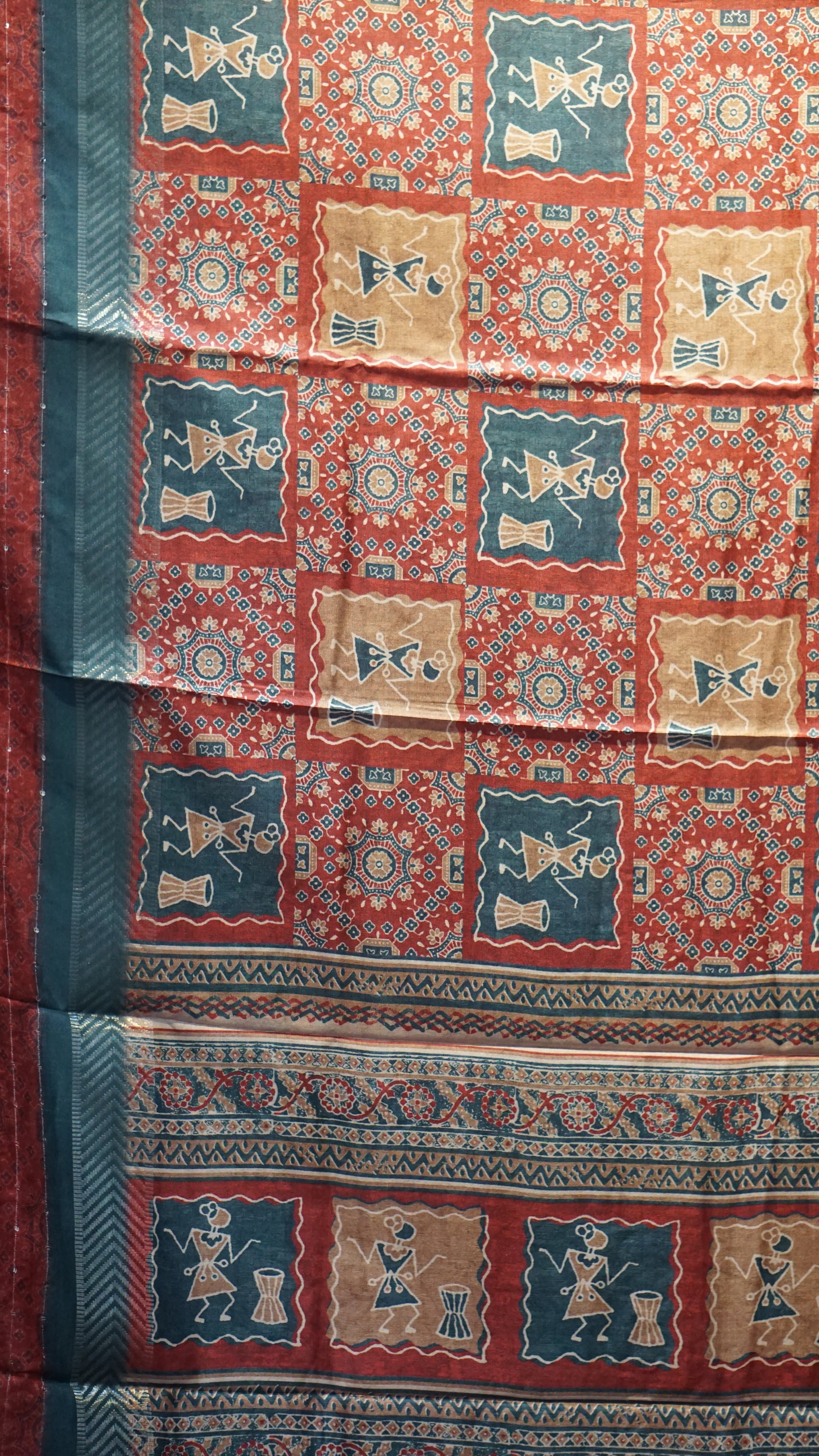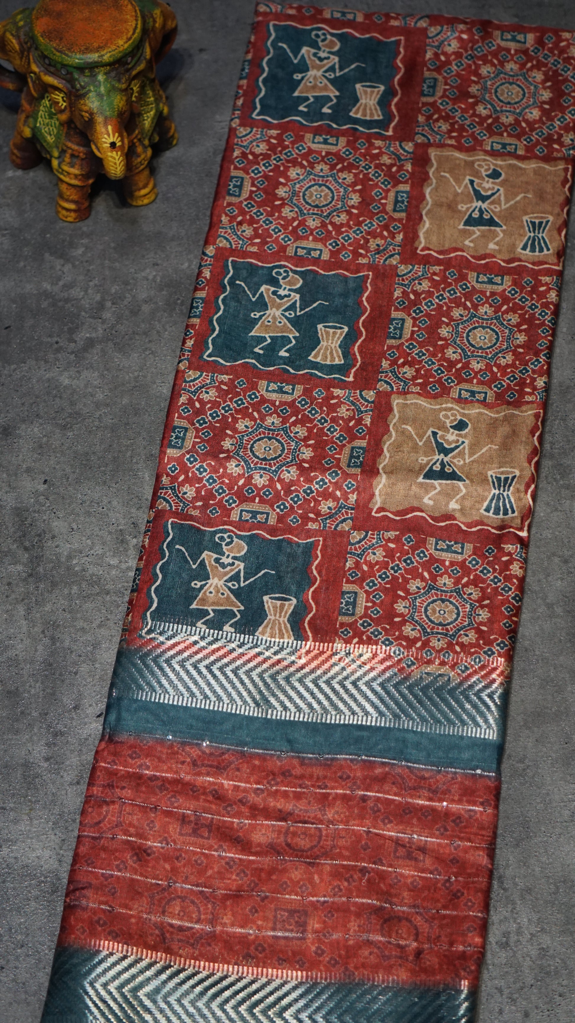 Semi Printed Silk Ajrak Print Maroon - Teal Blue