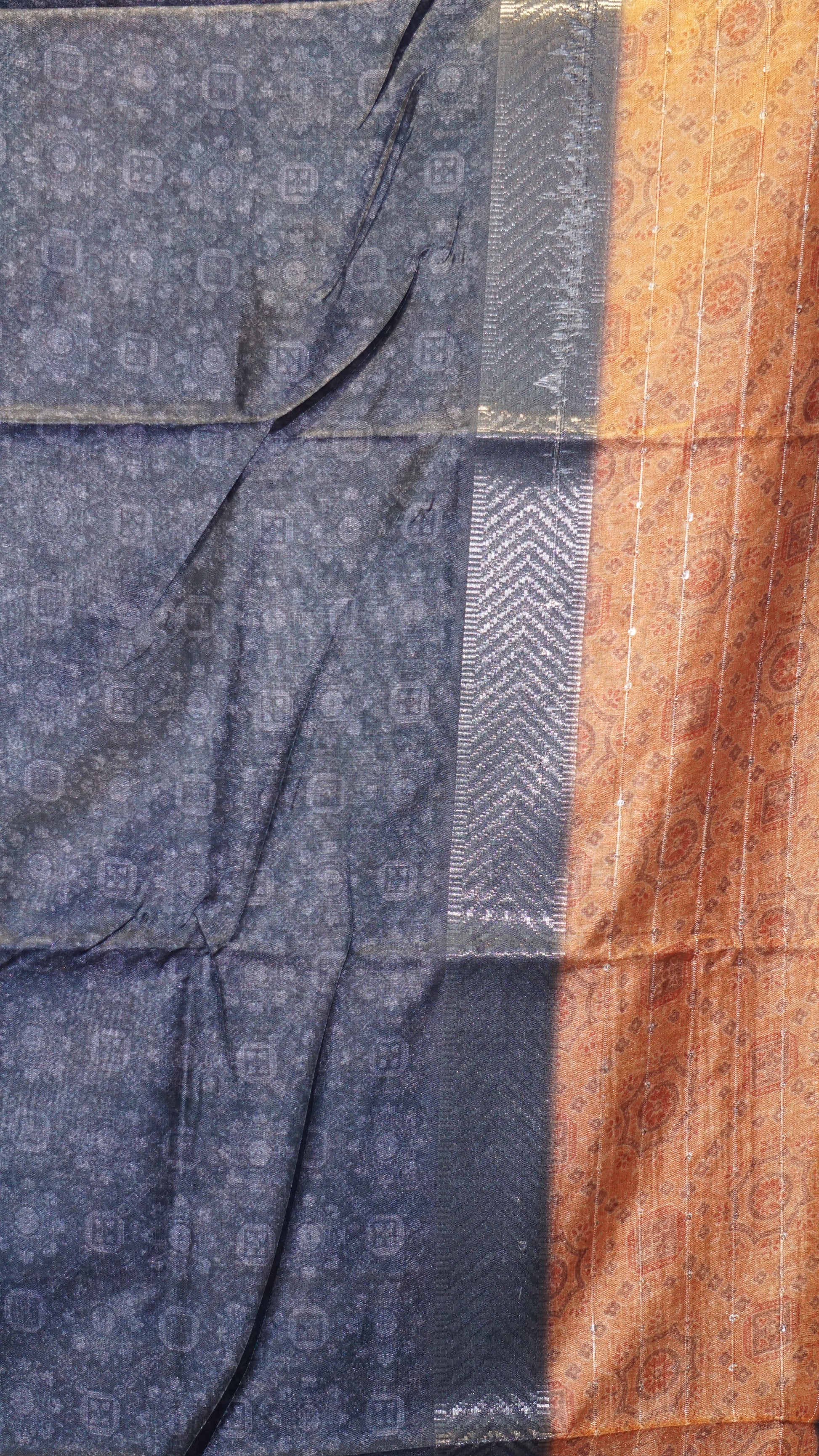 Semi Printed Silk Ajrak Print Mustard - Navy Blue
