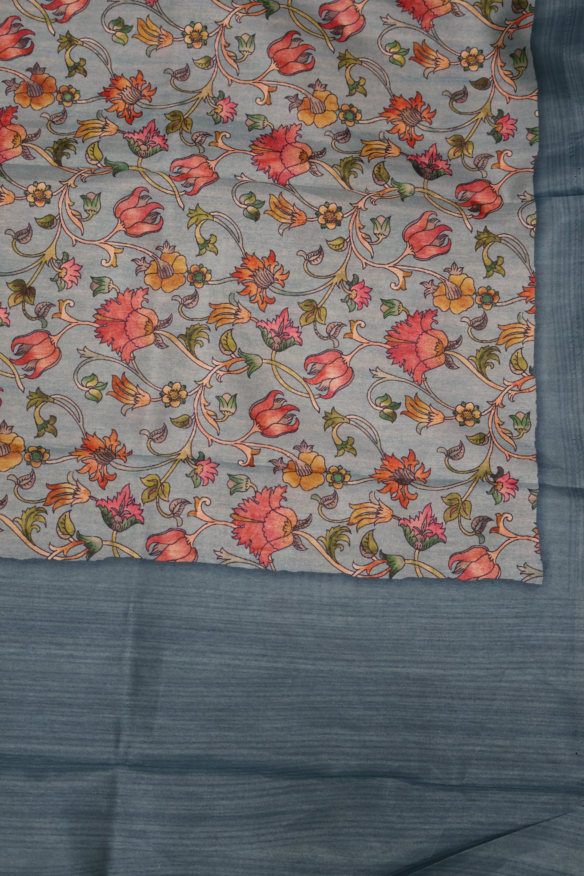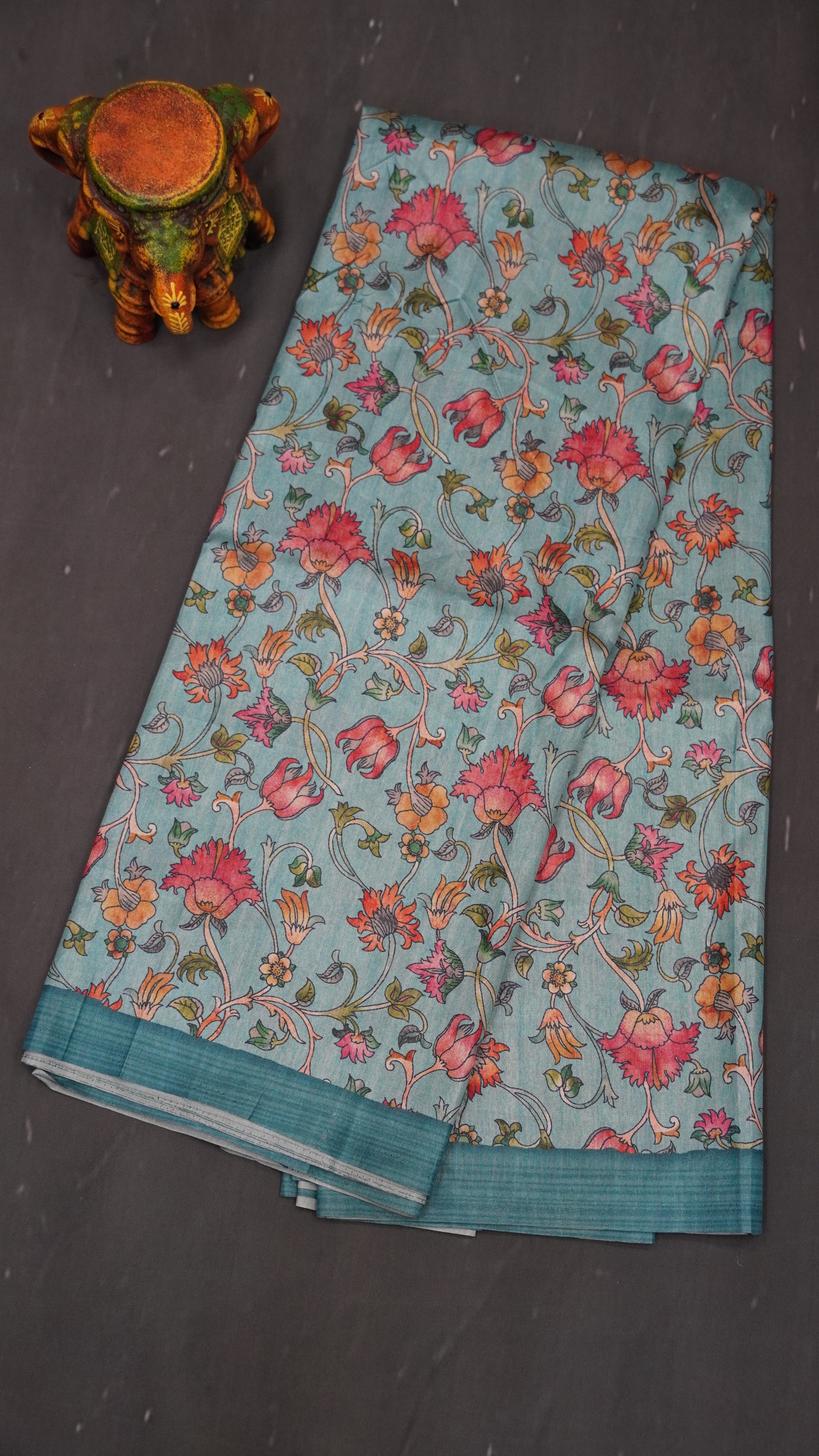 Semi Printed Silk Saree -Blue Kalamkari Body