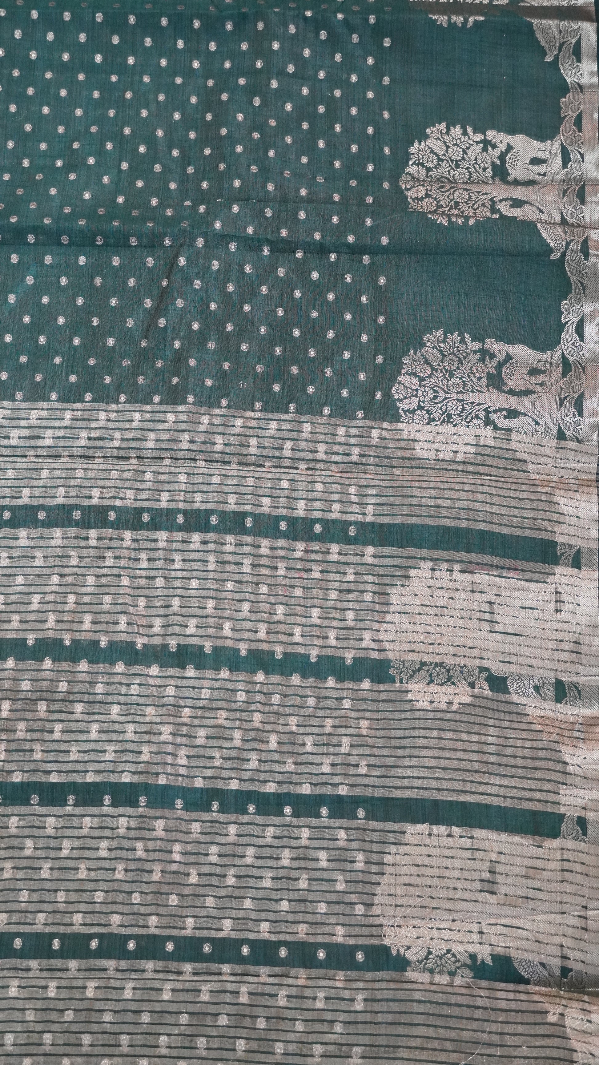 Semi Tussar - Deer Peacock Border Bottle Green