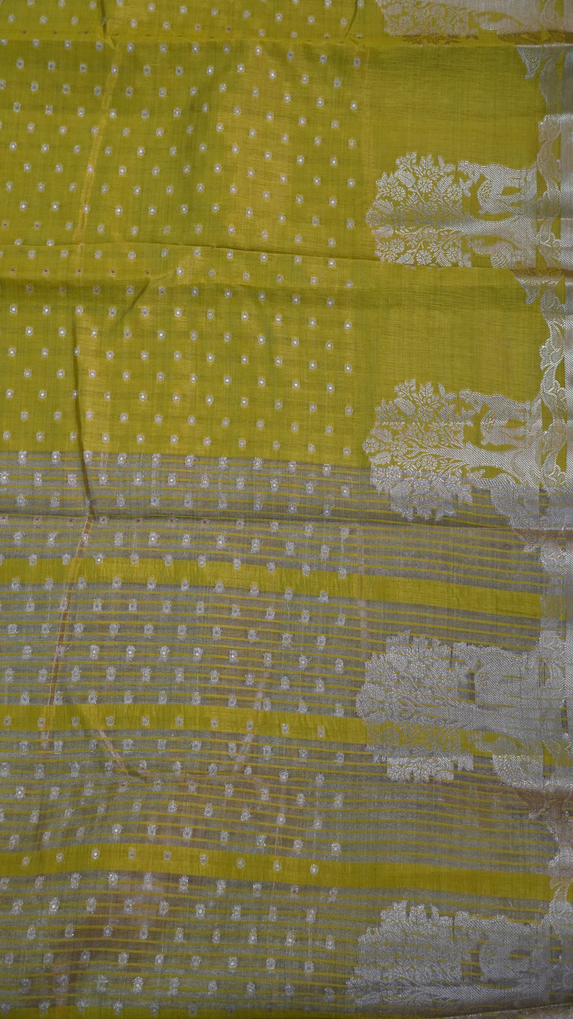 Semi Tussar - Deer Peacock Border Mehndi green