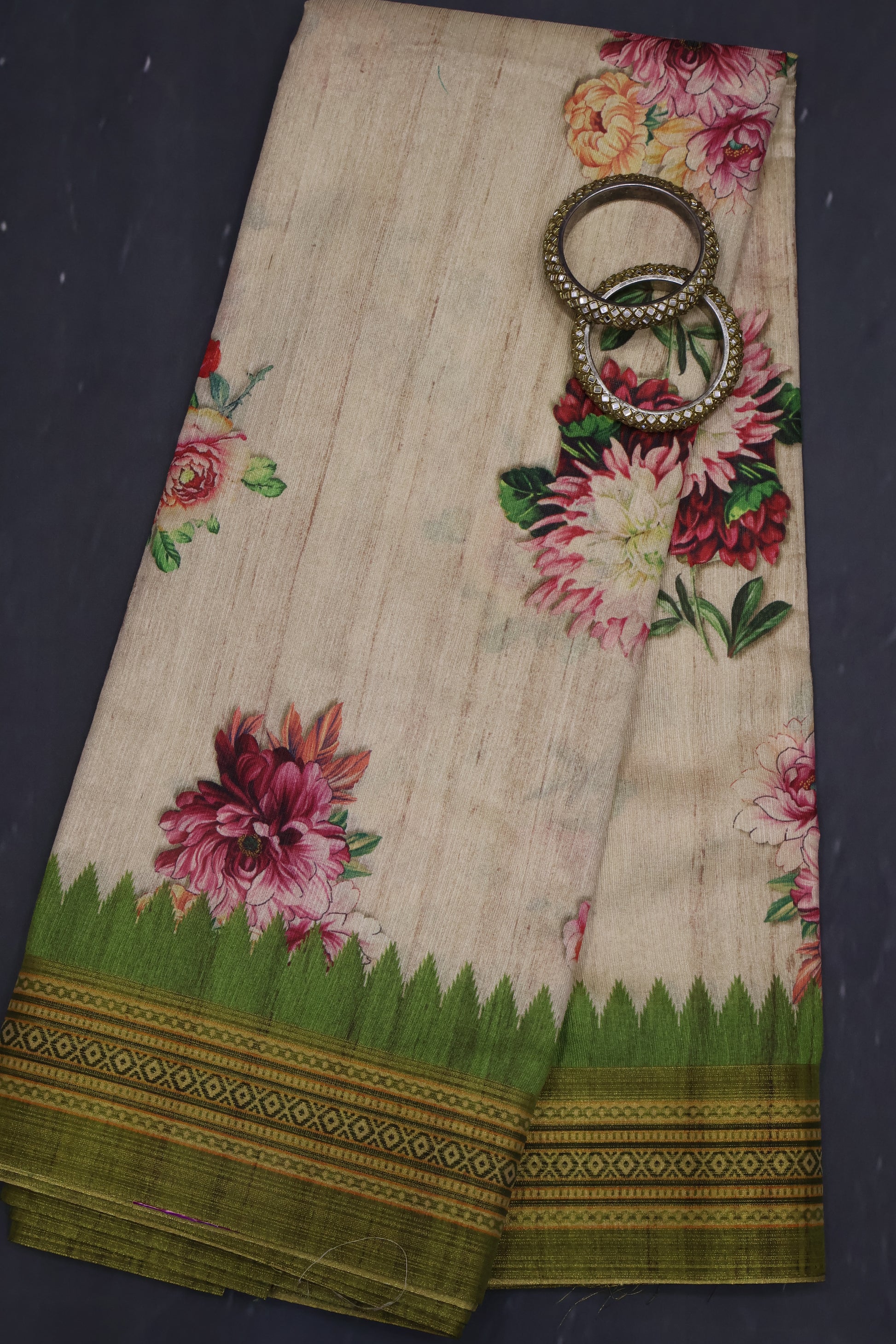 Semi Tussar Saree - Beige Floral Print