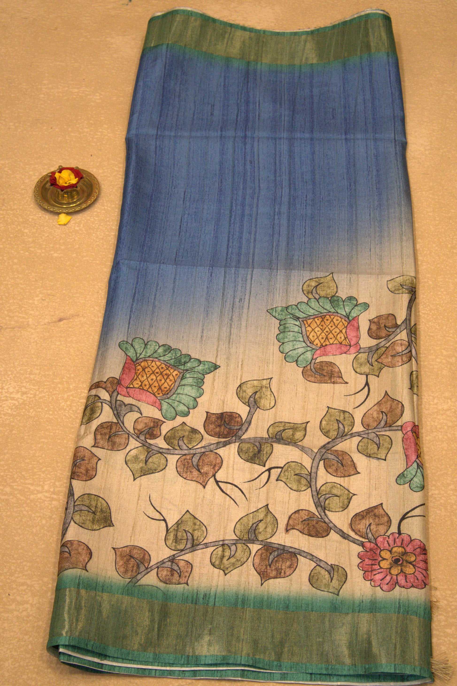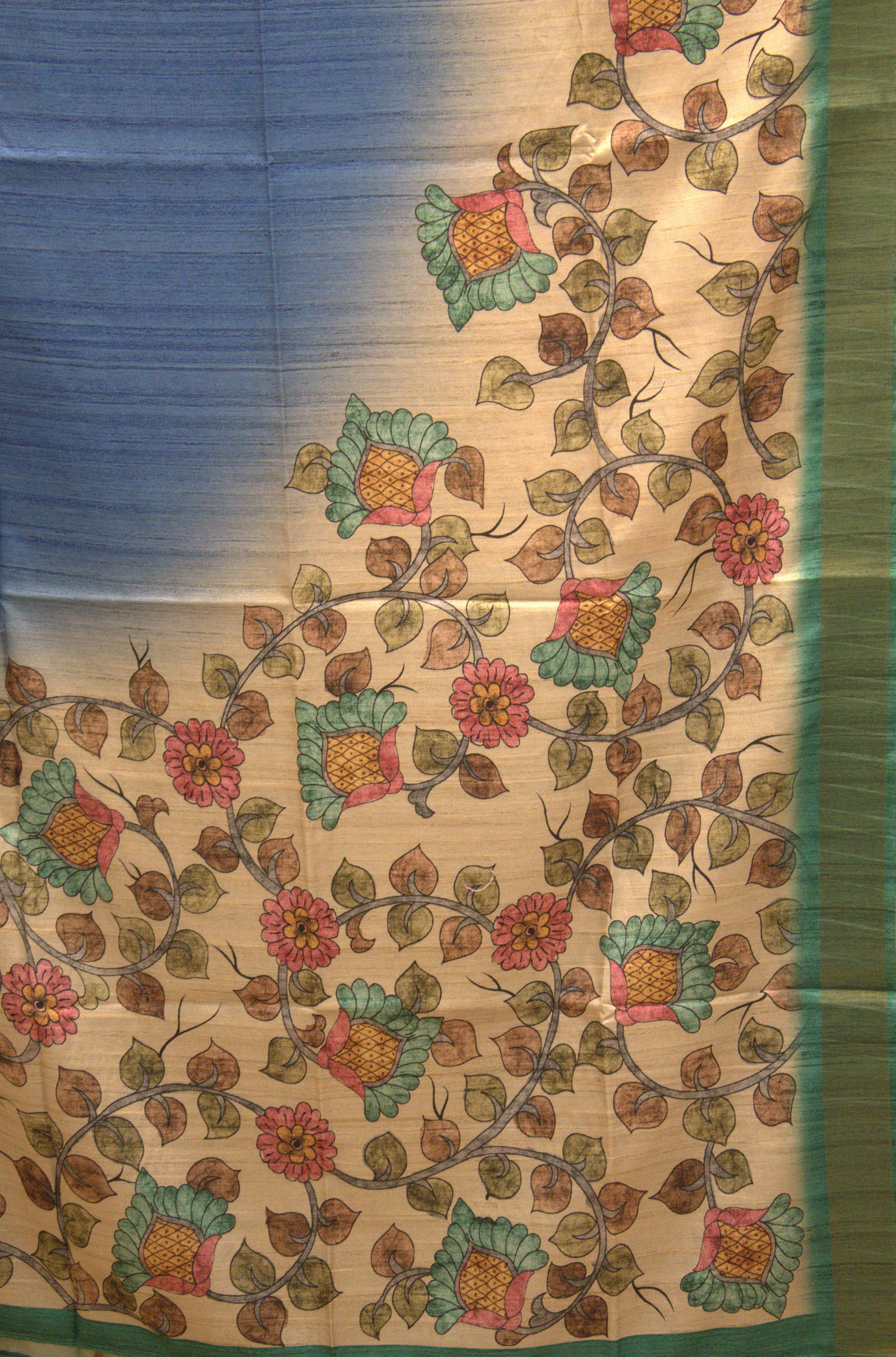 Semi Tussar Saree Kalamkari Print -Blue Green