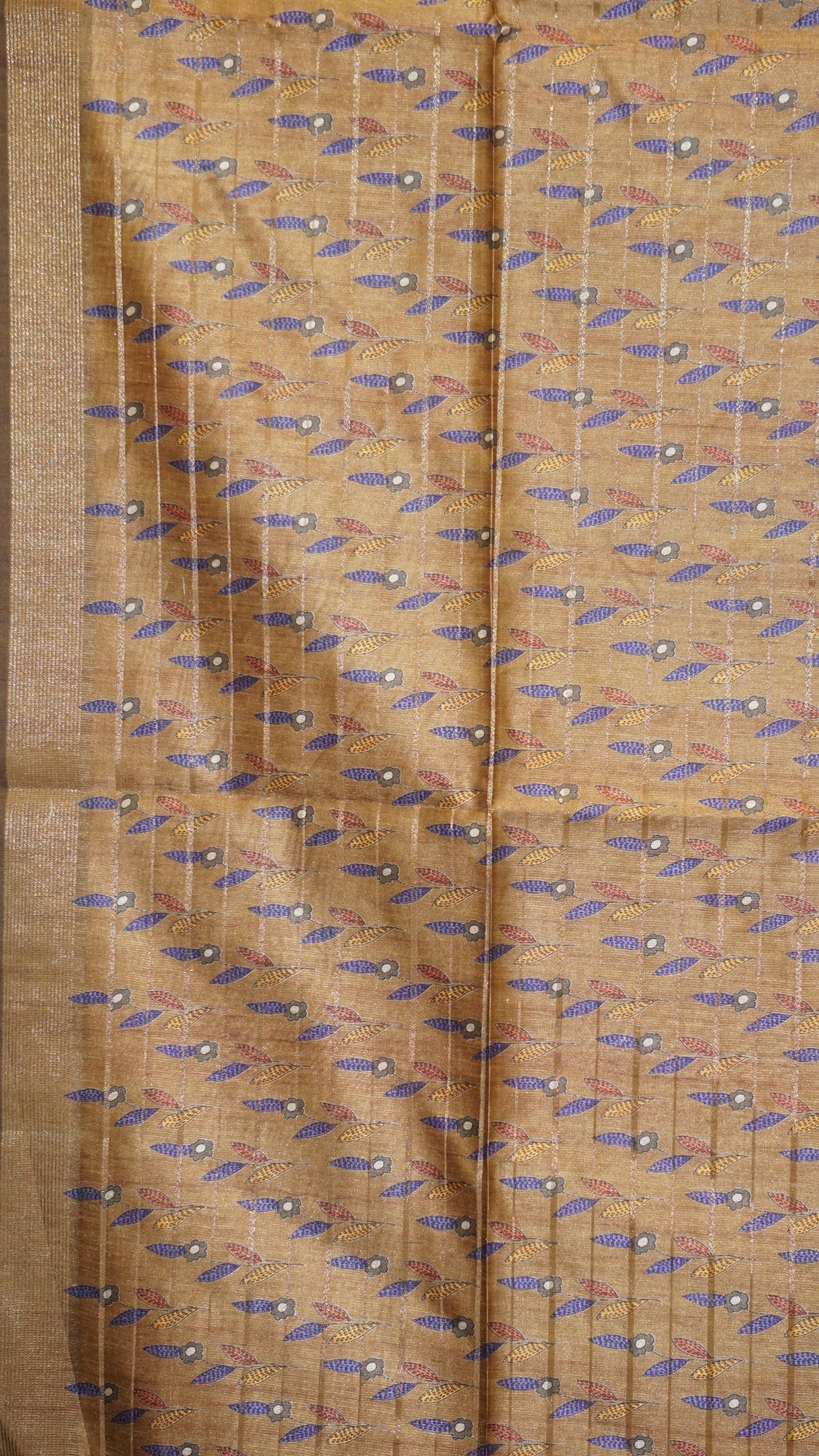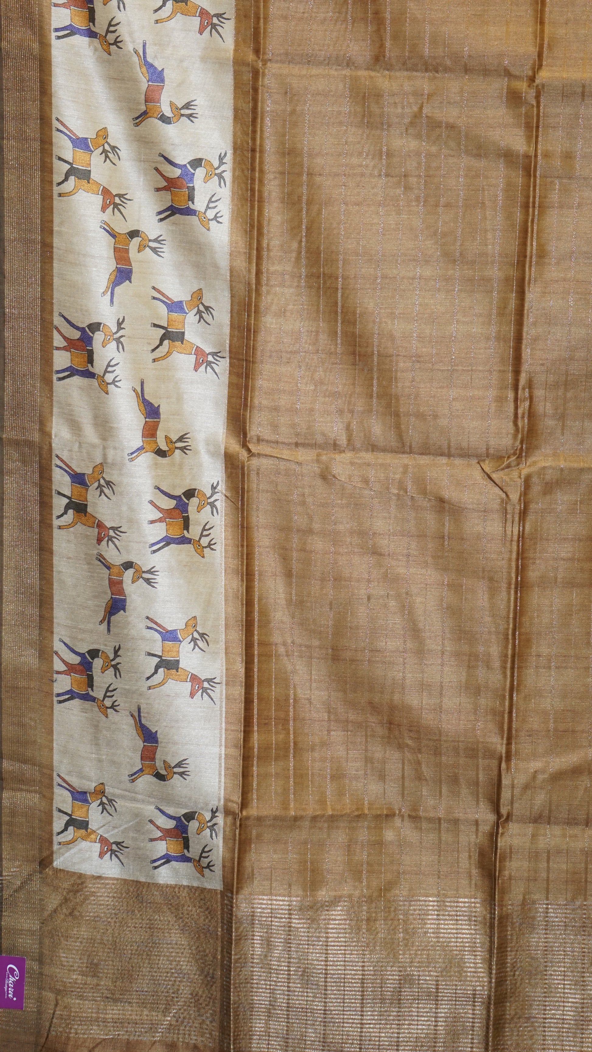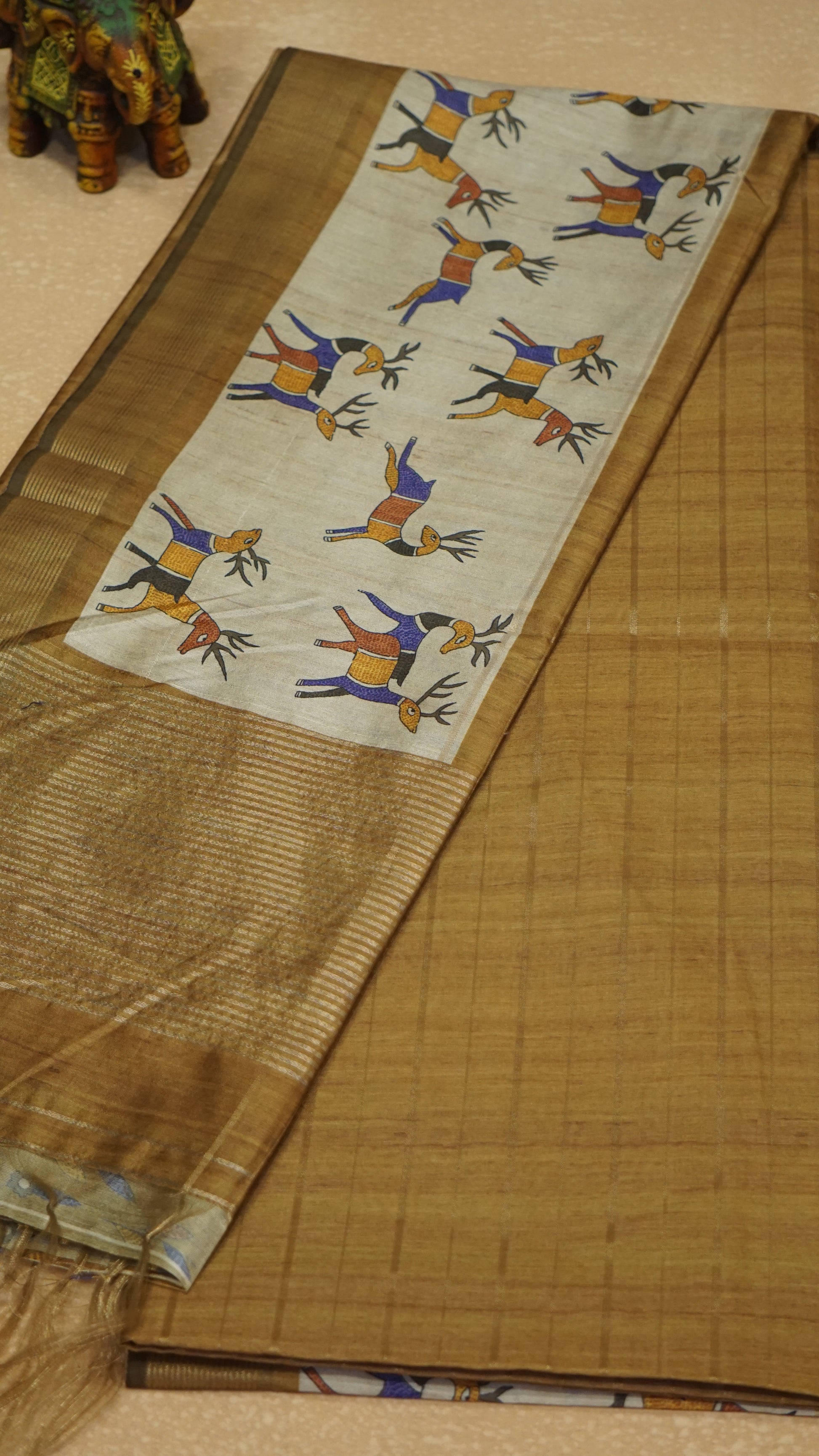 Semi Tussar Saree With Deer Border - Golden