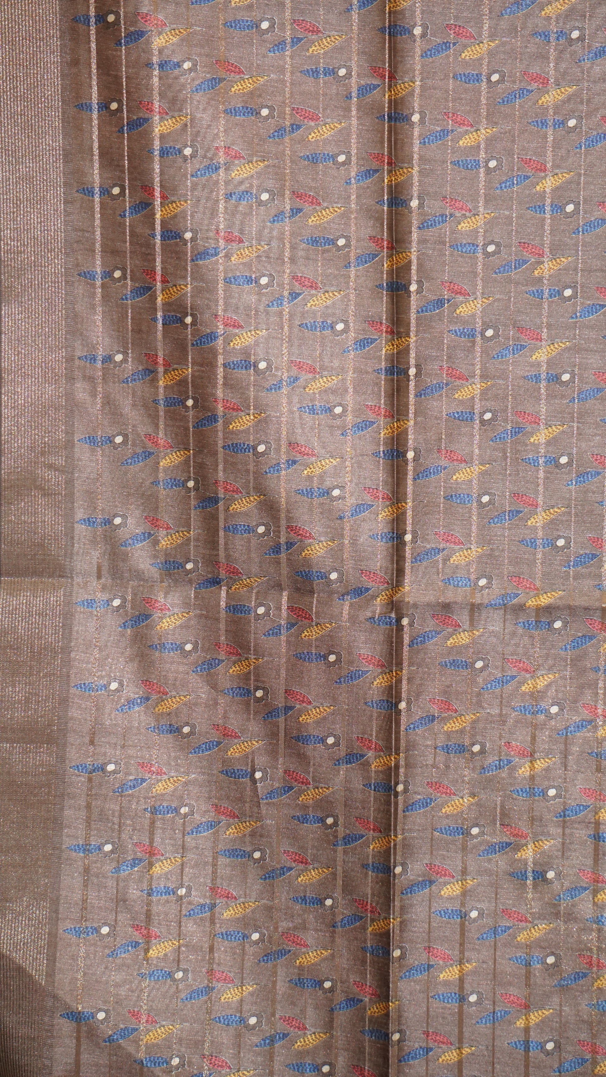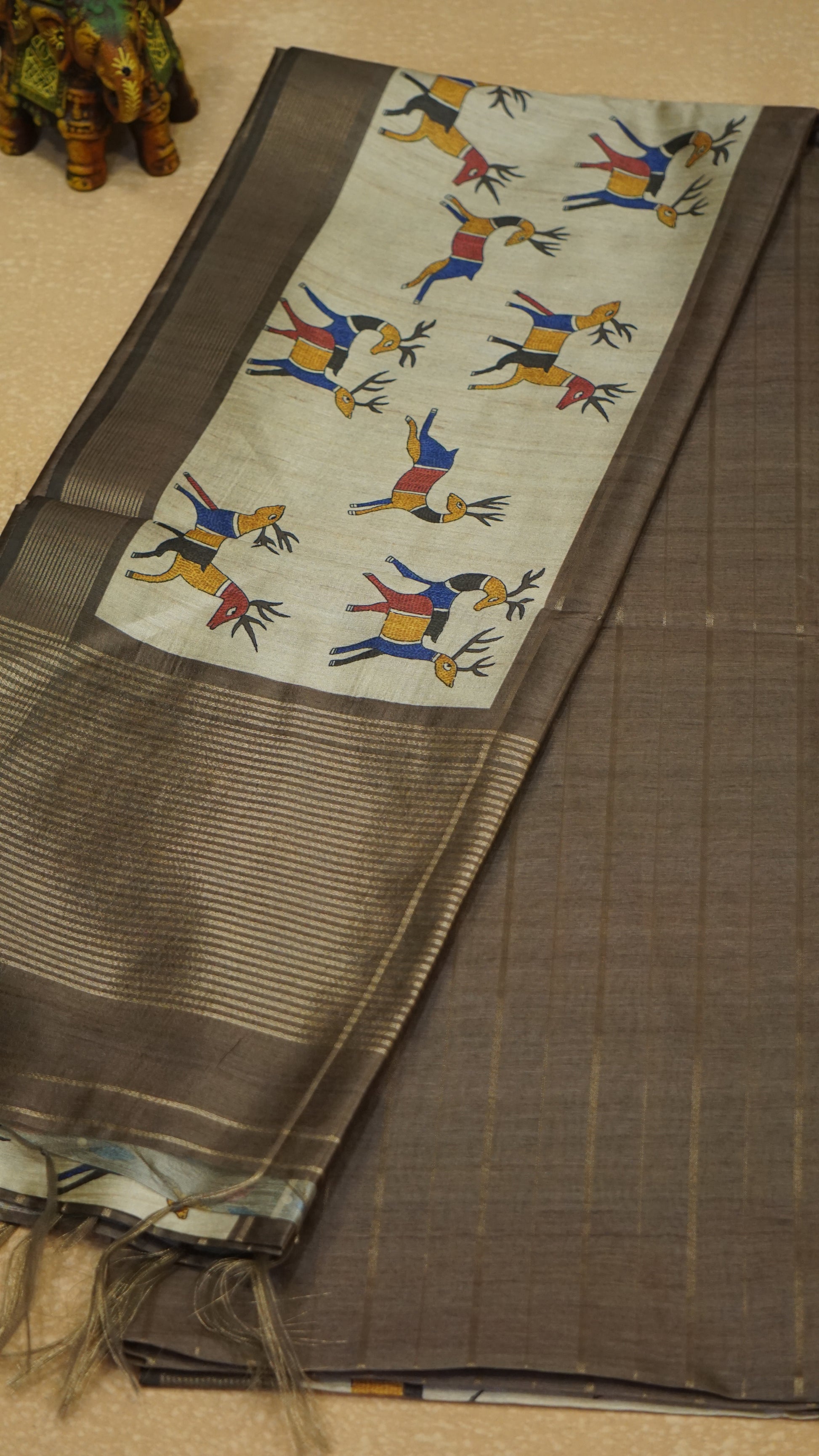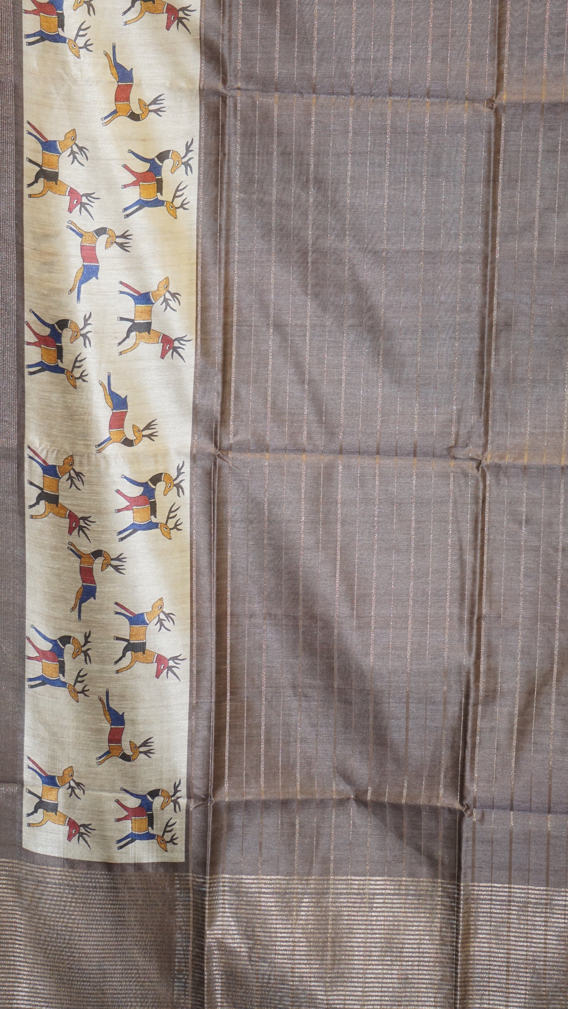 Semi Tussar Saree With Deer Border - Metallic Grey