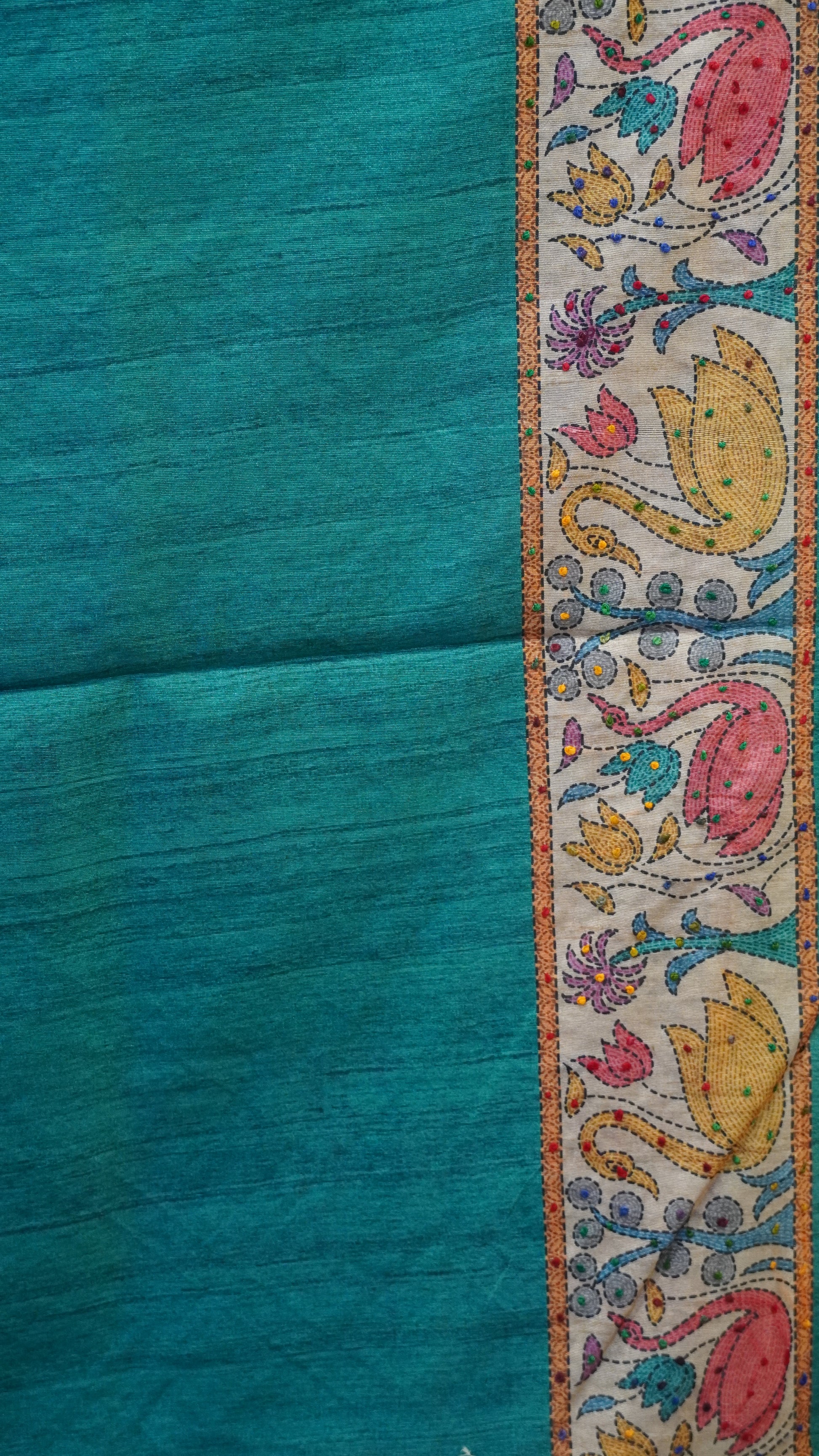 Semi Tussar Saree With French Knot & Kantha Work - Blue