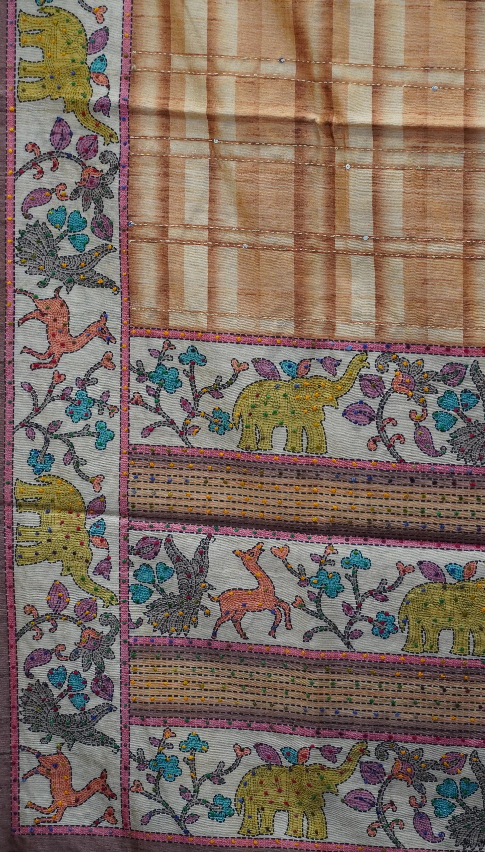 Semi Tussar Saree With French Knot & Kantha Work Checked Pattern - Brown