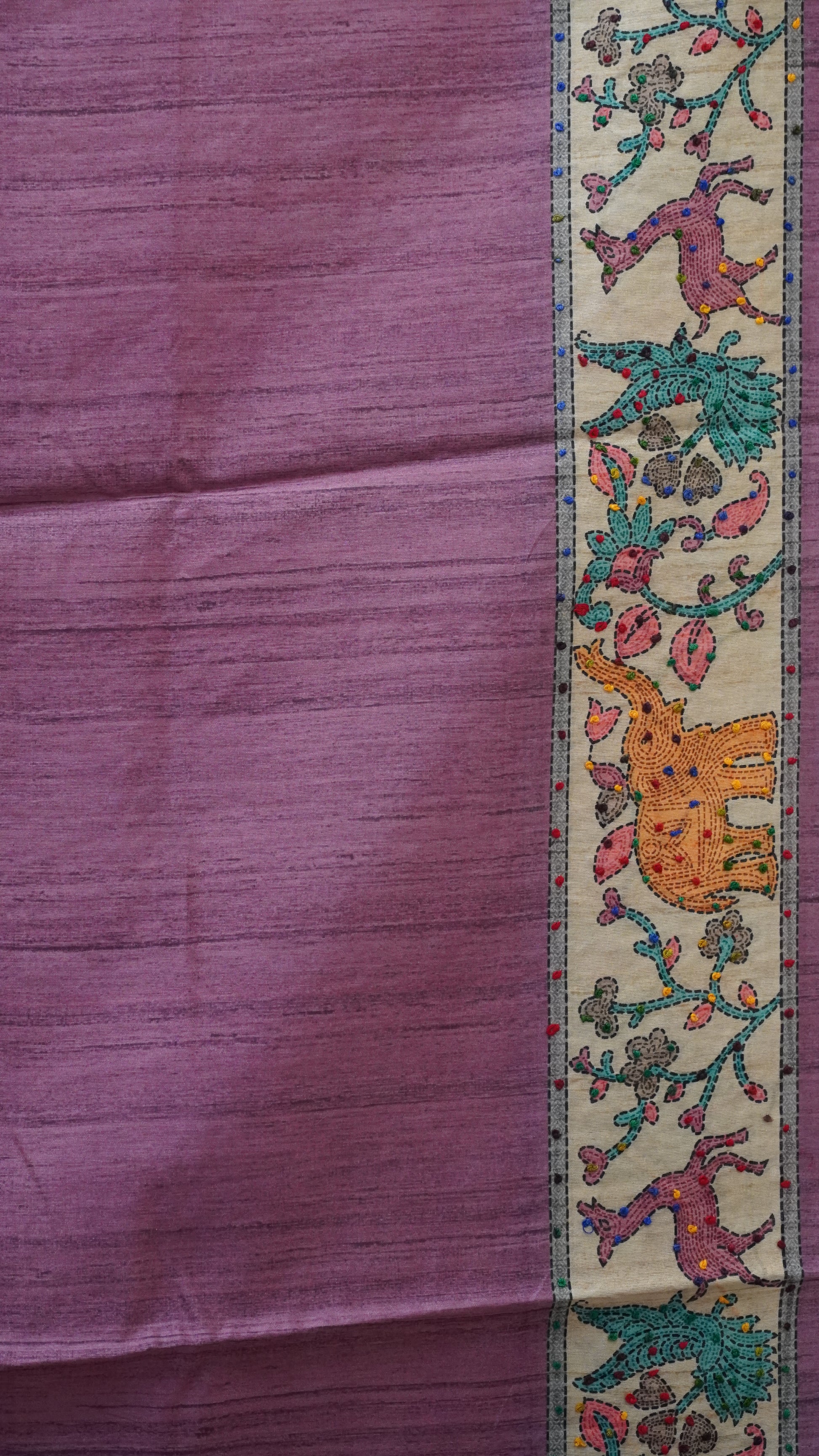 Semi Tussar Saree With French Knot & Kantha Work Checked Pattern - Peach