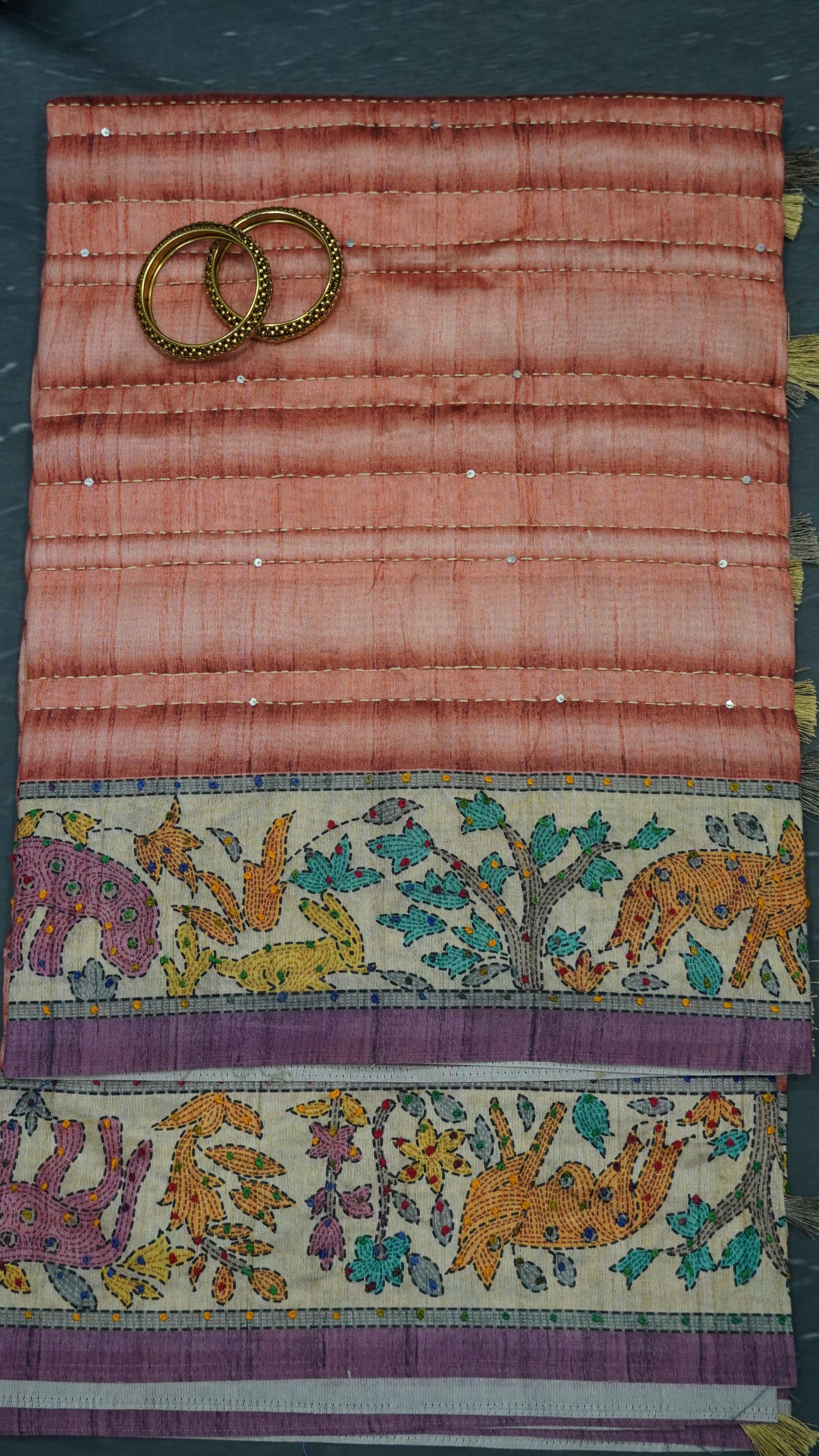 Semi Tussar Saree With French Knot & Kantha Work - Peach