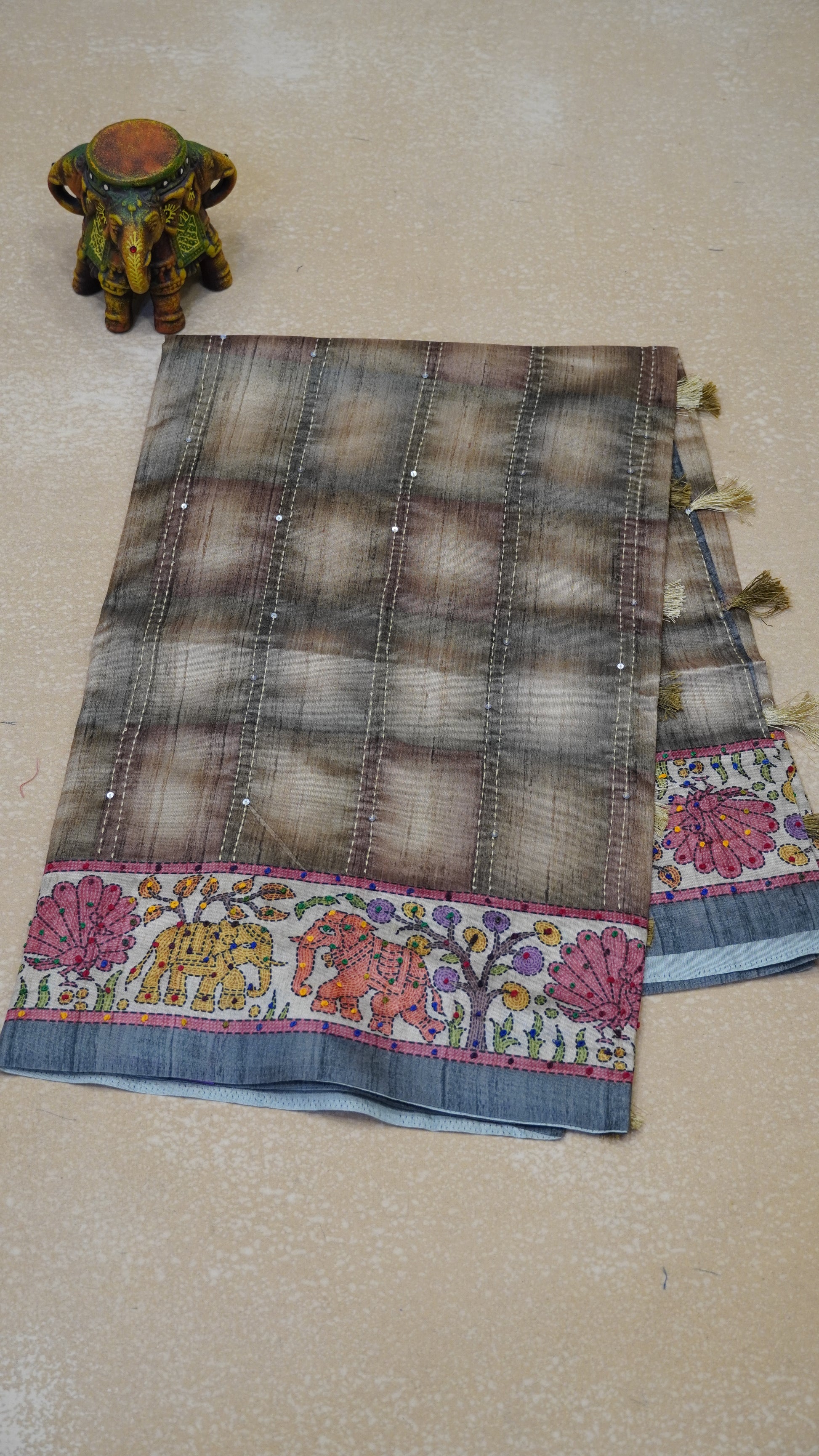 Semi Tussar Saree With French Knot & Kantha Work Straight Checkered Pattern - Grey