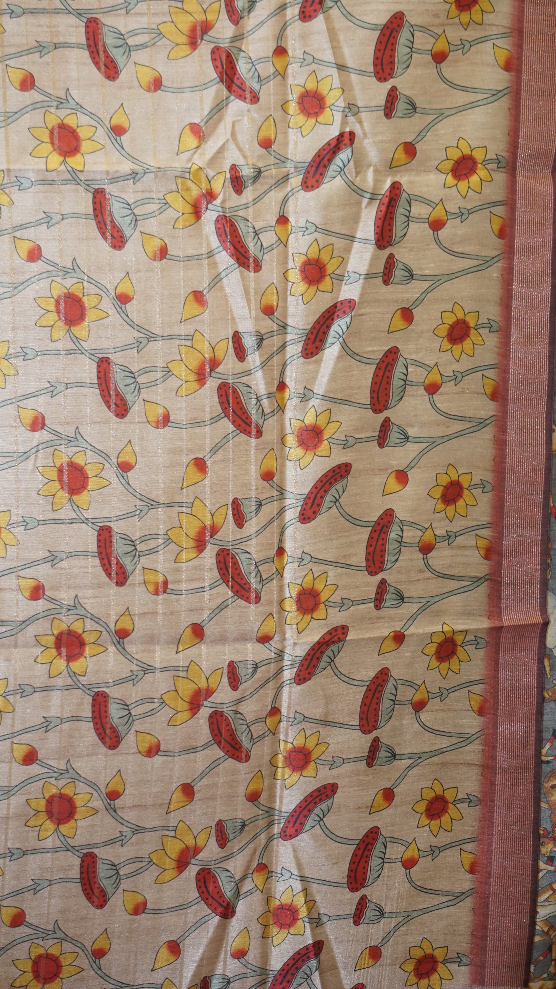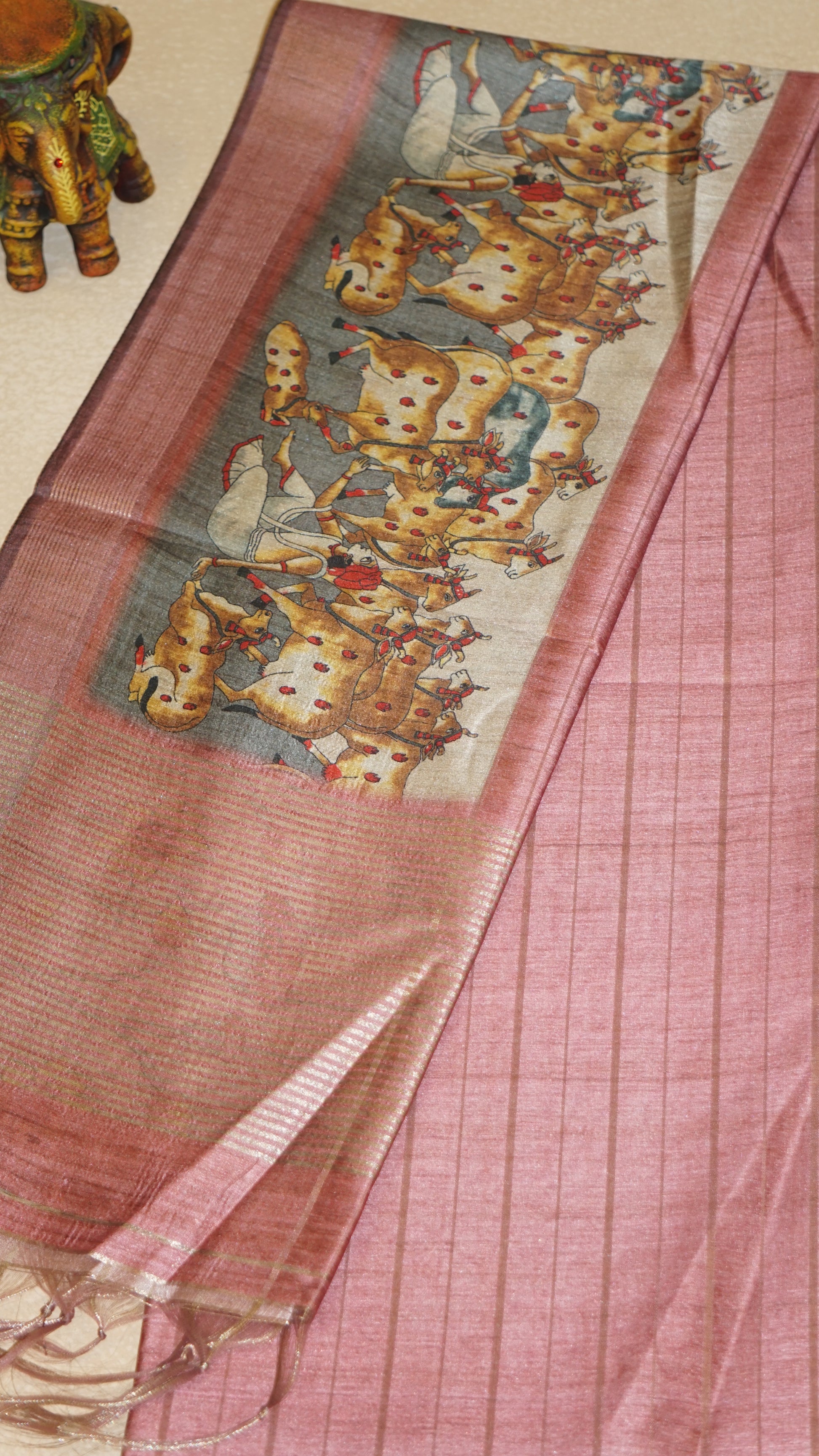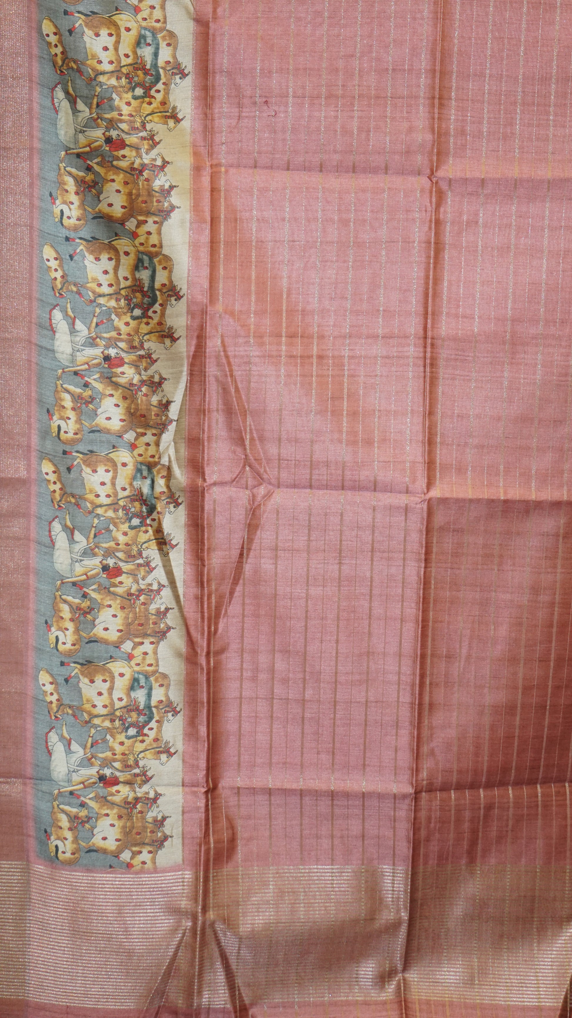 Semi Tussar Saree With Pichwai Border - Rust Red