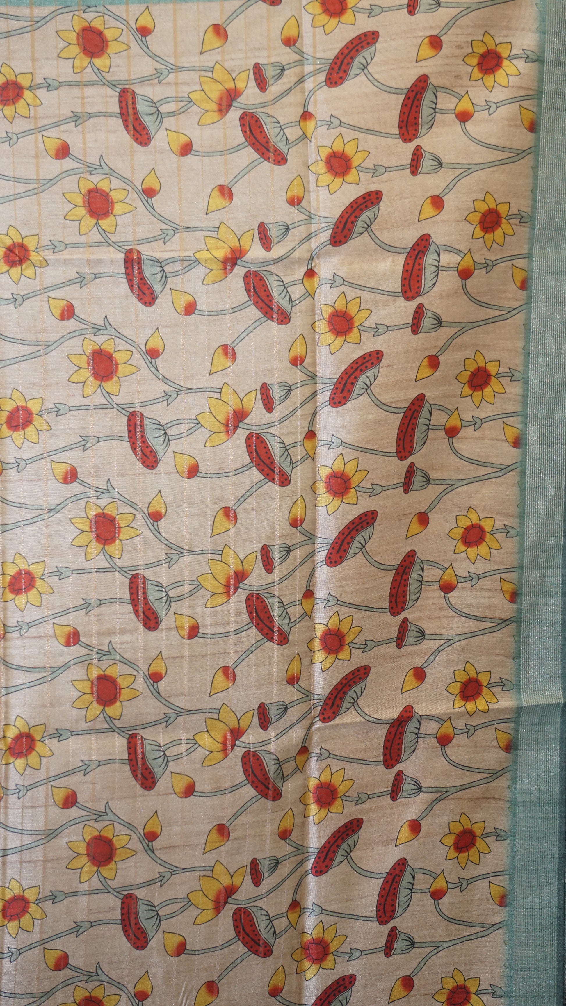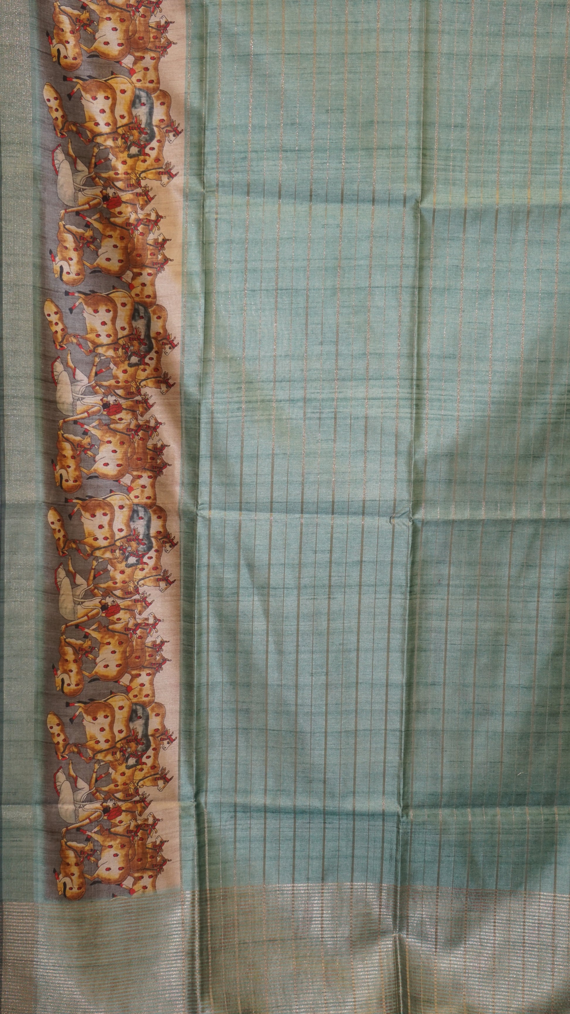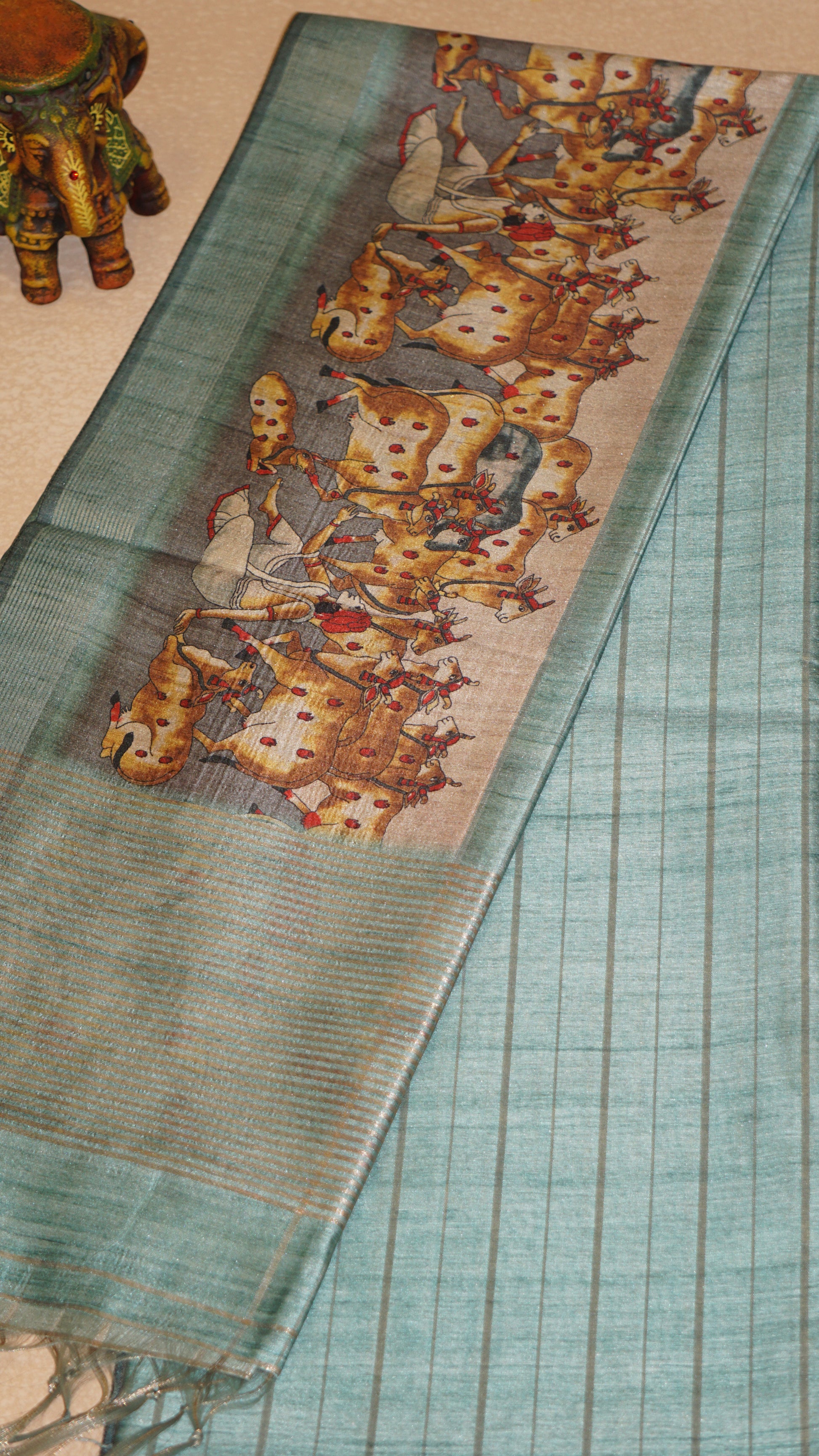 Semi Tussar Saree With Pichwai Border - Sea Green