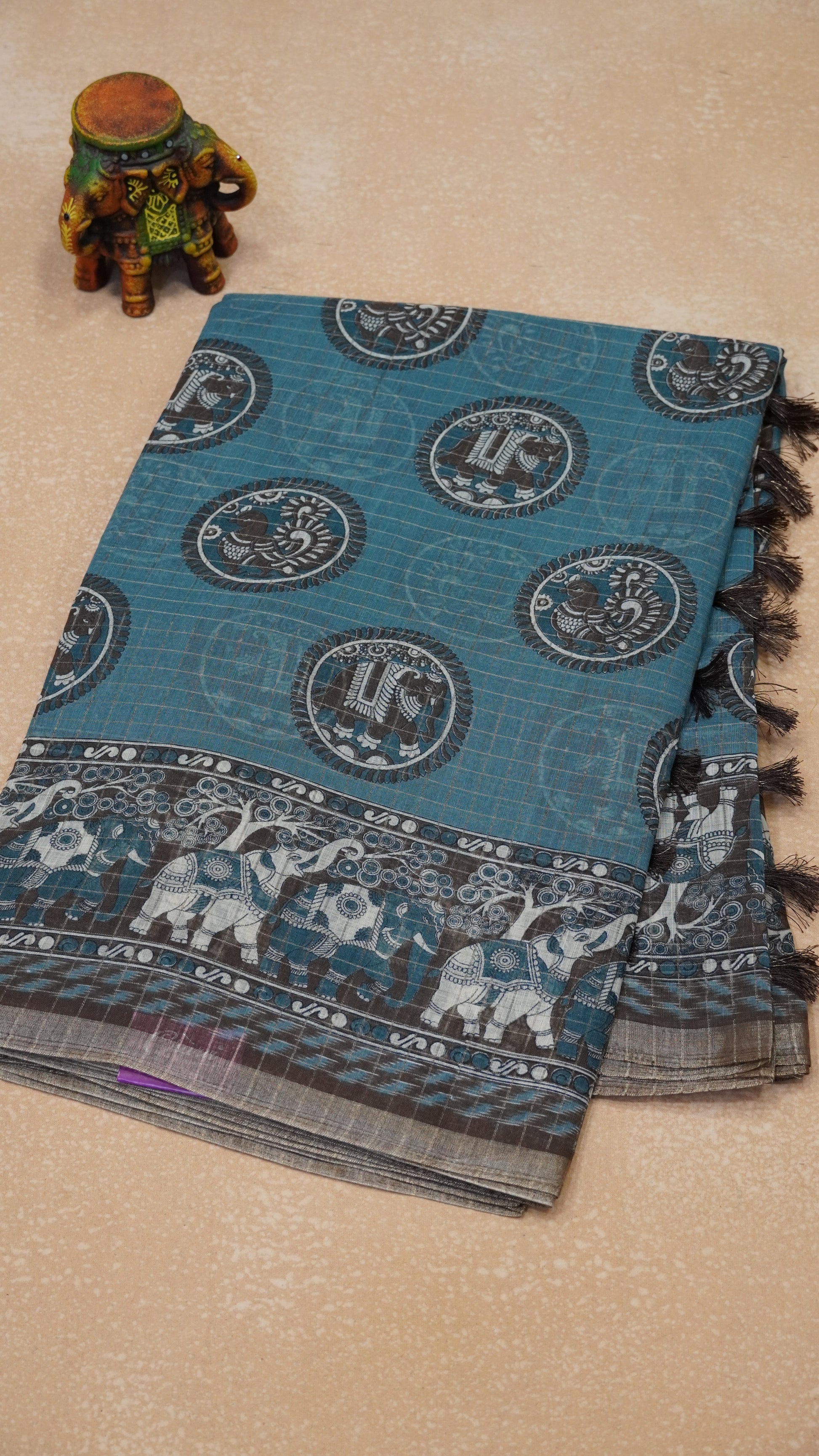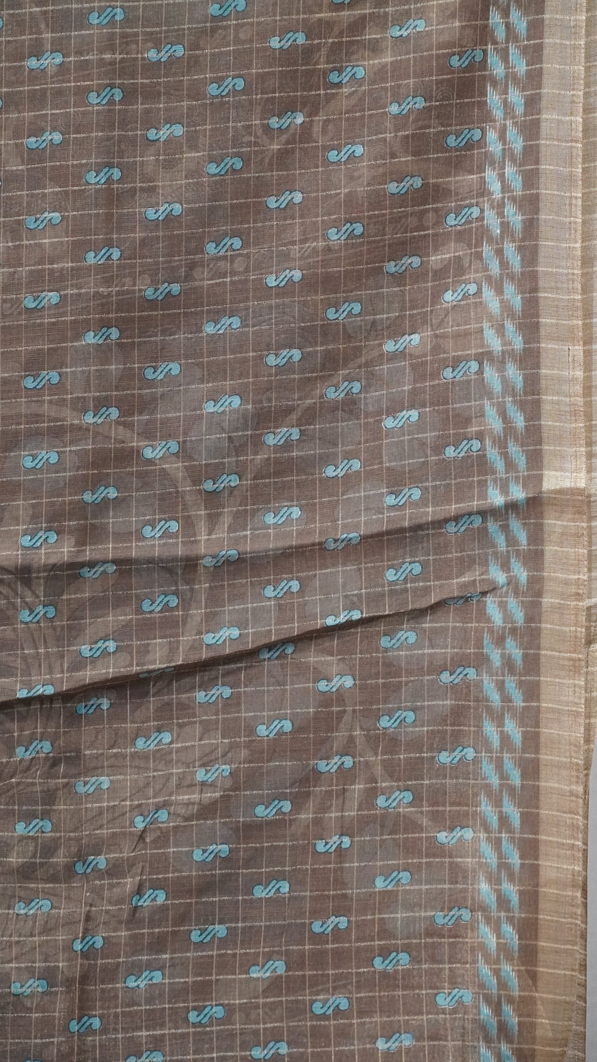 Semi Tussar Saree With Zari Checks And Figure Prints - Sea Green