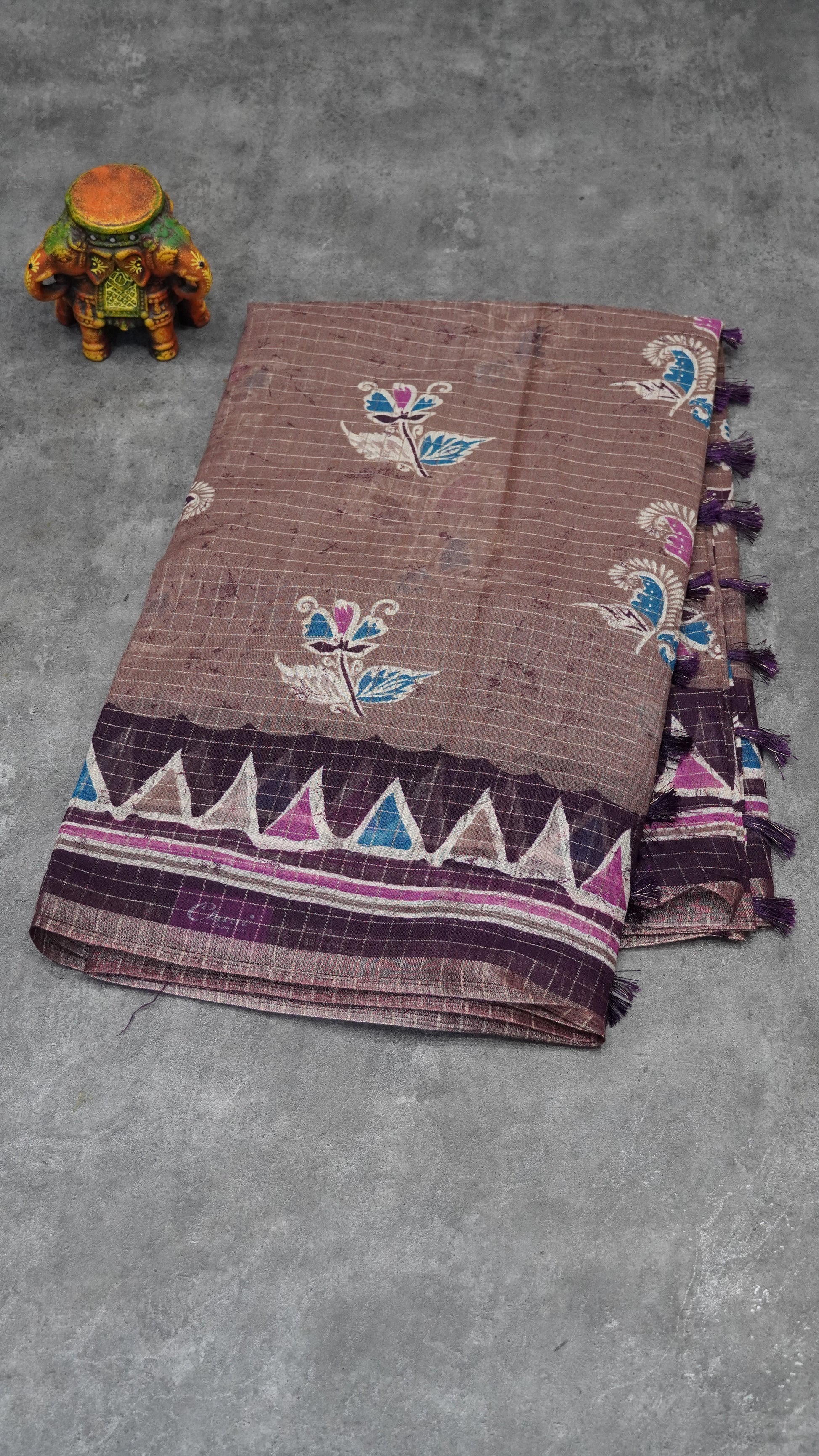 Semi Tussar Saree With Zari Checks - Chocolate Brown
