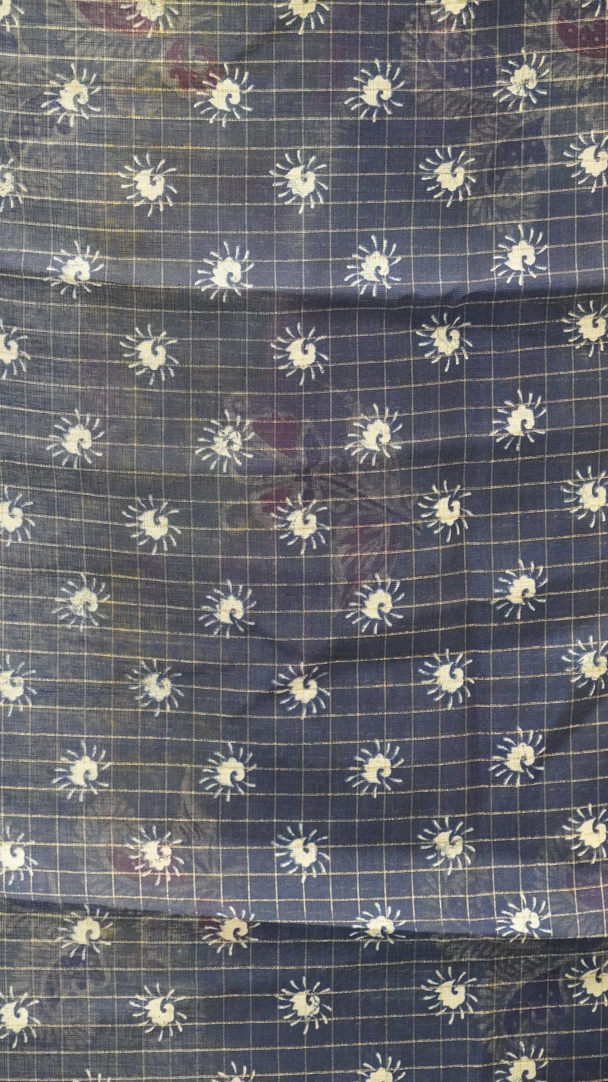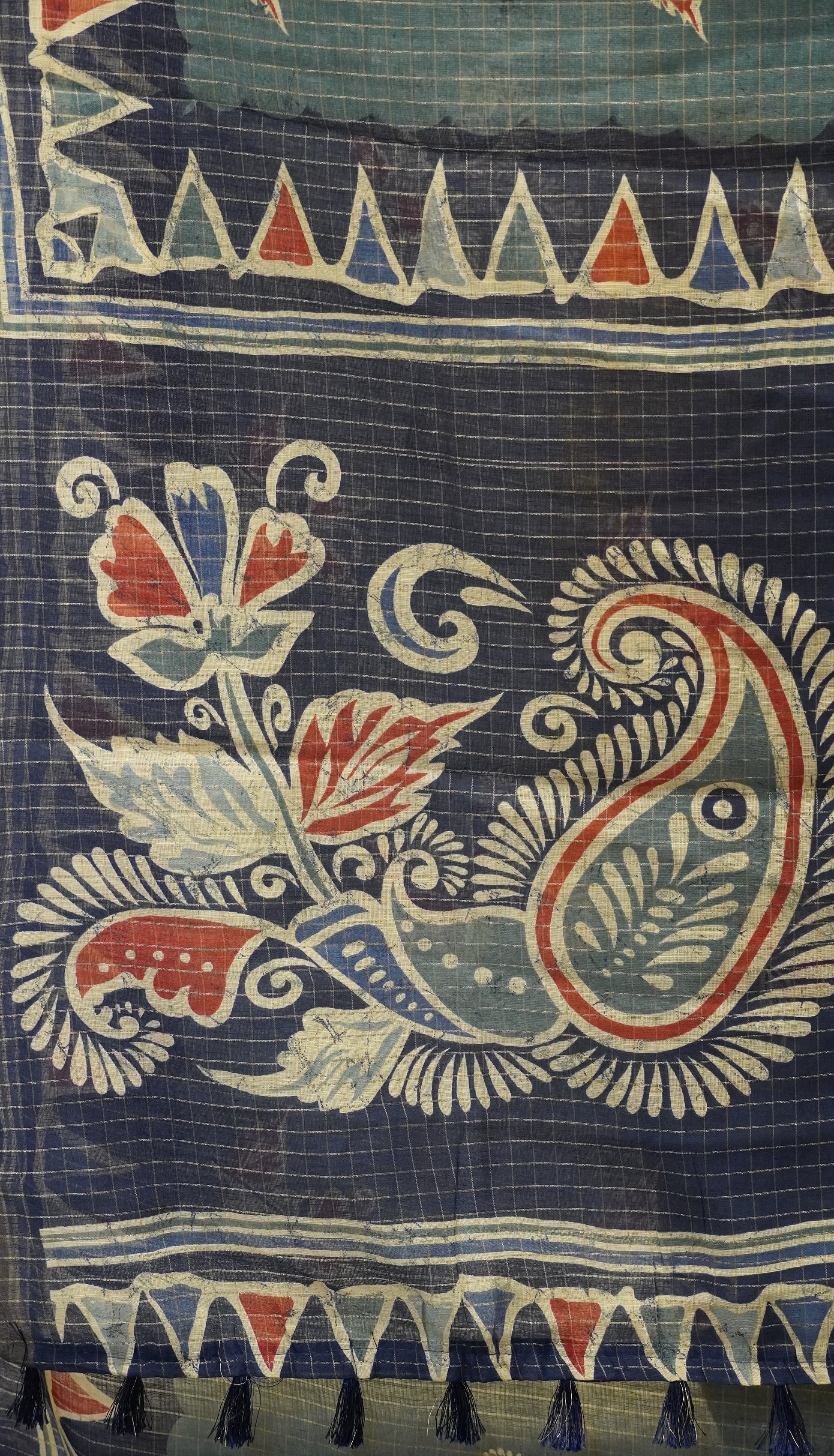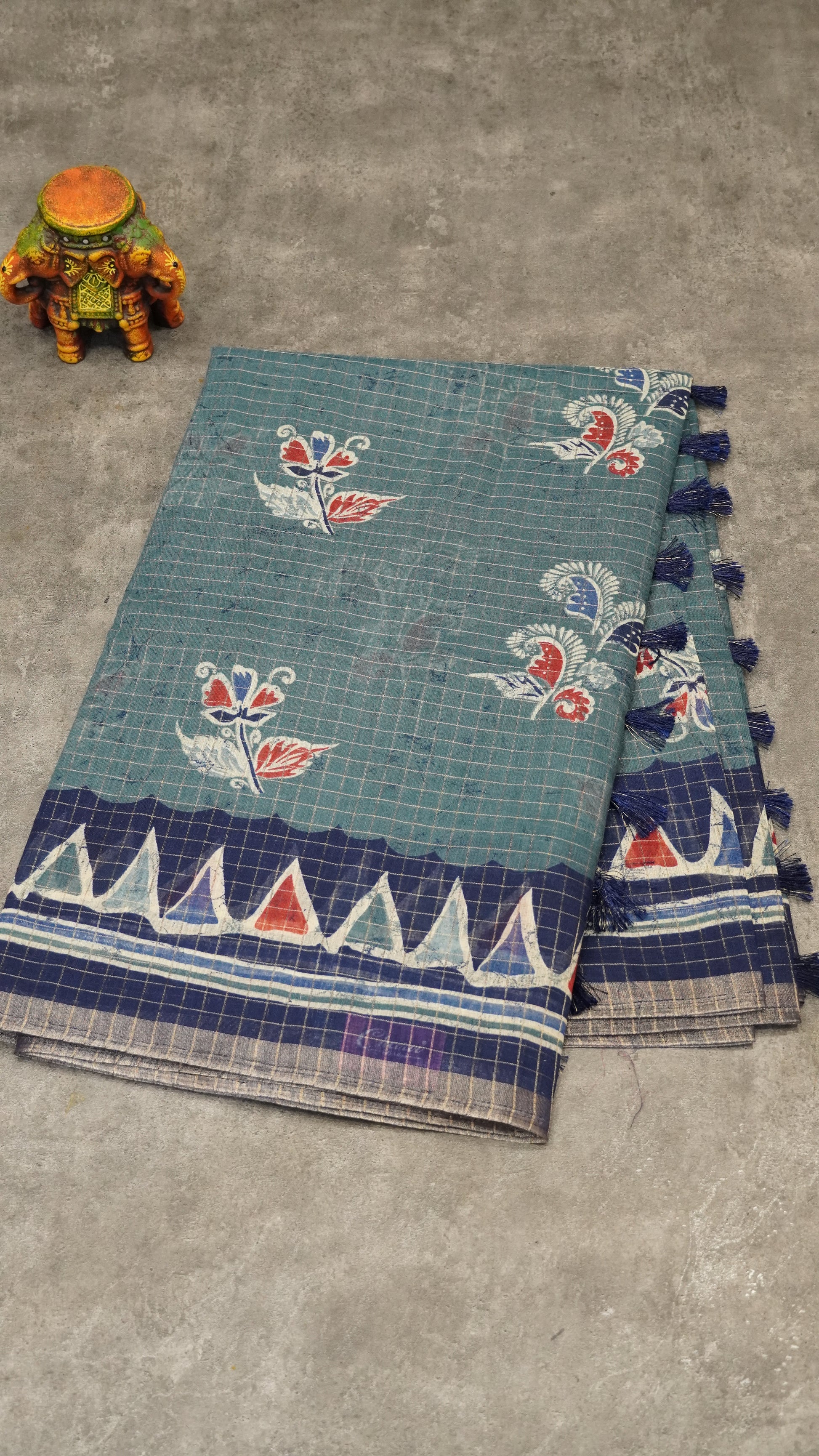 Semi Tussar Saree With Zari Checks - Greyish Blue