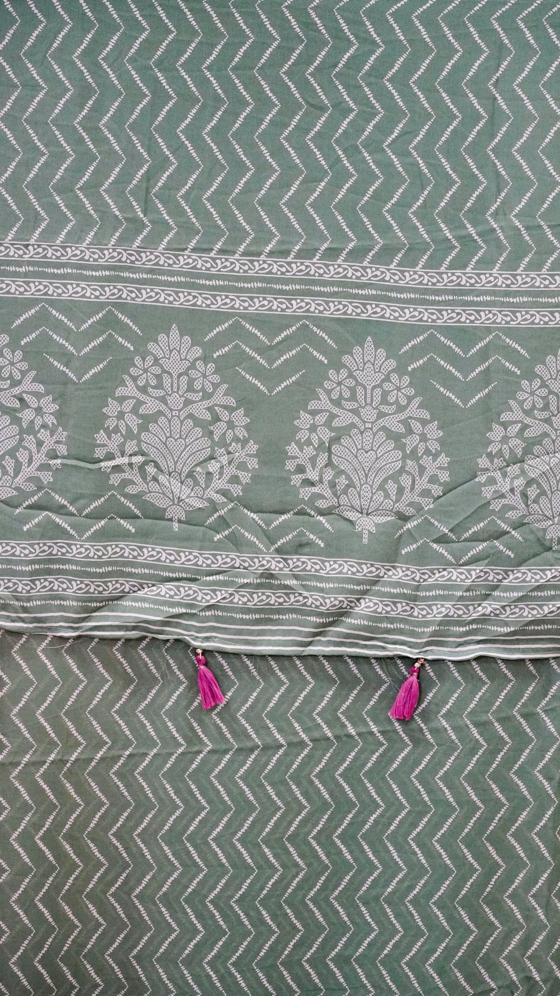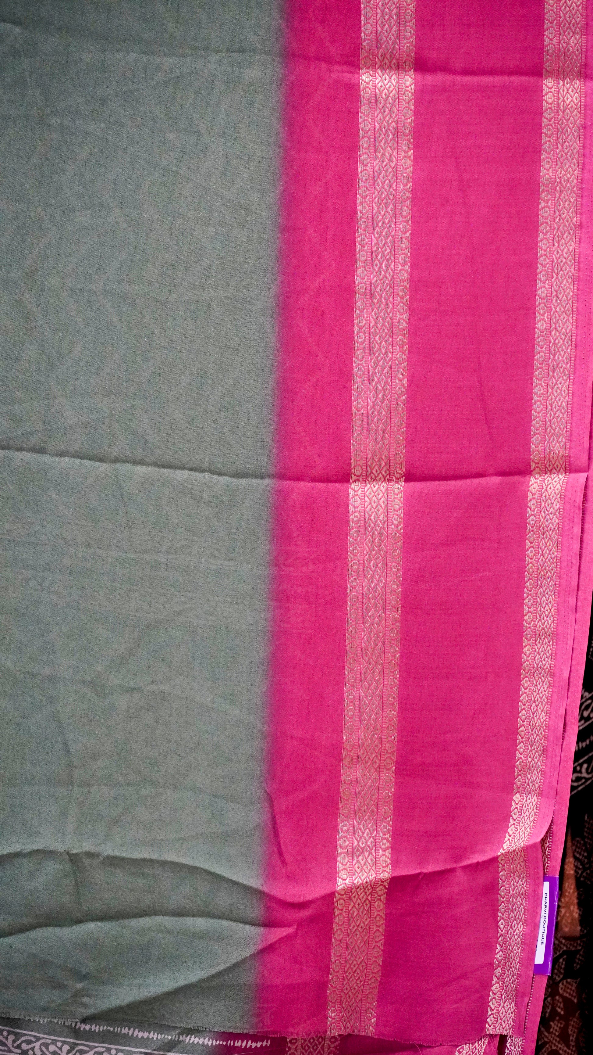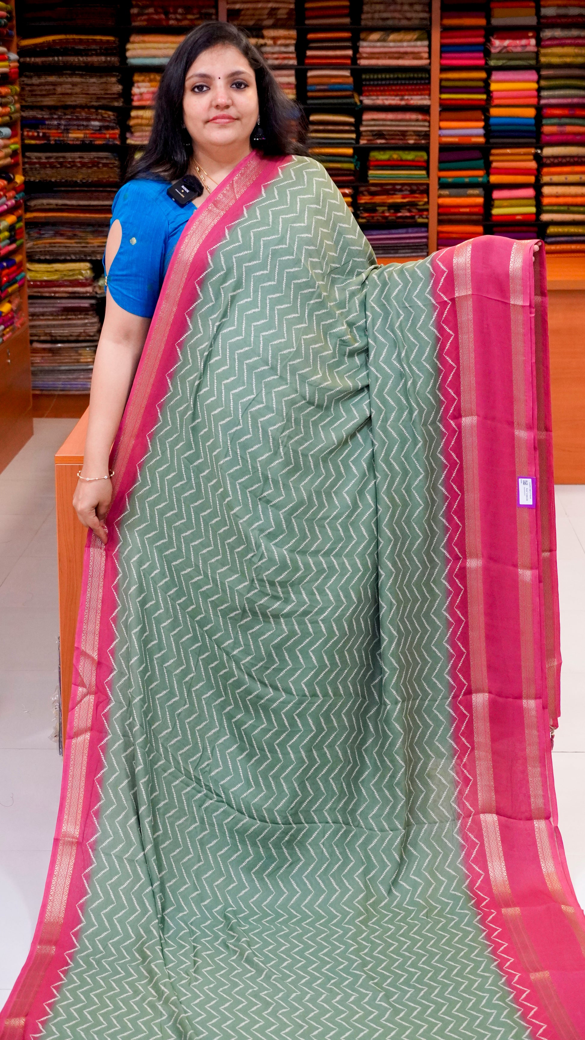 Shiffon Saree Arrow Print With Gap Zari Border Light Green To Pink