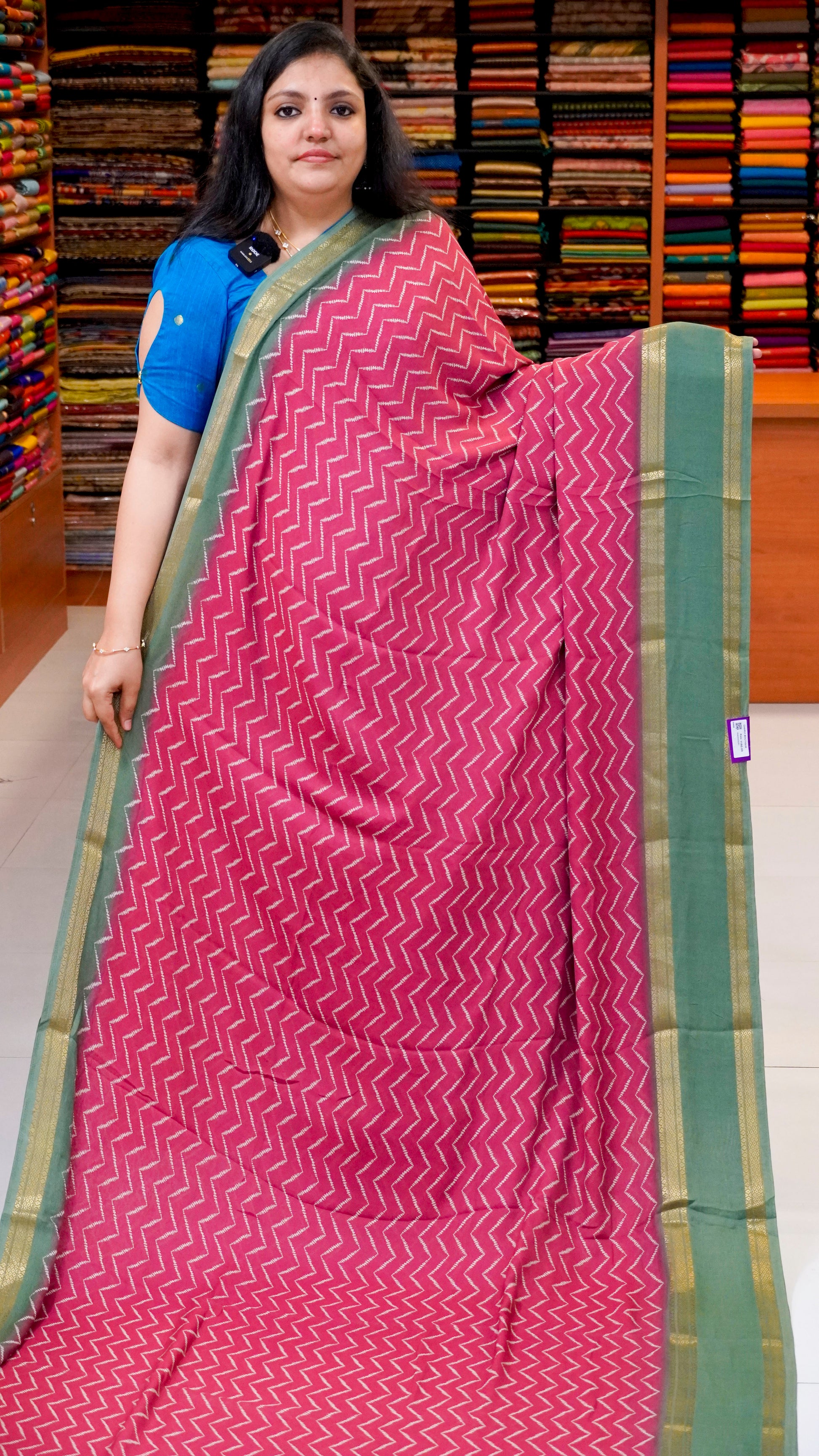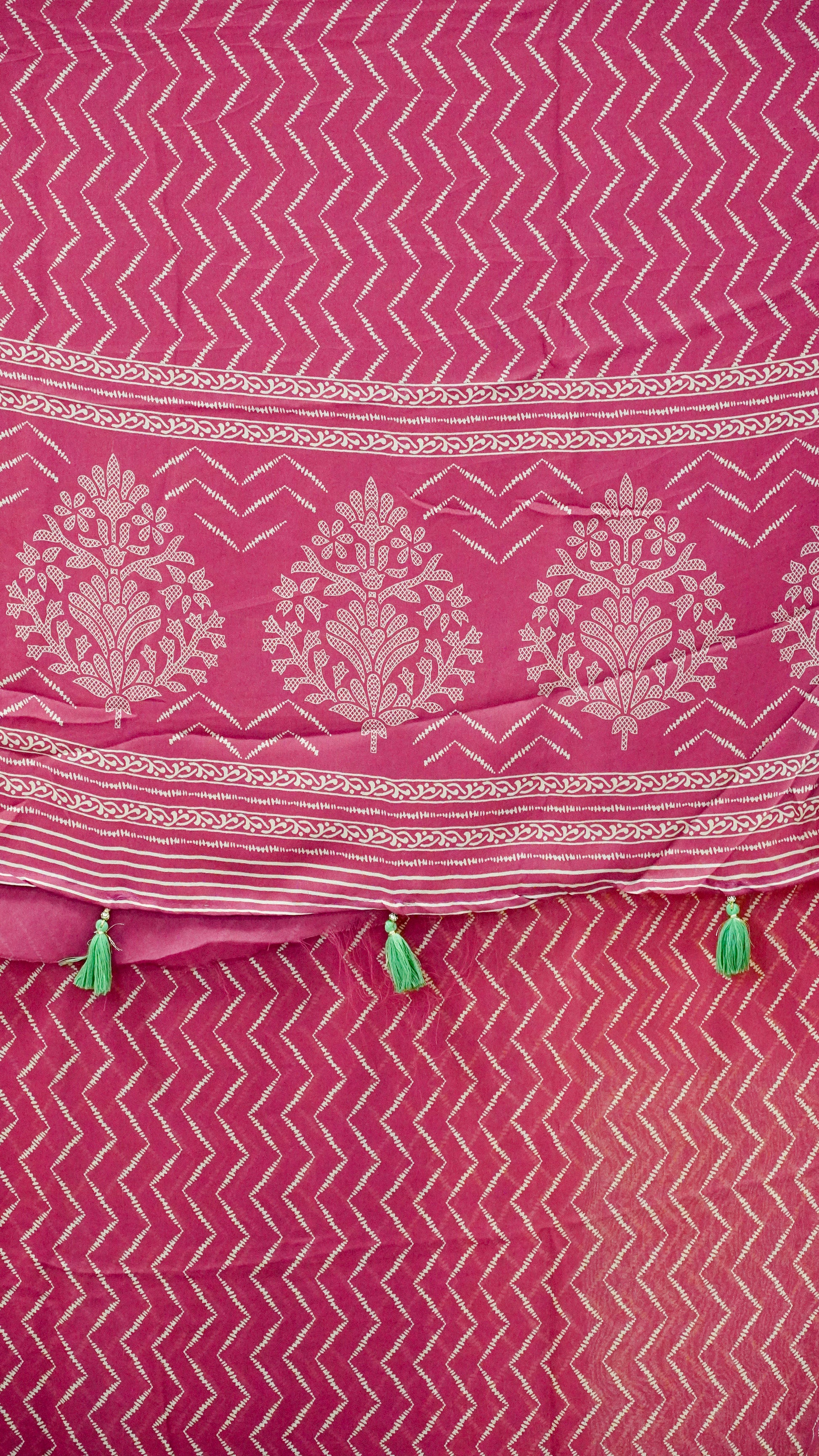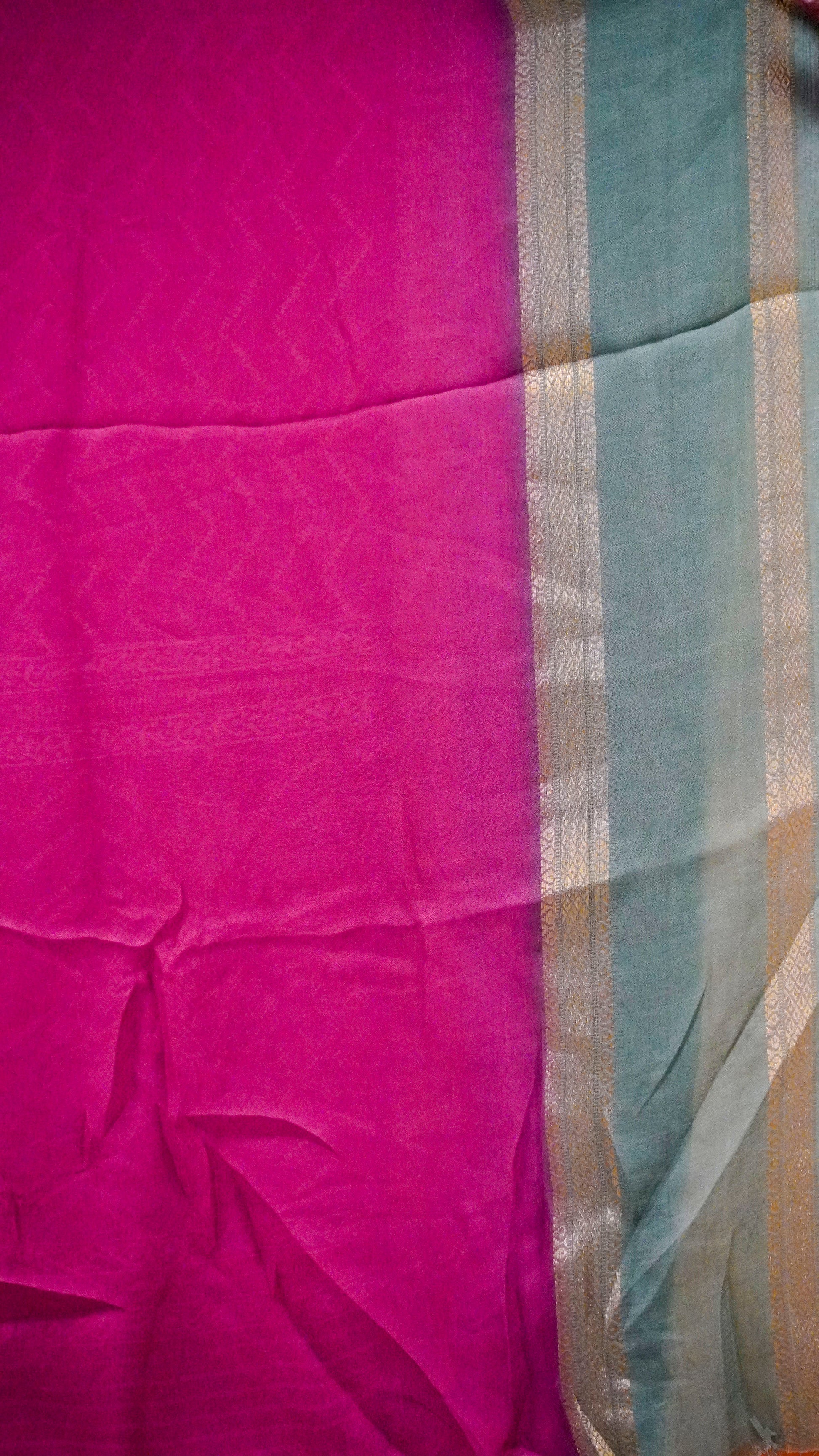 Shiffon Saree Arrow Print With Gap Zari Border Pink to Green