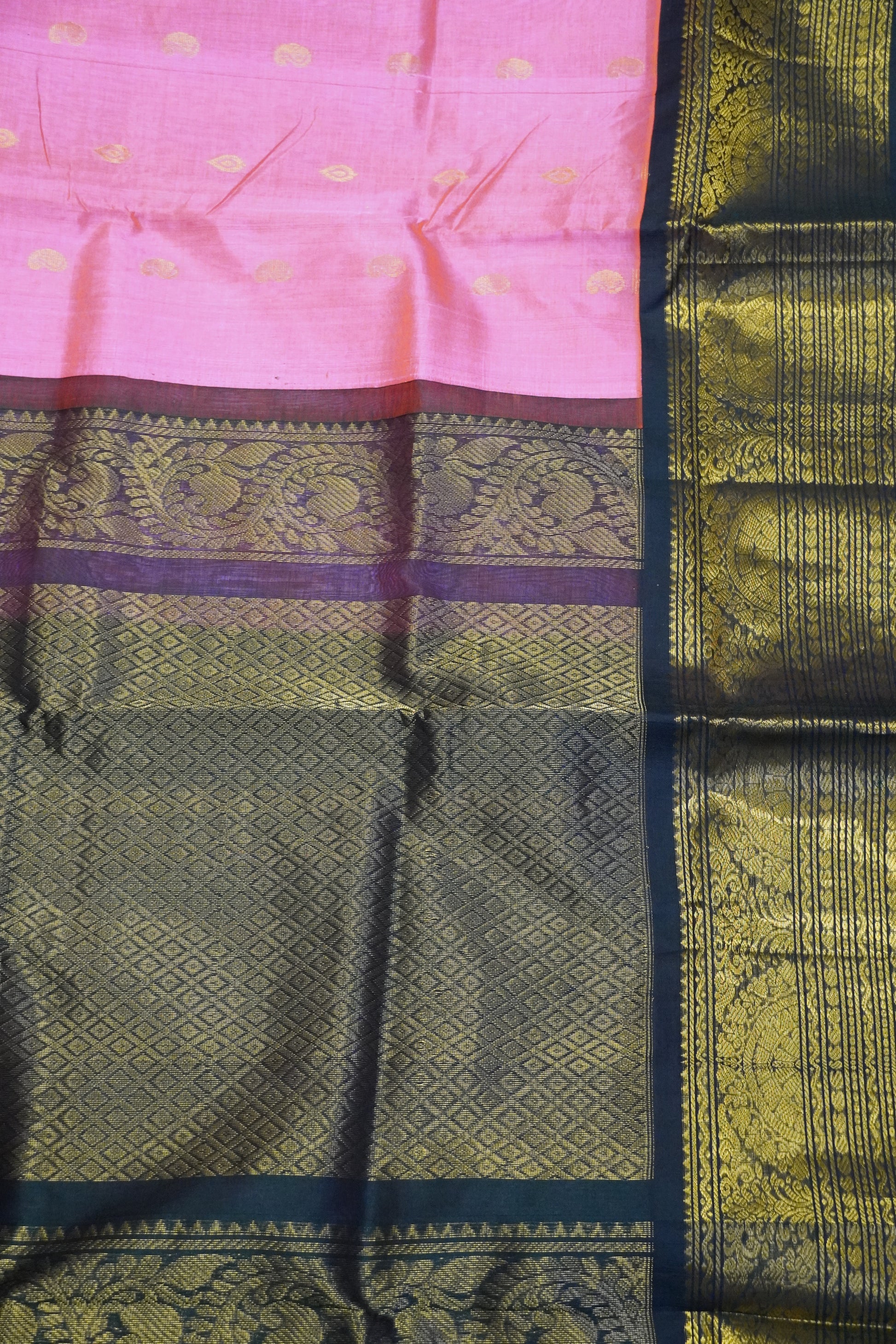 Silk Cotton Saree - Bud Buta Pink - Bottle Green